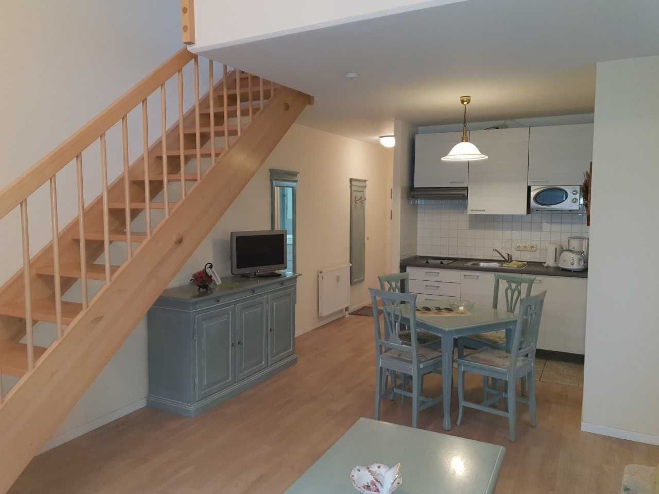 Die Wohnung Nr. 13 ist eine schöne Maisonette-Zweiraum-Wohnung mit Terrasse zur Südseite. Sie ist ca. 44 qm groß. Der Preis für die Ferienwohnung Nr.13 beinhaltet freies W-LAN, Wäsche für 2 Personen und Endreinigung. Eine tägliche Reinigung und Frühstück können Sie dazu buchen.