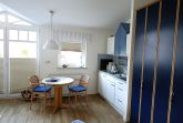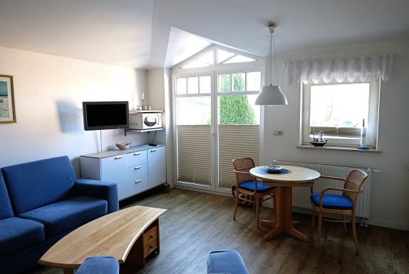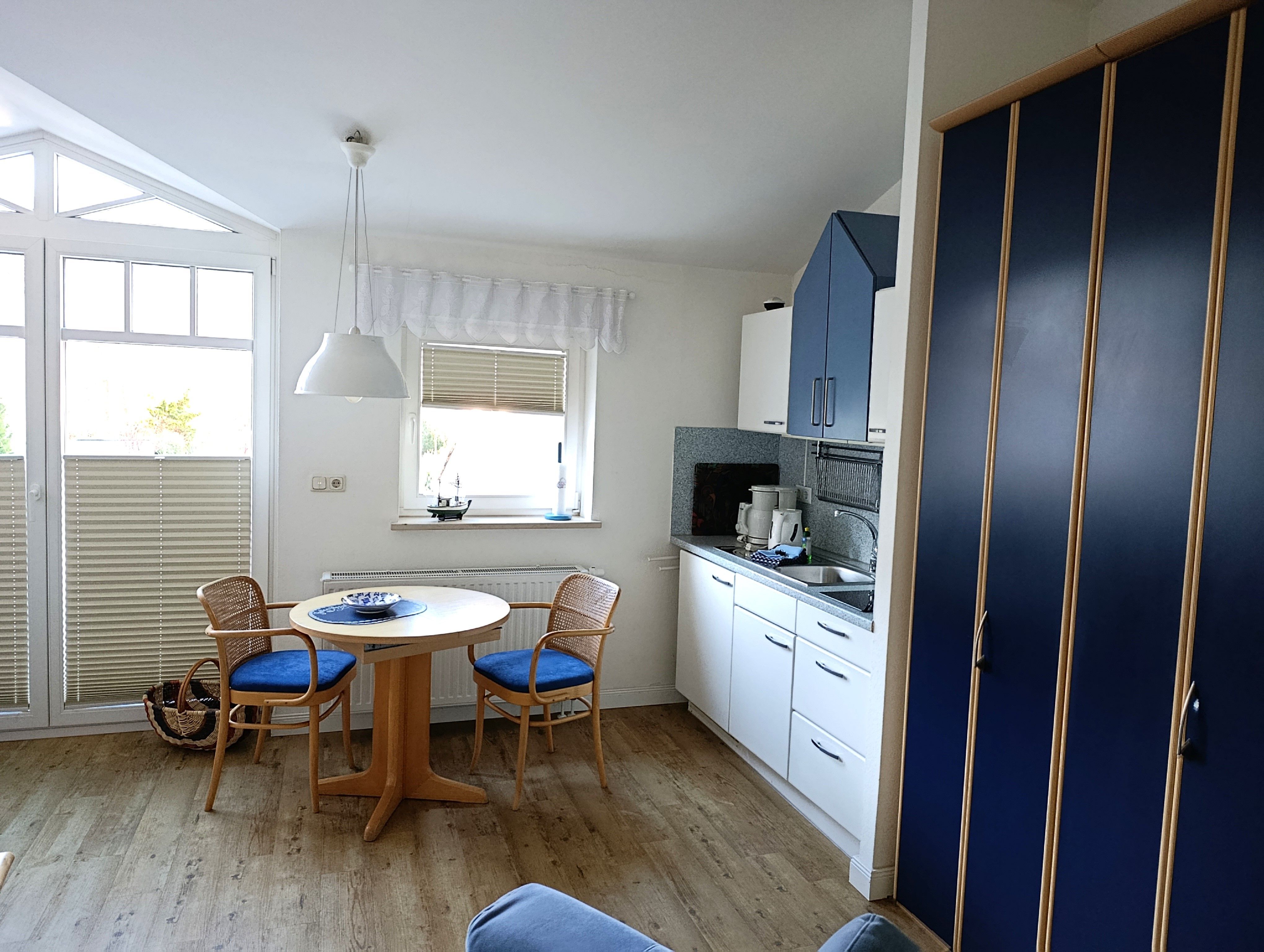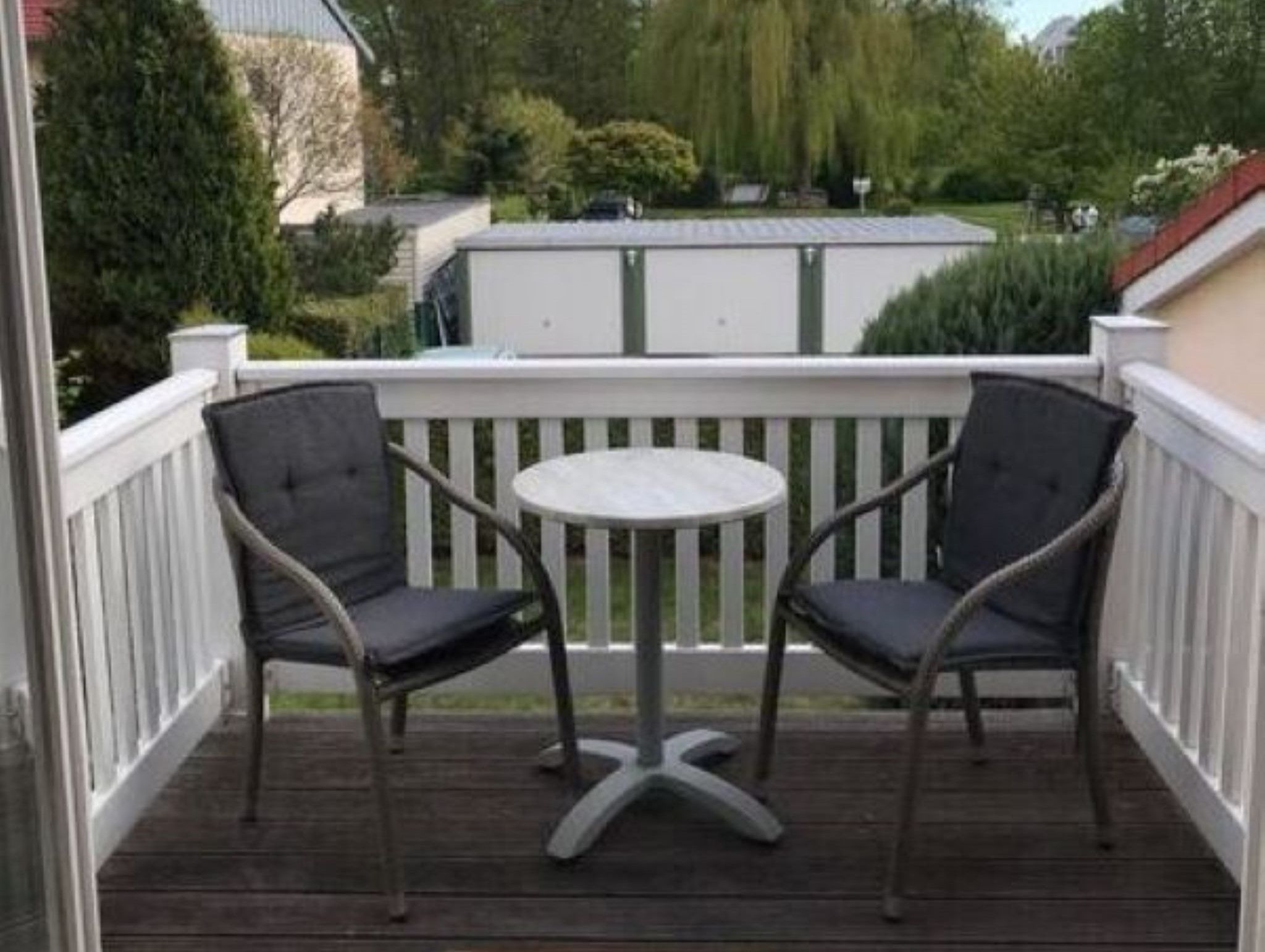 Nur 150 m vom Strand wohnen Sie in einer 2-Raum-Ferienwohnung. Die 39 qm große Wohnung liegt in der ersten Etage. Das Wohnzimmer ist mit einer Couch, Couchtisch, Sessel, Anrichte, mit Kabel-TV (Flachbildschirm), Radio, Essbereich (Tisch und Stühle) und Küchenzeile ausgestattet. Der Balkon mit Tisch und Stühle geht zur Südseite. Im Schlafzimmer stehen ein Doppelbett und eine kleine Anrichte. Die Küchenzeile wurde ausgestattet mit Mikrowelle, Kühlschrank, Kaffeemaschine, Zwei-Platten-Kochfeld, Toaster und Wasserkocher. Das Bad mit Dusche und WC komplettiert die Wohnung.