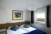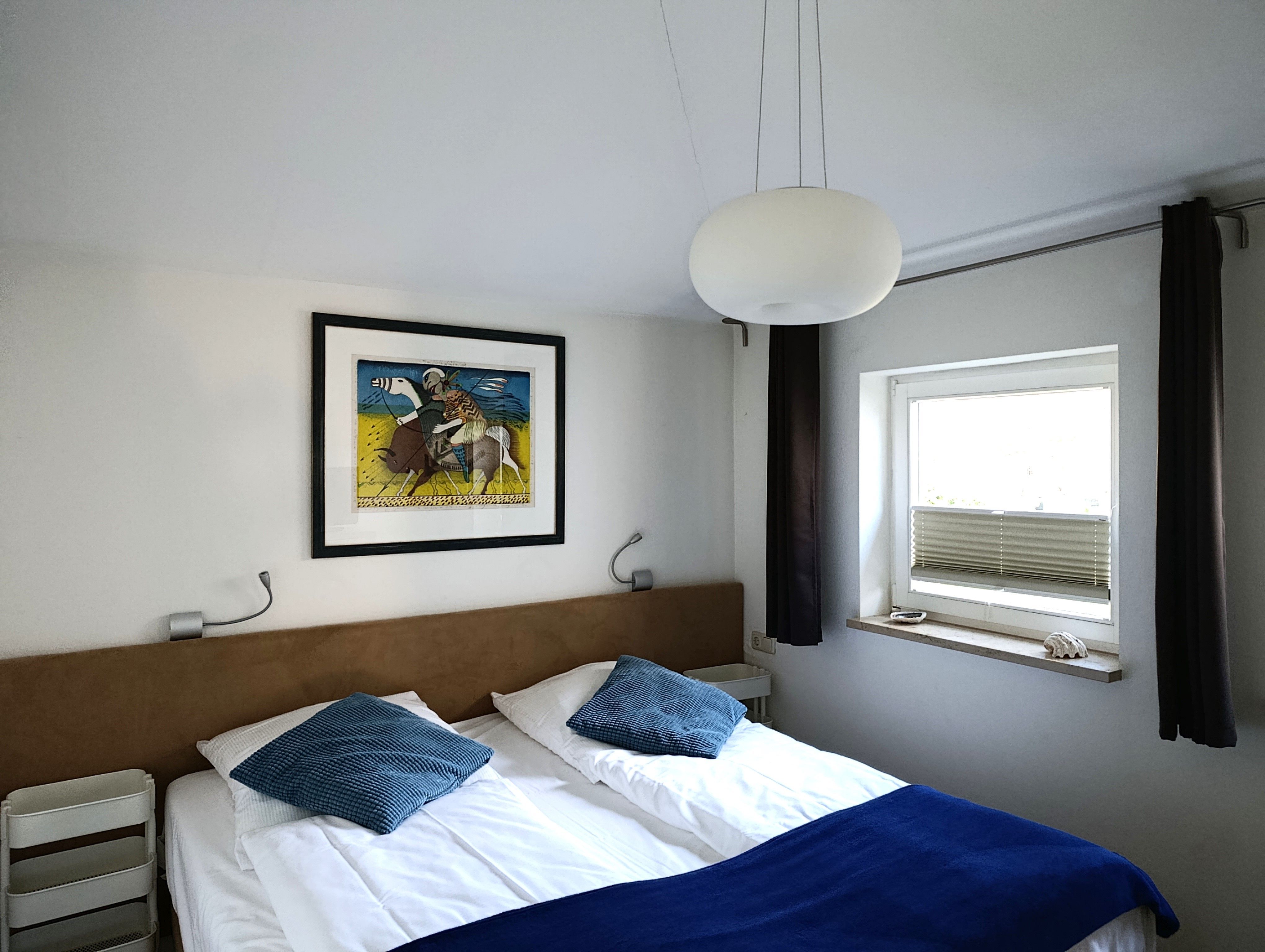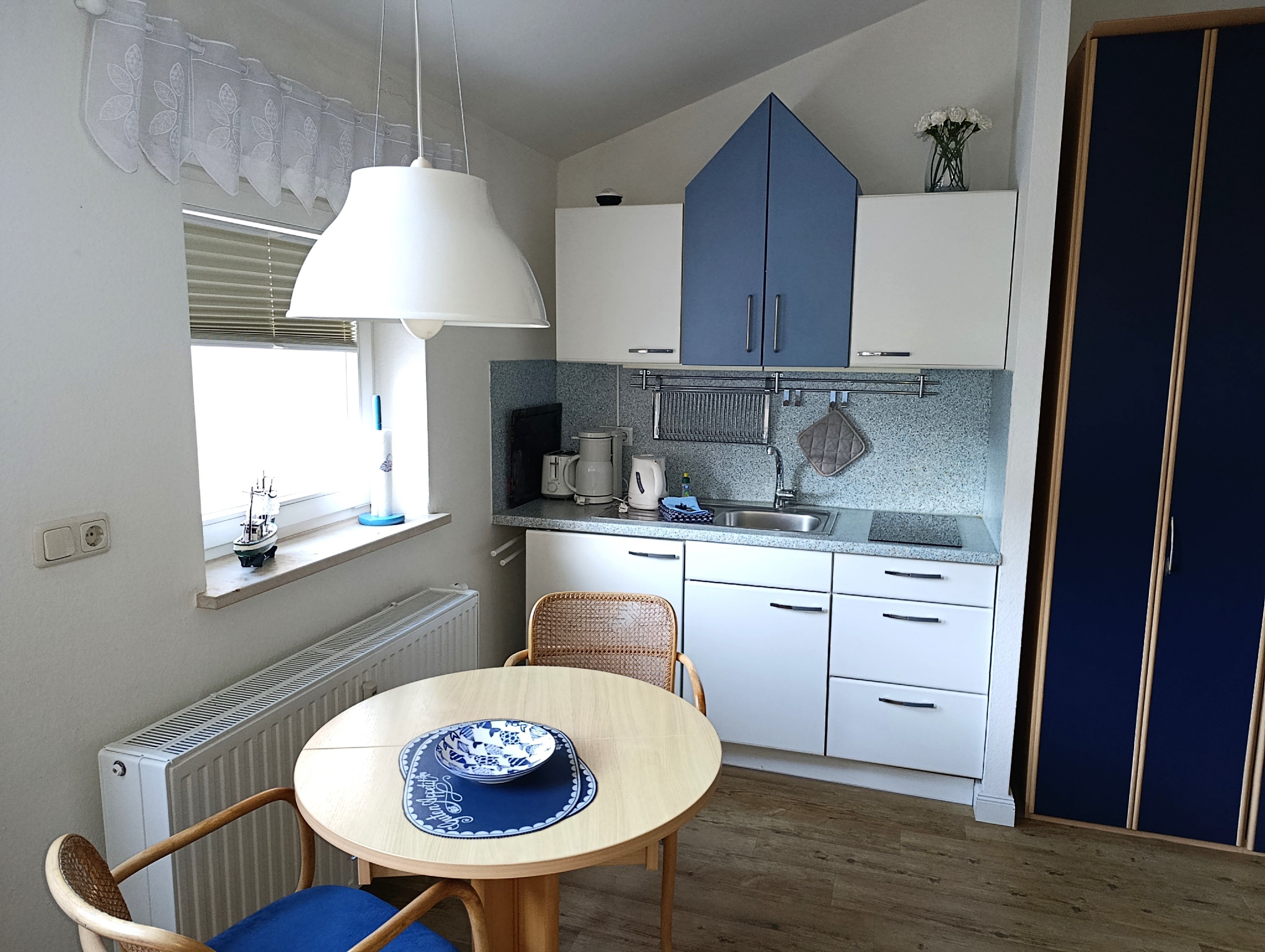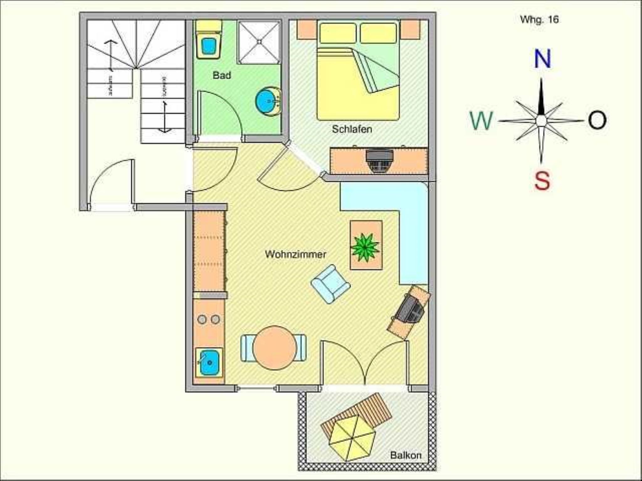 Nur 150 m vom Strand wohnen Sie in einer 2-Raum-Ferienwohnung. Die 39 qm große Wohnung liegt in der ersten Etage. Das Wohnzimmer ist mit einer Couch, Couchtisch, Sessel, Anrichte, mit Kabel-TV (Flachbildschirm), Radio, Essbereich (Tisch und Stühle) und Küchenzeile ausgestattet. Der Balkon mit Tisch und Stühle geht zur Südseite. Im Schlafzimmer stehen ein Doppelbett und eine kleine Anrichte. Die Küchenzeile wurde ausgestattet mit Mikrowelle, Kühlschrank, Kaffeemaschine, Zwei-Platten-Kochfeld, Toaster und Wasserkocher. Das Bad mit Dusche und WC komplettiert die Wohnung.