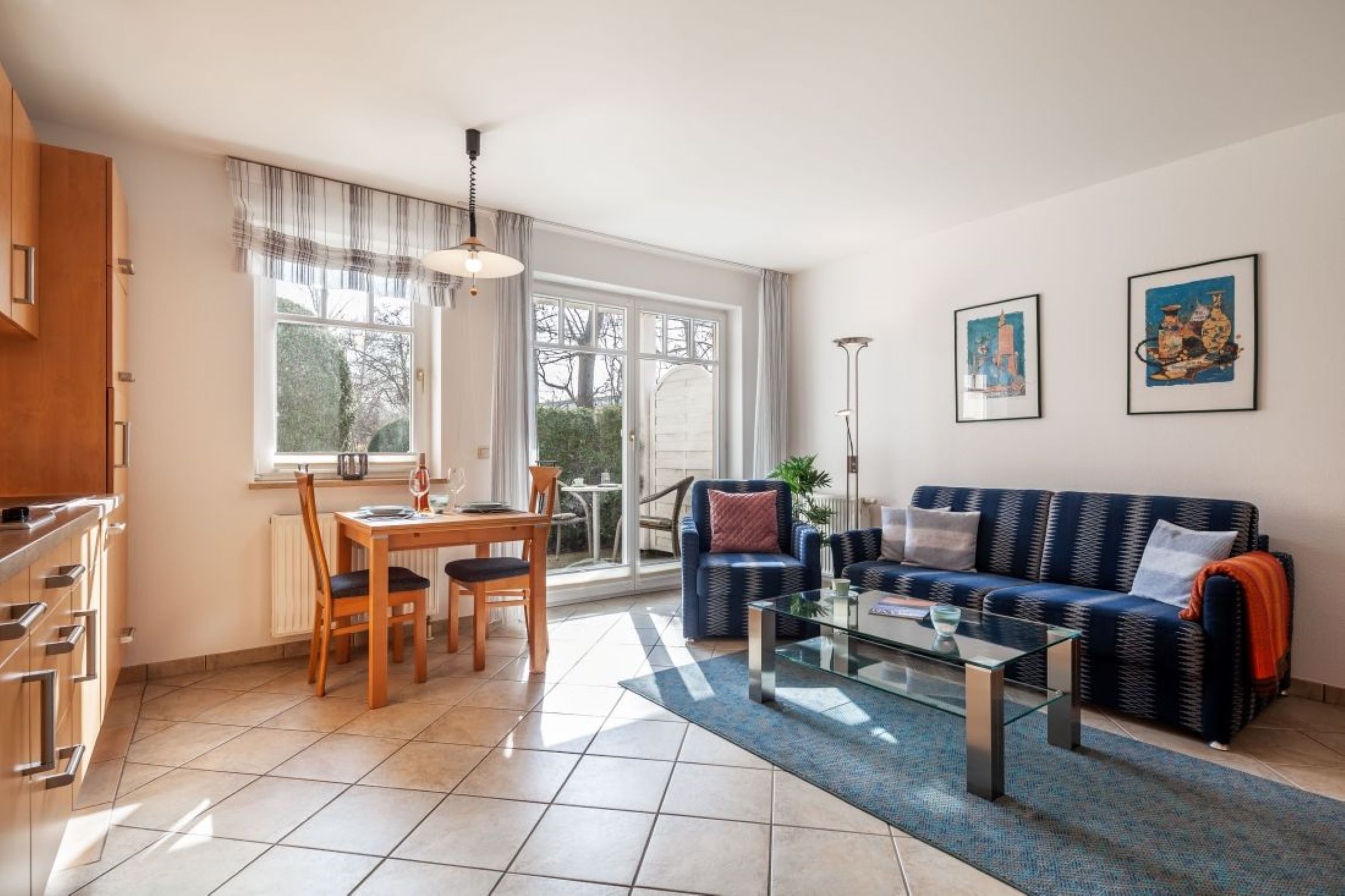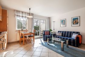 Nur 150 m vom Strand wohnen Sie in einer ca. 34 qm großen 2-Raum-Ferienwohnung.Das Wohnzimmer ist mit einer Couch, Couchtisch, Sessel, Anrichte, mit Kabel-TV (Flachbildschirm), Radio, Essbereich (Tisch und Stühle) und Küchenzeile ausgestattet. Die Terrasse mit Tisch und Stühle geht zur Südseite. Im Schlafzimmer stehen ein Doppelbett und eine kleine Anrichte. Die Küchenzeile wurde ausgestattet mit Mikrowelle, Kühlschrank, Kaffeemaschine, Geschirrspüler, Zwei-Platten-Kochfeld, Toaster und Wasserkocher. Das Bad mit Dusche und WC komplettiert die Wohnung.