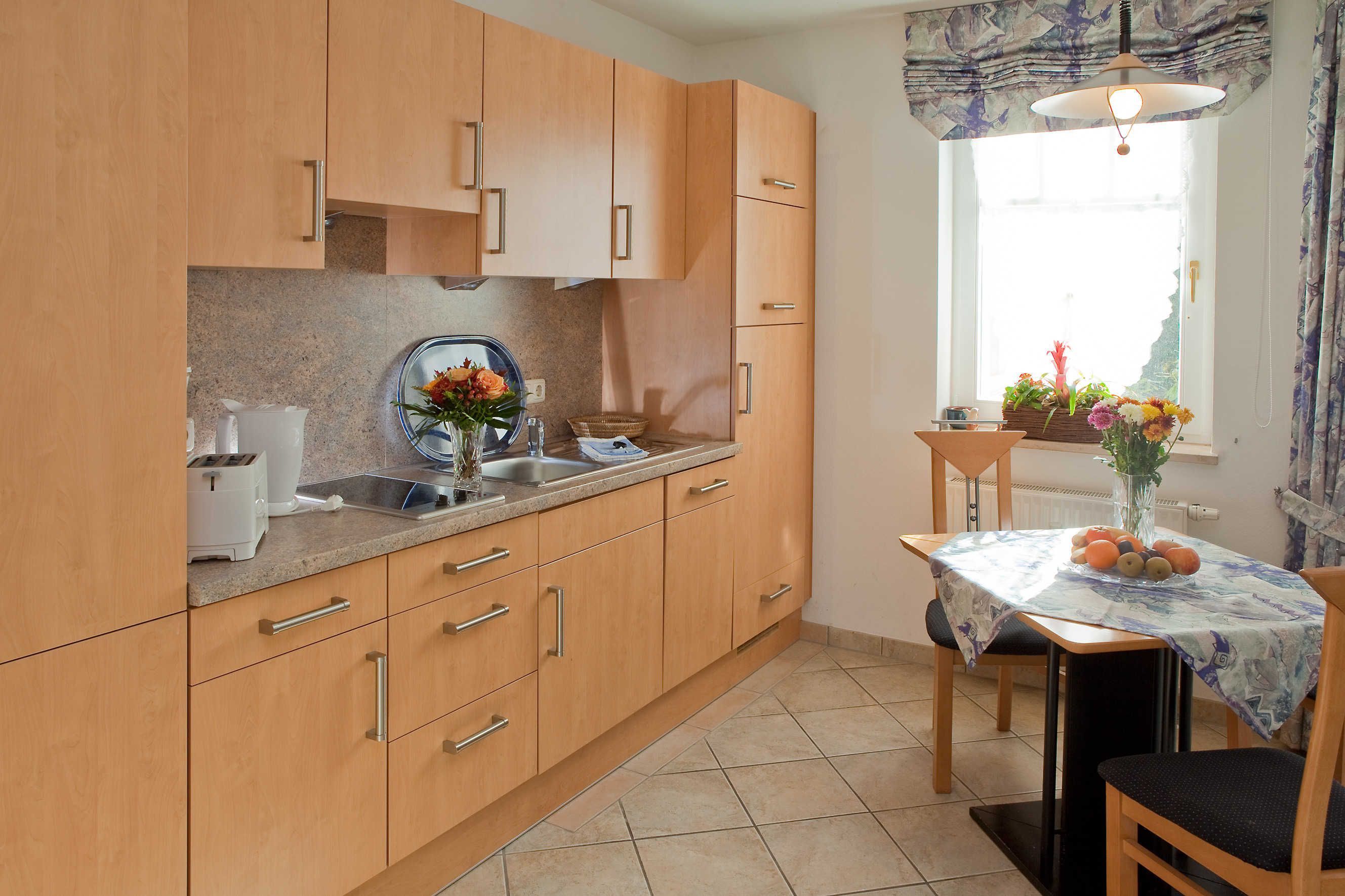 Die modern gestaltete Ferienwohnung im Erdgeschoss hat einen offenen Wohnbereich mit Küchenzeile und Essbereich, ein Schlafzimmer mit Doppelbett und eine Terrasse. Die funktionale Küchenzeile ist mit 2-Platten-Ceranfeld, Geschirrspüler, Kühlschrank mit Gefrierfach, Mikrowelle, Kaffeemaschine und div. Geschirr ausgestattet. Ein Bad mit ebenerdiger Dusche, Waschtisch und WC komplettieren den guten Gesamteindruck der Wohnung.
