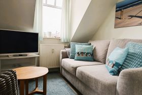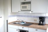 Die funktional gestaltete Ferienwohnung in der 3. Etage hat einen offenen Wohnbereich mit Küchenzeile und Essbereich, ein Schlafzimmer mit Doppelbett und eine Loggia. Die funktionale Küchenzeile ist mit 2-Platten-Ceranfeld,Geschirrspüler, Abzugshaube, Kühlschrank mit Gefrierfach, Mikrowelle, Kaffeemaschine und div. Geschirr ausgestattet. Eigener Safe in der Wohnung. Ein Bad mit Dusche, Waschbecken und WC komplettieren den guten Gesamteindruck der Wohnung.