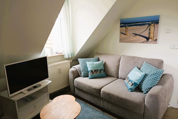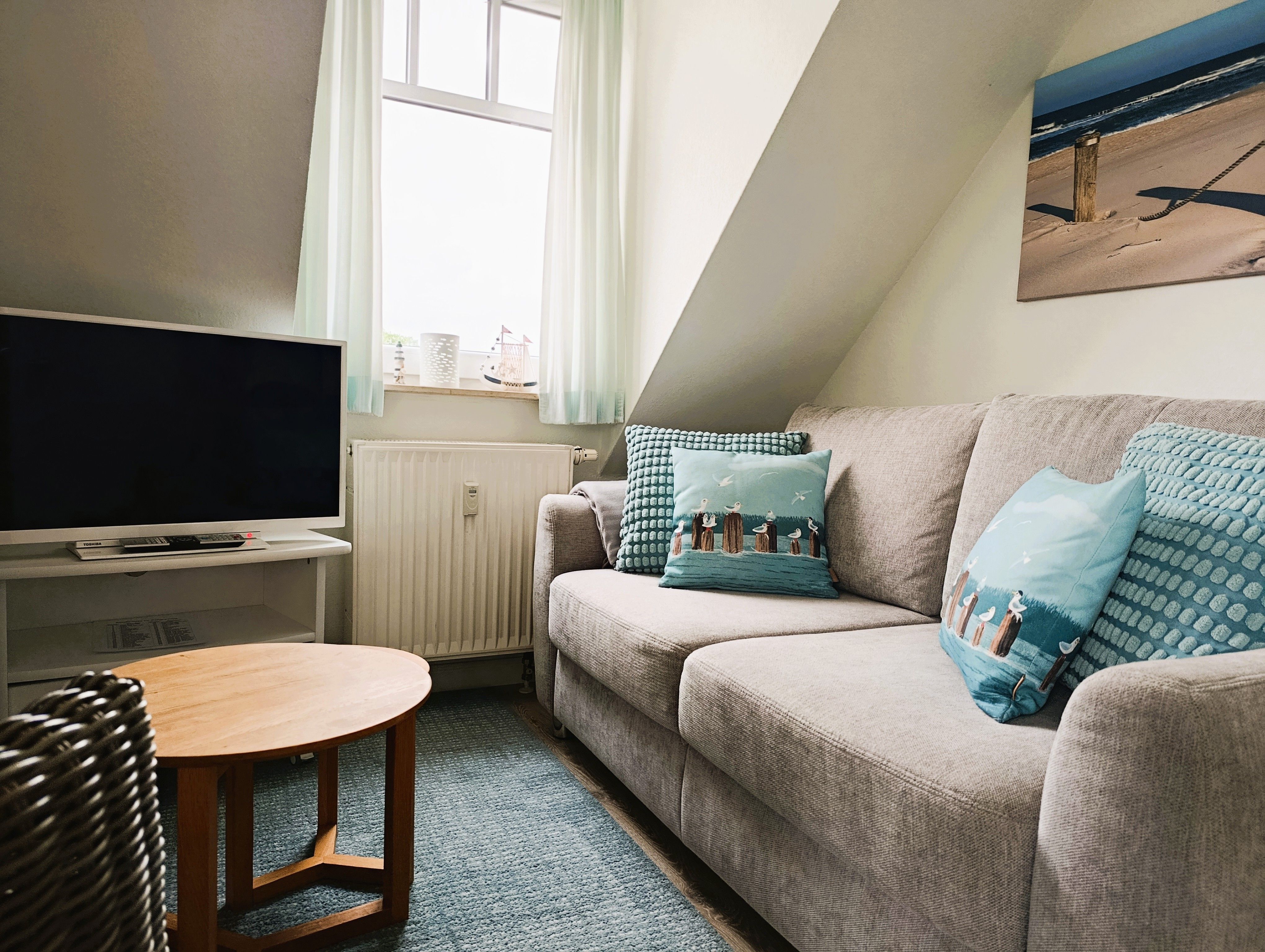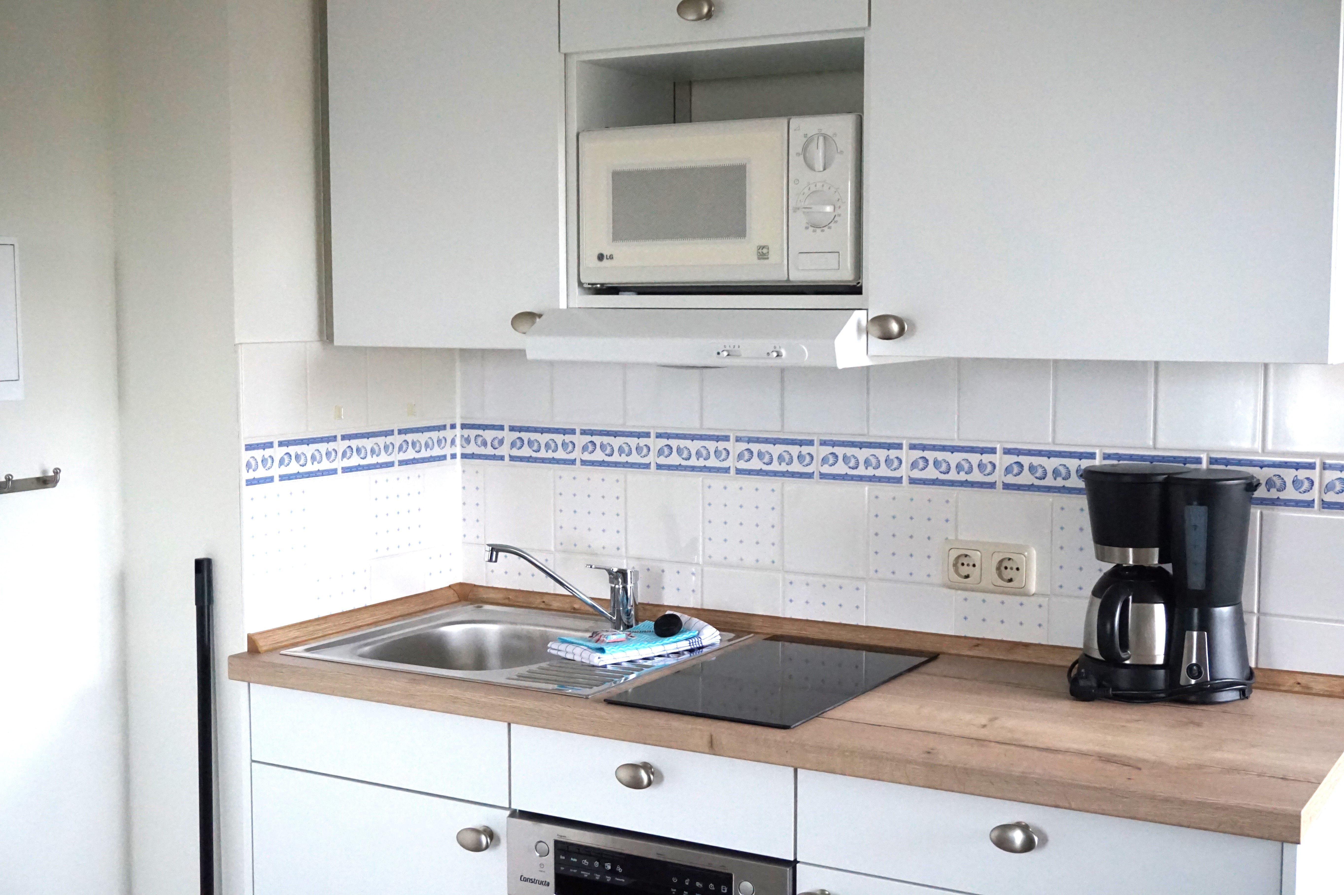 Nur 150 m vom Strand wohnen Sie in einer 1-Raum-Ferienwohnung. Die 35 qm große Wohnung liegt in der Dritten Etage. Das Wohnzimmer/Schlafzimmer ist mit einer Couch, Couchtisch, Sessel, Anrichte, mit Kabel-TV (Flachbildschirm), Radio und Doppelbett mit Kleiderschrank ausgestattet. Der Balkon mit Tisch und Stühle geht zur Südseite. Die Küchenzeile wurde ausgestattet mit Mikrowelle, Kühlschrank, Kaffeemaschine, Zwei-Platten-Kochfeld, Toaster und Wasserkocher. Das Bad mit Dusche und WC komplettiert die Wohnung.