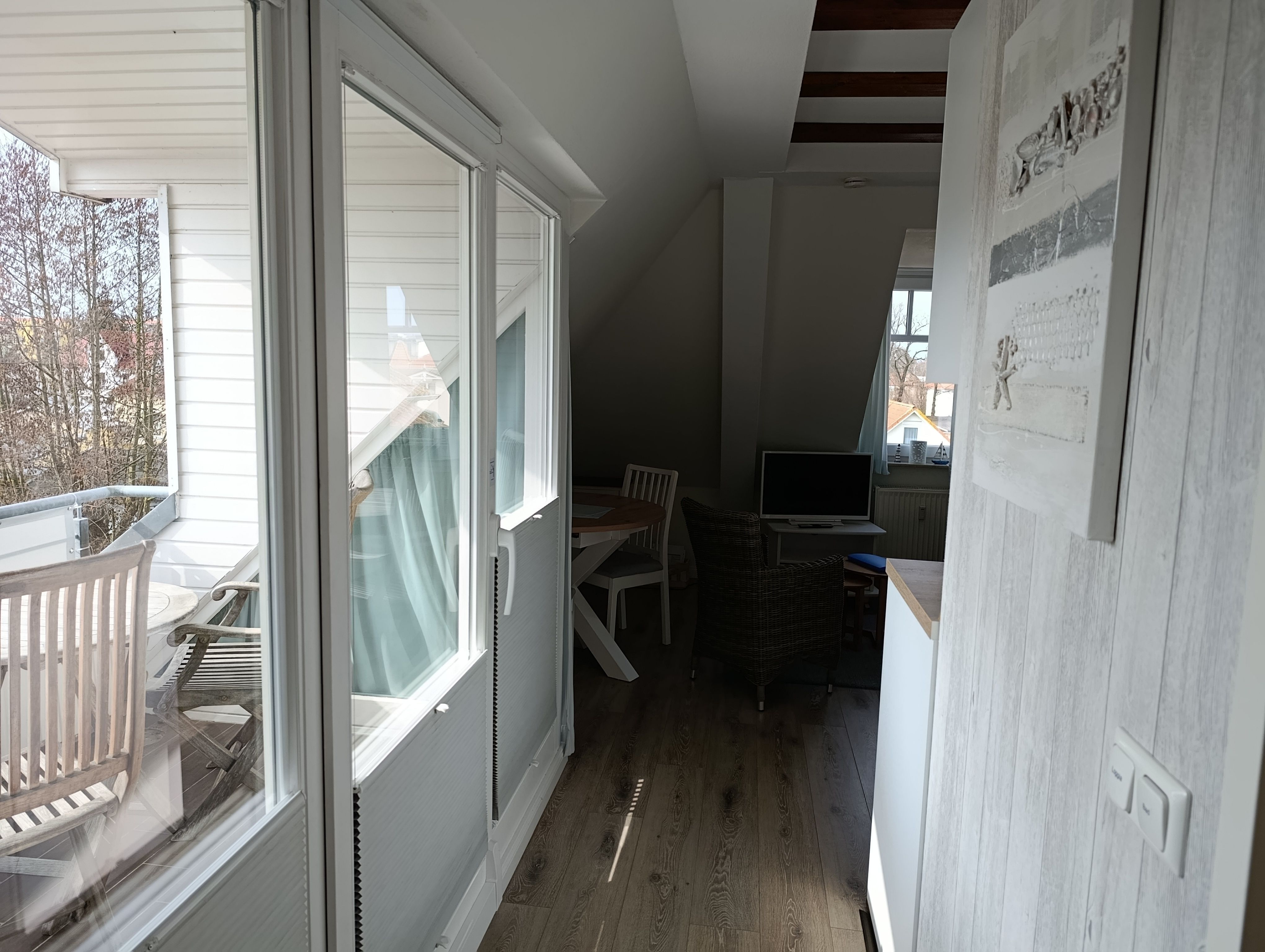 Die ca. 28 qm große 1-Raum-Ferienwohnung liegt in der III. Etage. Der Wohn-/Essbereich und die Küchenzeile sind auf der rechten Seite und der Schlafbereich auf der linken Seite. Ein Duschbad und eine Südloggia vervollständigen die kleine aber feine Wohnung.