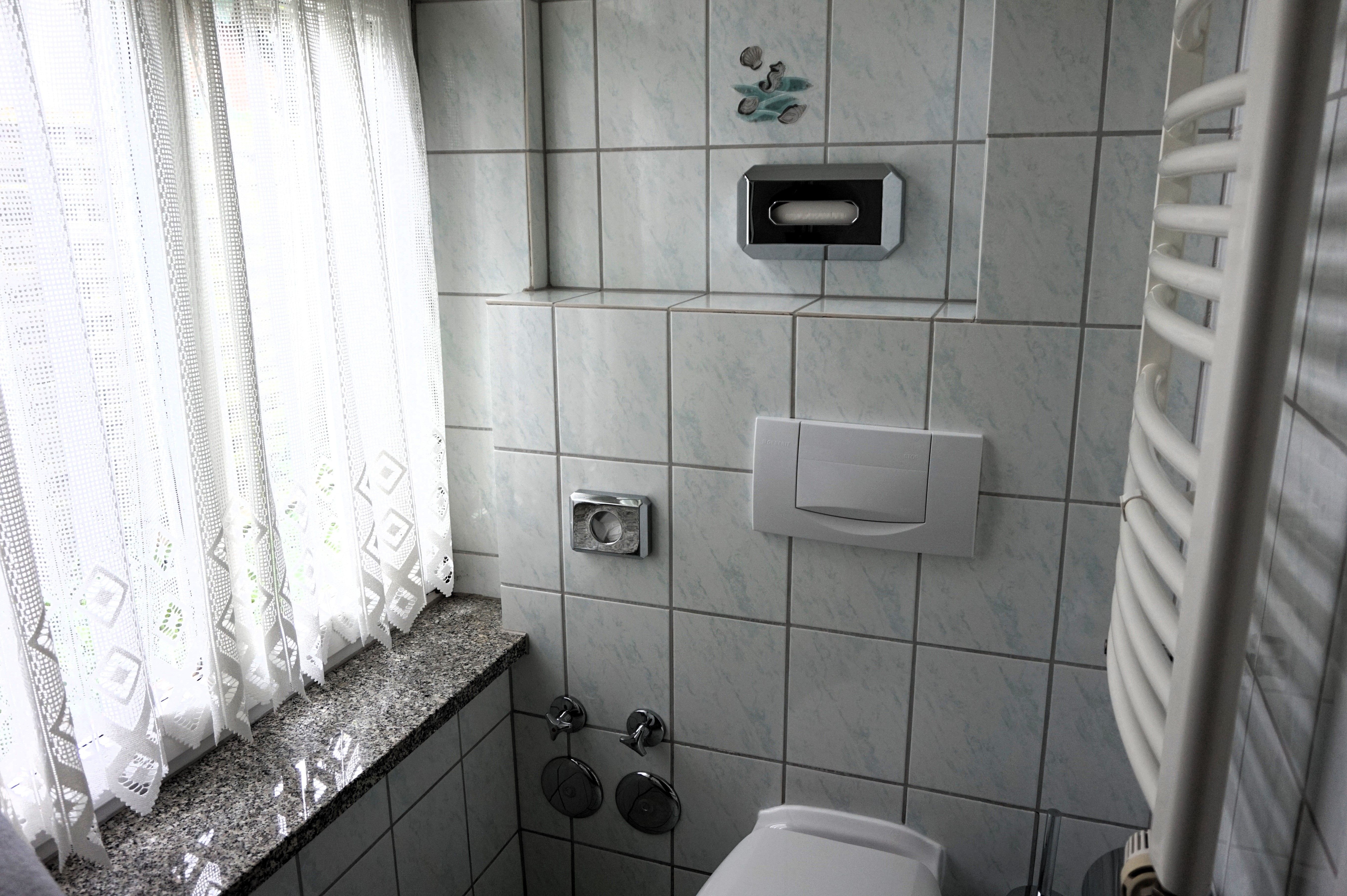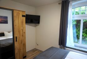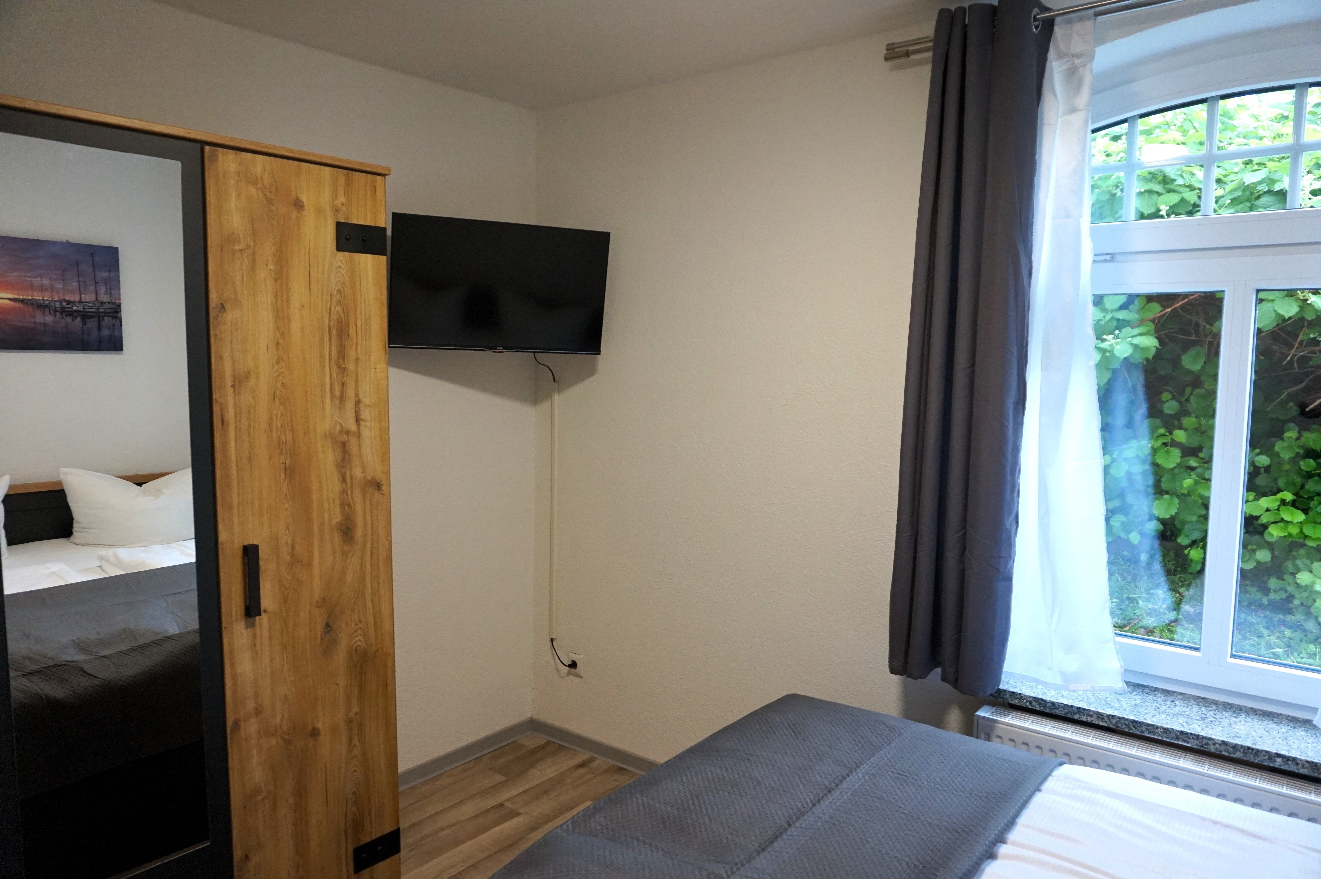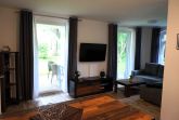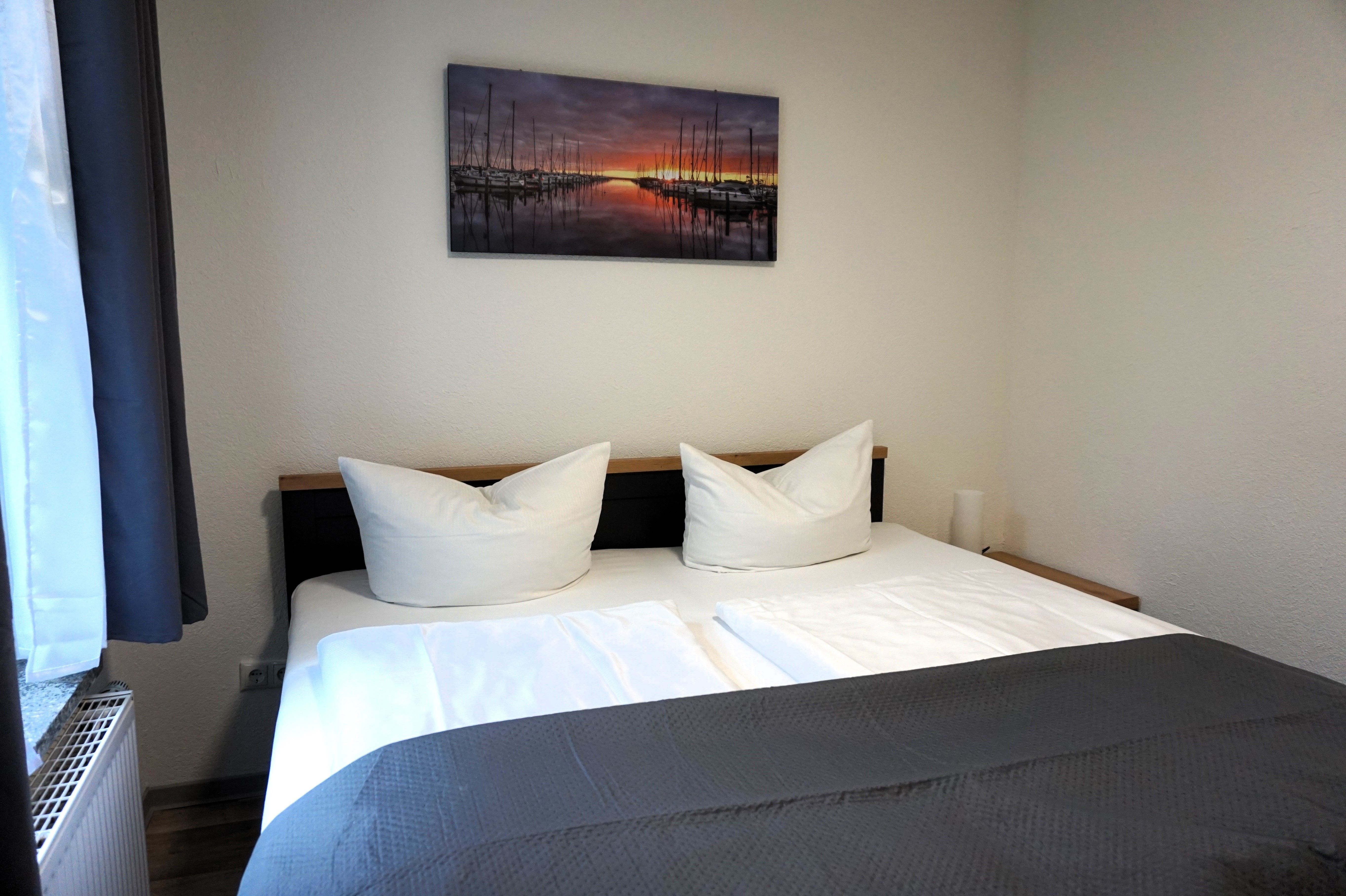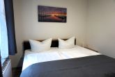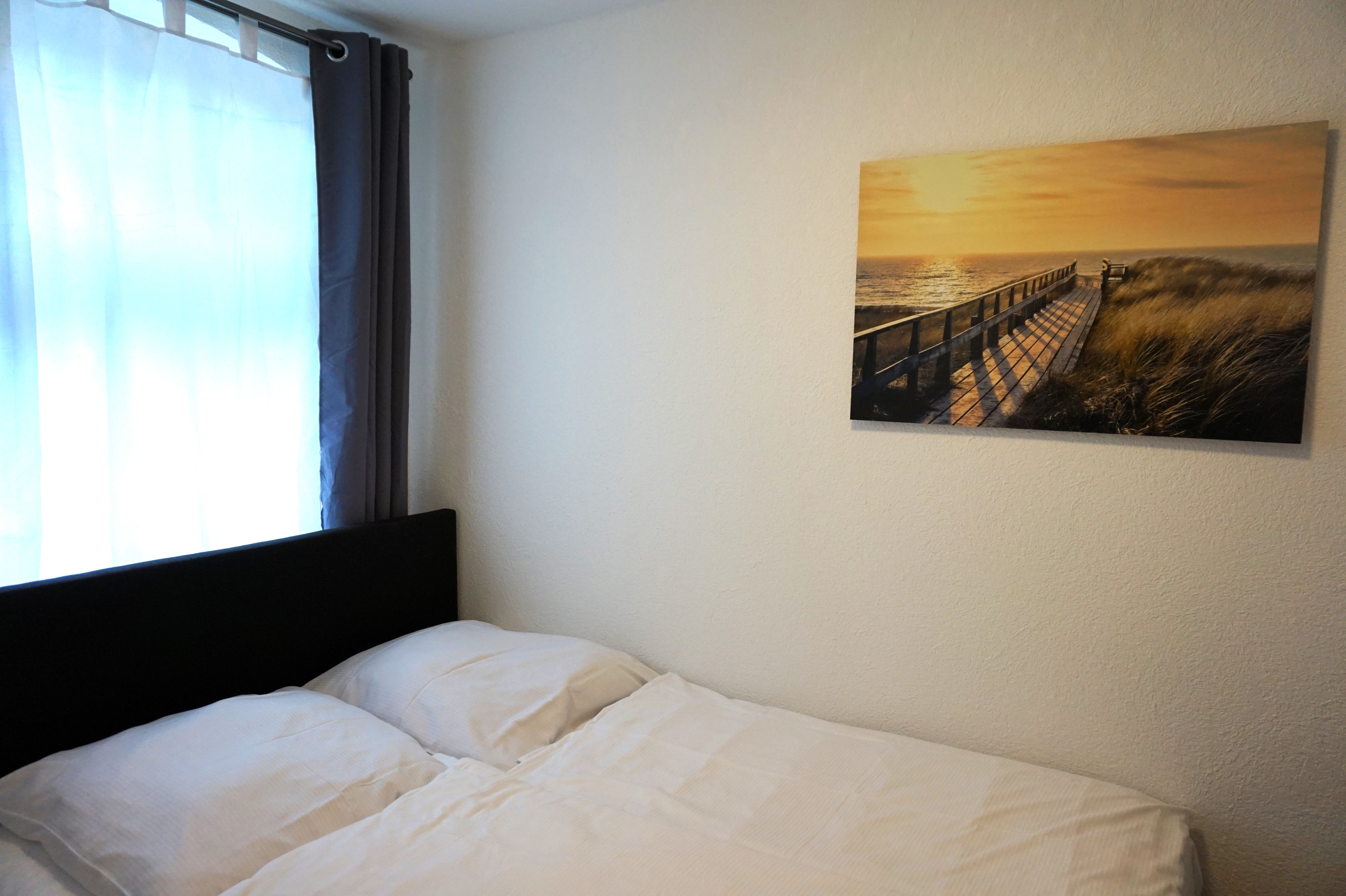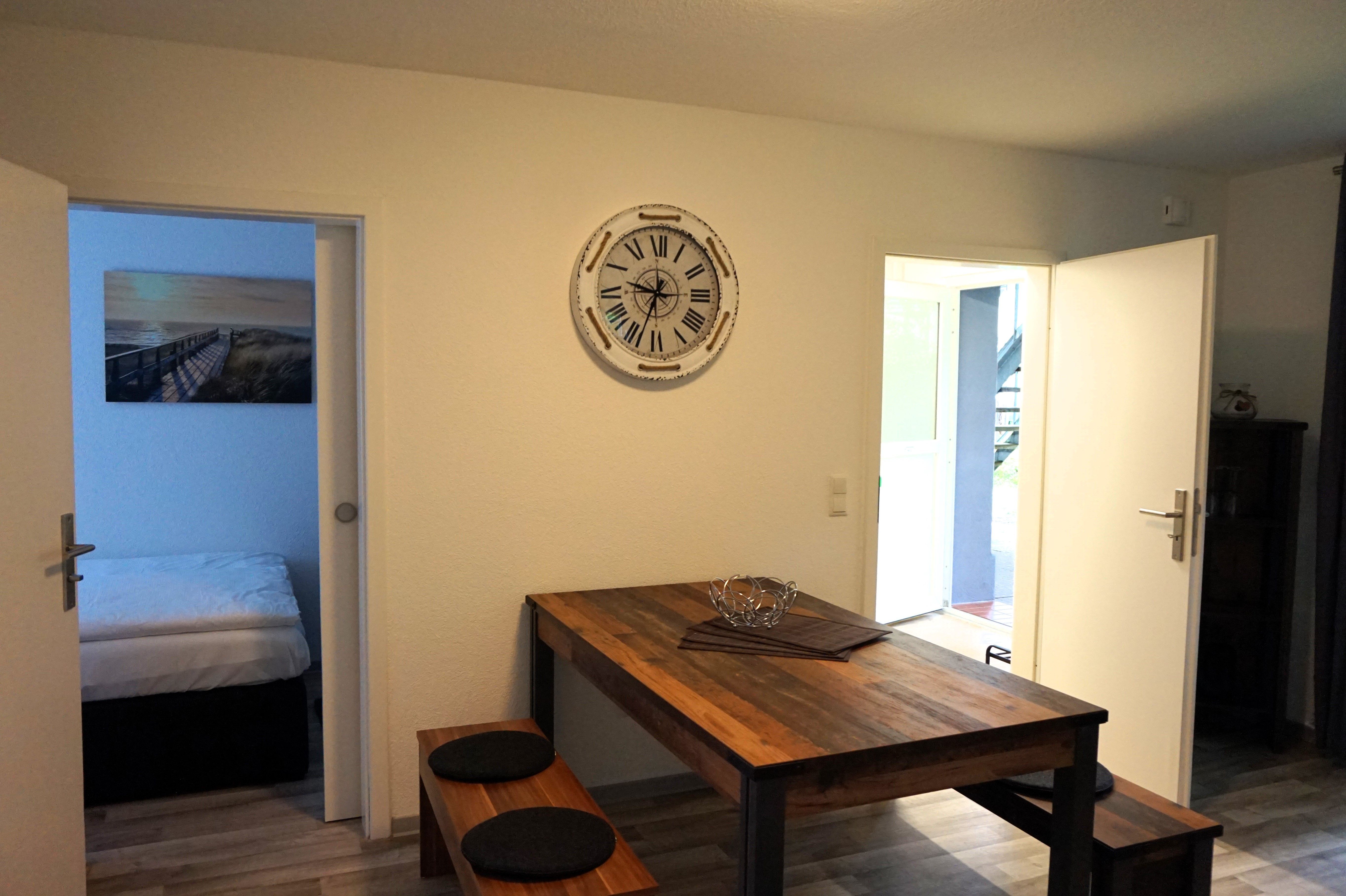 Die funktional gestaltete Ferienwohnung im Erdgeschoss hat ein Wohnzimmer mit Essecke für 4 Personen, eine kleine Küche, ein Schlafzimmer mit Doppelbett, ein Gästezimmer mit Boxspringbett und eine Terrasse. Die kleine Küche ist mit 4-Platten-Ceranfeld, Backofen, Kühlschrank, kleinen Gefrierschrank, Mikrowelle, Geschirrspüler, Kaffeemaschine und div. Geschirr ausgestattet. Ein Bad mit Fenster, Dusche, Waschbecken und WC komplettieren den guten Gesamteindruck der Wohnung.
