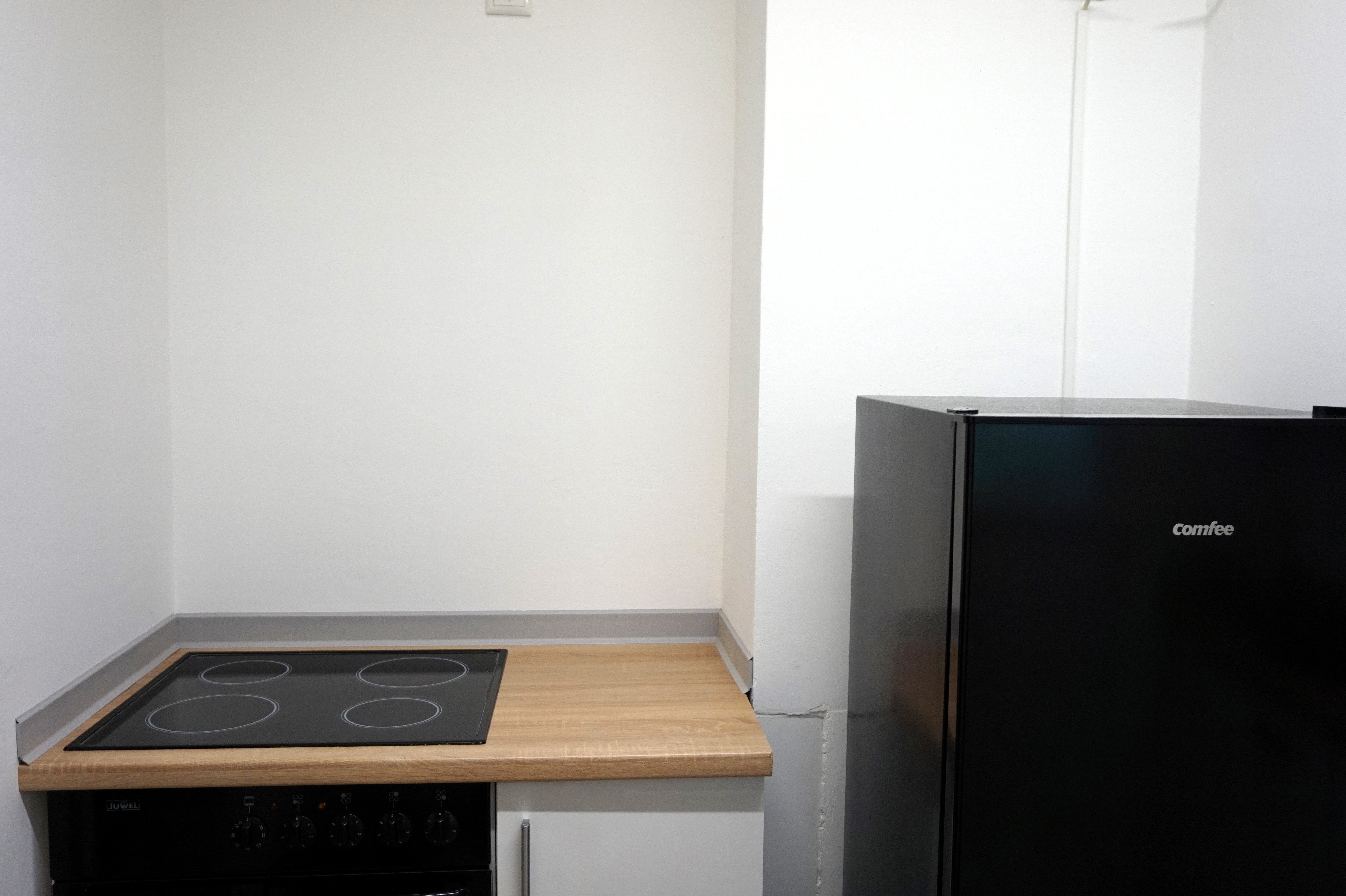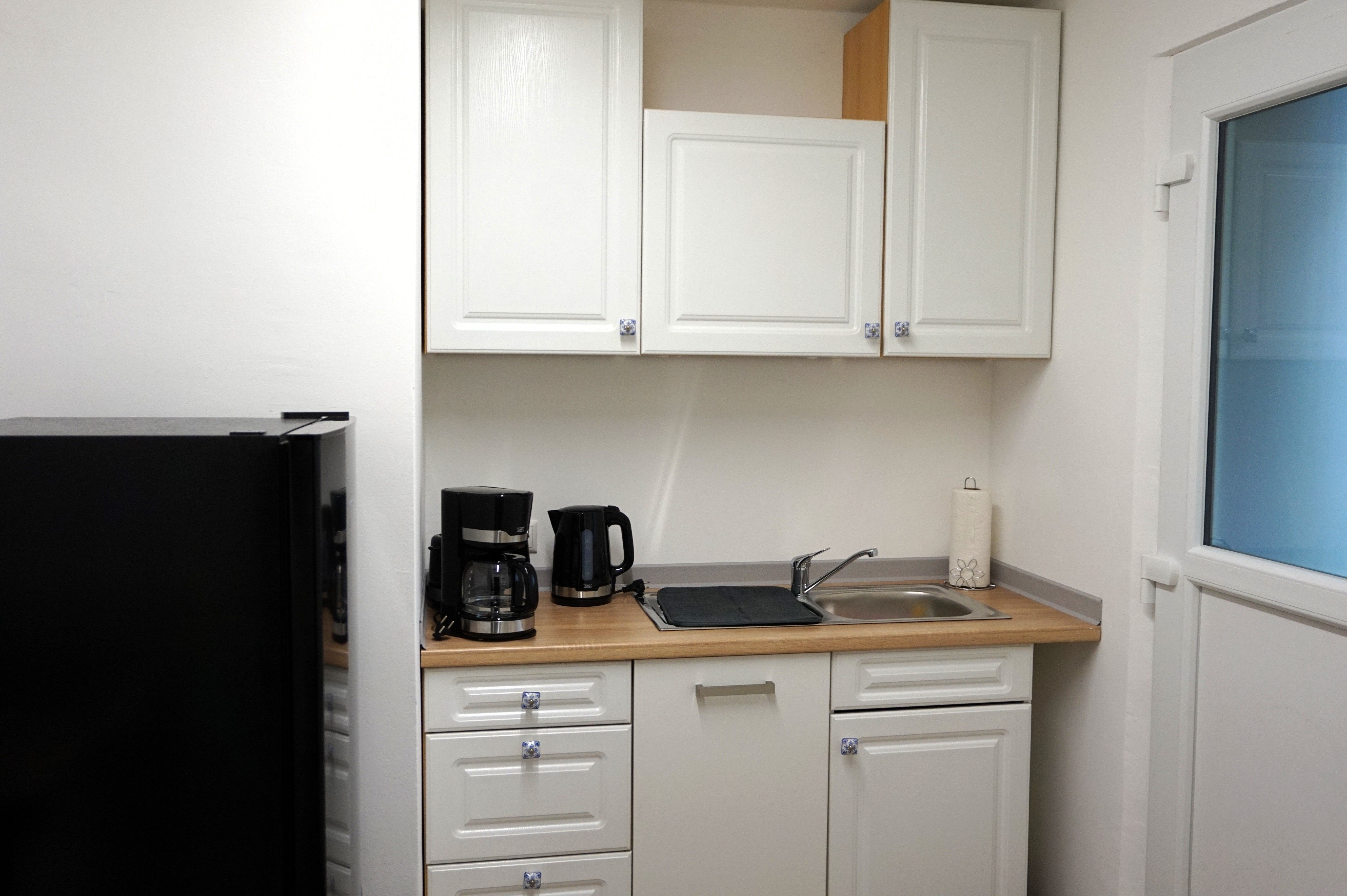 Küchezeile mit Mikrowelle, 4-Platten-Ceran-Herd, Kühlschrank, kleiner Gefrierschrank, Geschirrspüler und Kaffeemaschine