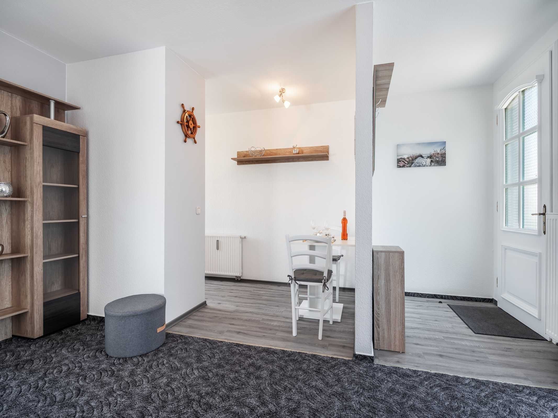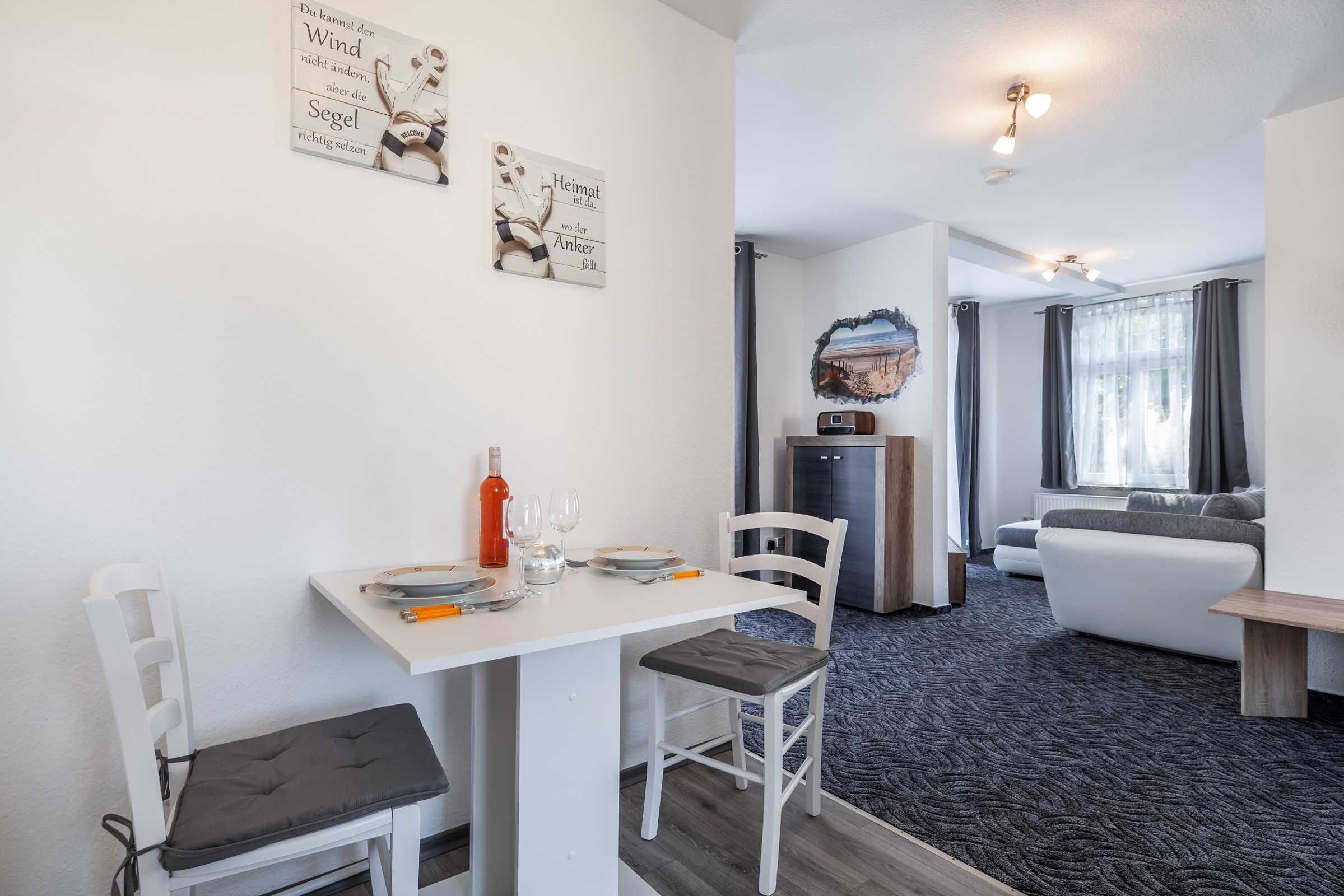 Nur 150 m vom Strand wohnen Sie in einer 2-Raum-Ferienwohnung. Die 50 qm große Wohnung liegt in der 1. Etage. Das Wohnzimmer ist mit einer Couch, Couchtisch, Sessel, Anrichte, mit Kabel-TV, Radio, Essbereich (Tisch und Stühle) und Küchenzeile ausgestattet. Der Balkon mit Tisch und Stühle geht zur Ostseite. Im Schlafzimmer stehen ein Doppelbett und ein Kleiderschrank. Die Küchenzeile wurde ausgestattet mit Mikrowelle, Kühlschrank, Kaffeemaschine, Ceran-Kochfeld und Backofen, Geschirrspüler, Toaster und Wasserkocher. Das Bad mit Dusche und WC komplettiert die Wohnung.