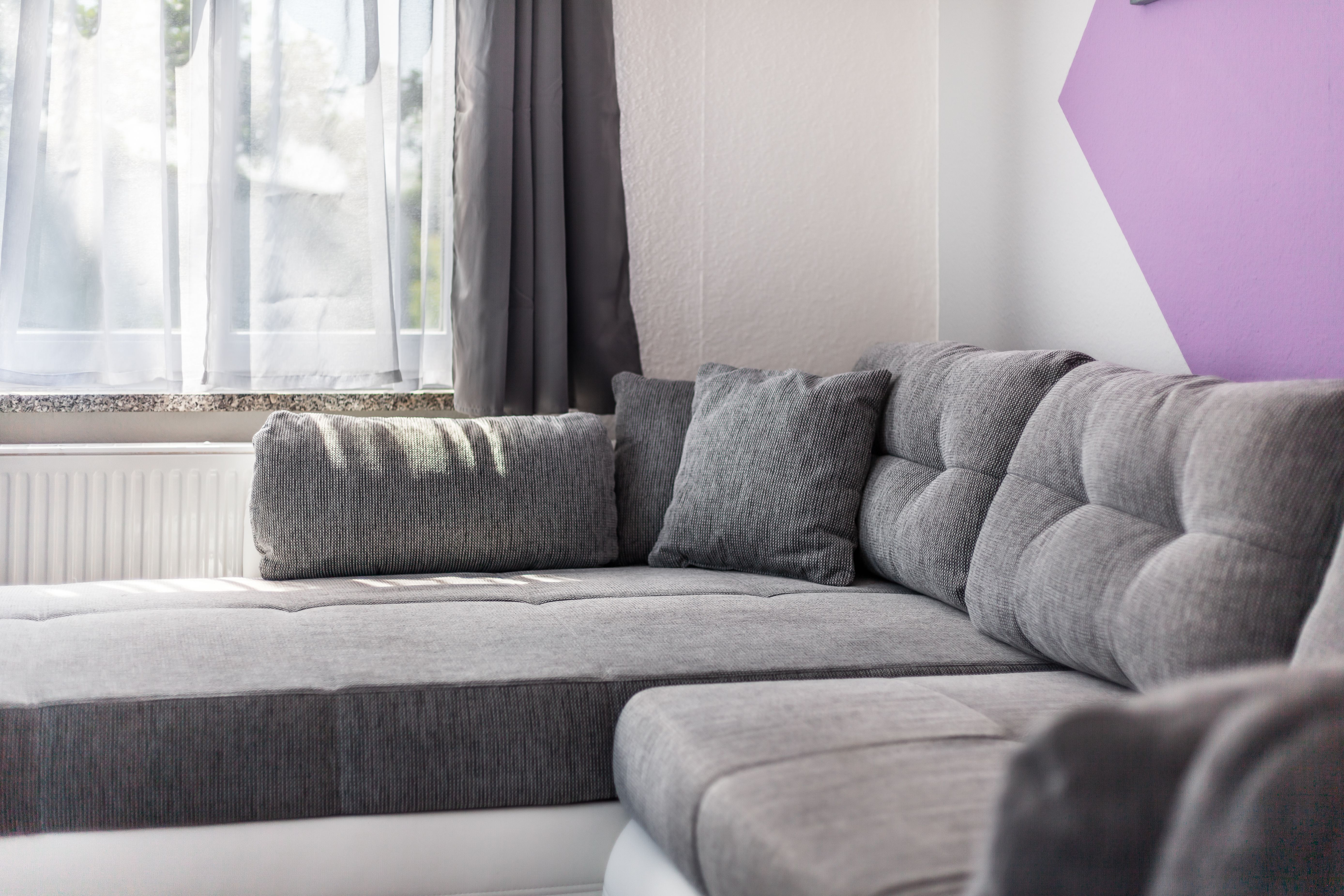 Wohnzimmer mit Schlafcouch, Esstisch, Kabel-TV und Radio