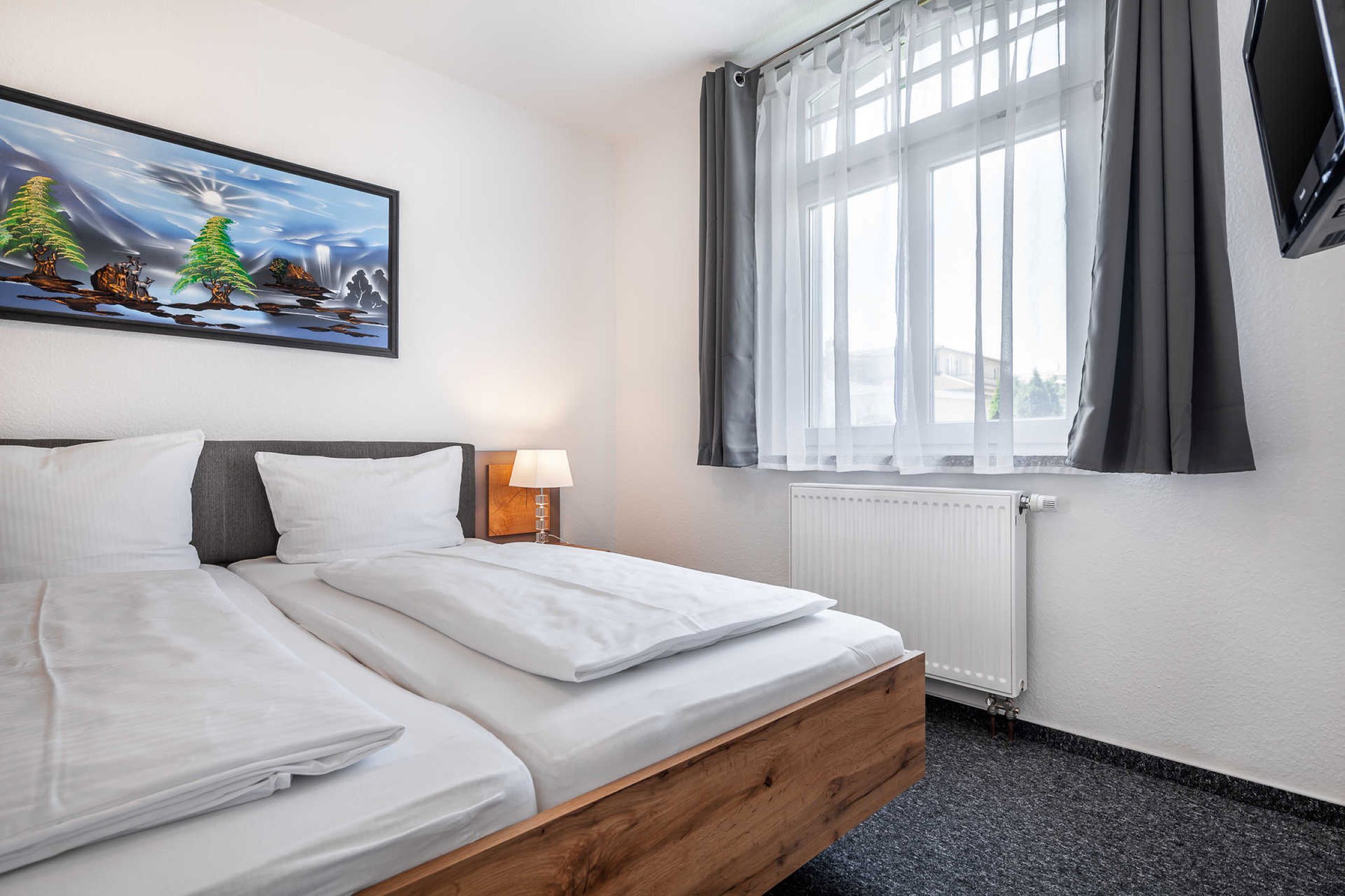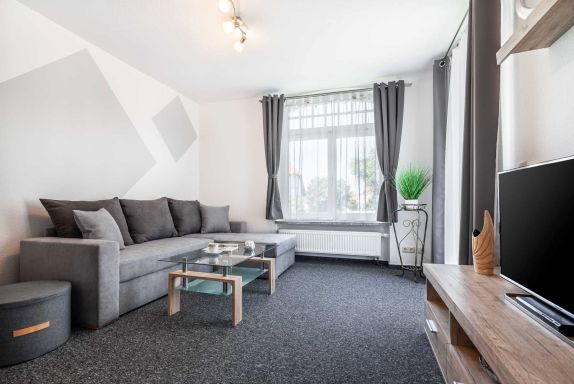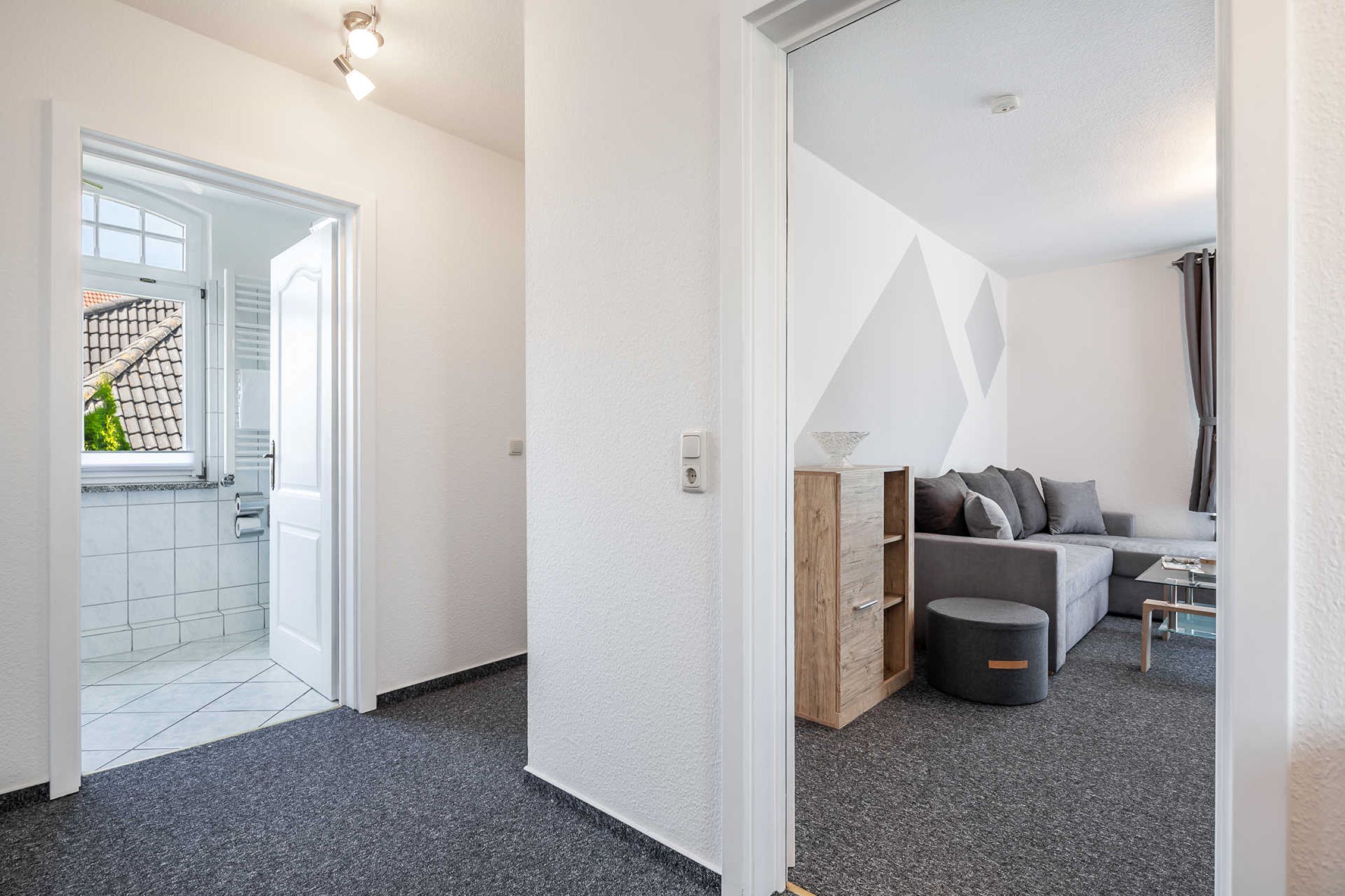 Die funktional gestaltete Ferienwohnung in der 1. Etage hat ein Wohnzimmer bequemer Sitzecke, eine Küche mit Esstisch, ein Schlafzimmer mit Doppelbett, ein Gästezimmer mit Einzelbett und ein Balkon. Die funktionale Küche ist mit 4-Platten-Ceranfeld, Backofen, Kühlschrank, kleinen Gefrierschrank, Mikrowelle, Geschirrspüler, Kaffeemaschine und div. Geschirr ausgestattet. Ein Bad mit Fenster, Dusche, Waschbecken und WC komplettieren den guten Gesamteindruck der Wohnung.