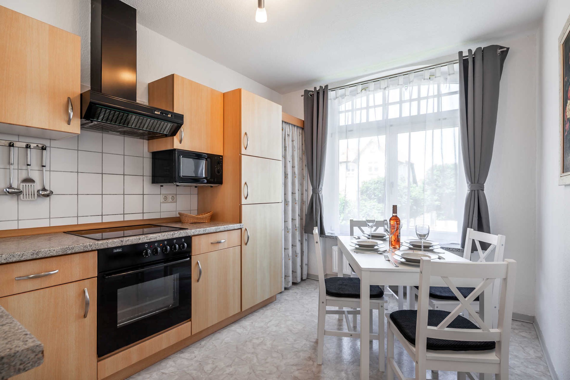 Nur 150 m vom Strand wohnen Sie in einer 3-Raum-Ferienwohnung. Die 55 qm große Wohnung liegt in der 1. Etage. Das Wohnzimmer ist mit einer Couch, Couchtisch, Sessel, Anrichte, mit Kabel-TV, Radio, Essbereich (Tisch und Stühle) und Küchenzeile ausgestattet. Der Balkon mit Tisch und Stühle geht zur Ostseite. Im Schlafzimmer stehen ein Doppelbett und ein Kleiderschrank. Im Gästezimmer stehen ein Bett und ein kleiner Schrank mit TV . Die Küchenzeile wurde ausgestattet mit Mikrowelle, Kühlschrank, Kaffeemaschine, Ceran-Kochfeld und Backofen, Geschirrspüler, Toaster und Wasserkocher. Das Bad mit Dusche und WC komplettiert die Wohnung.