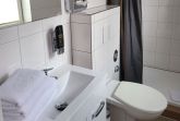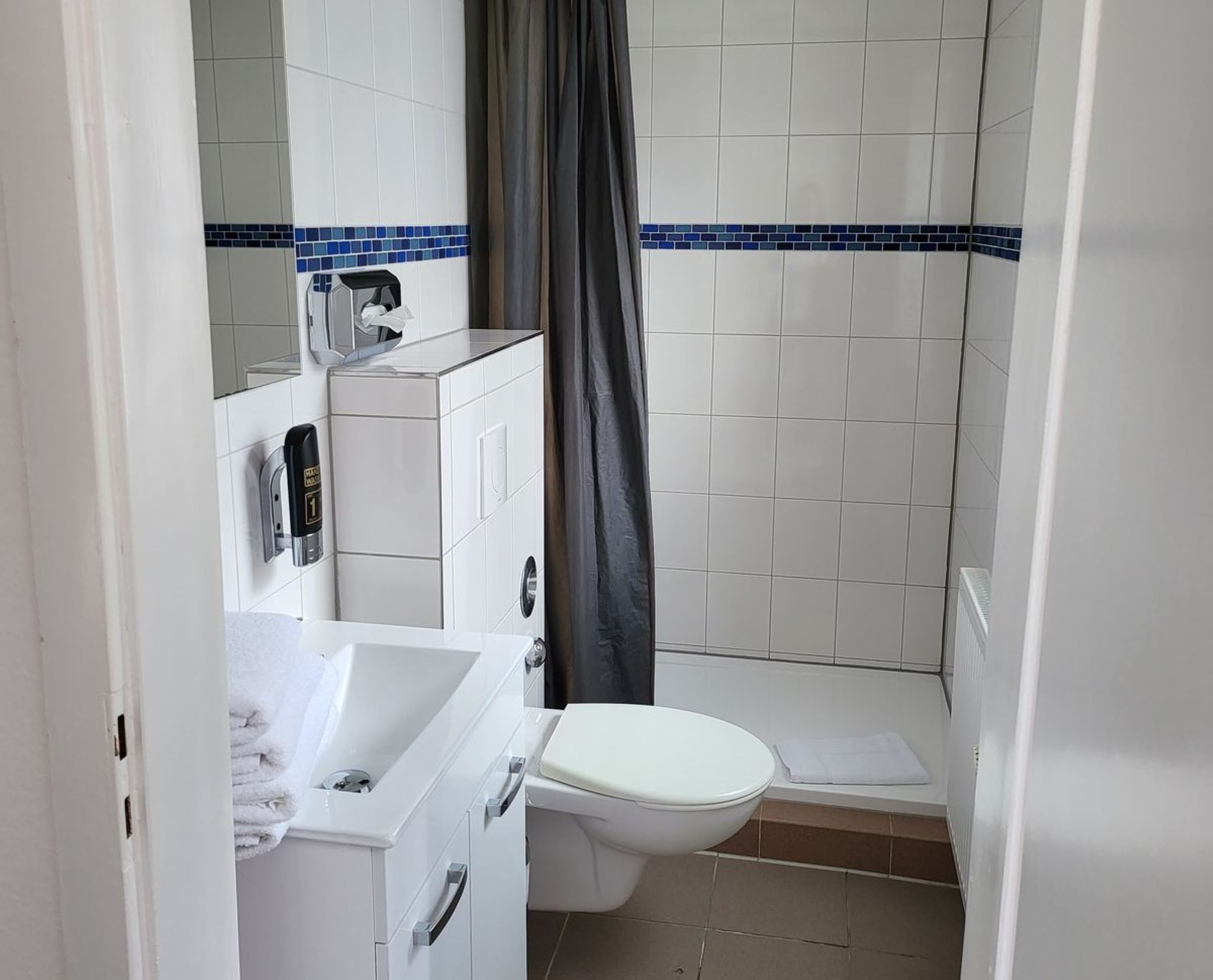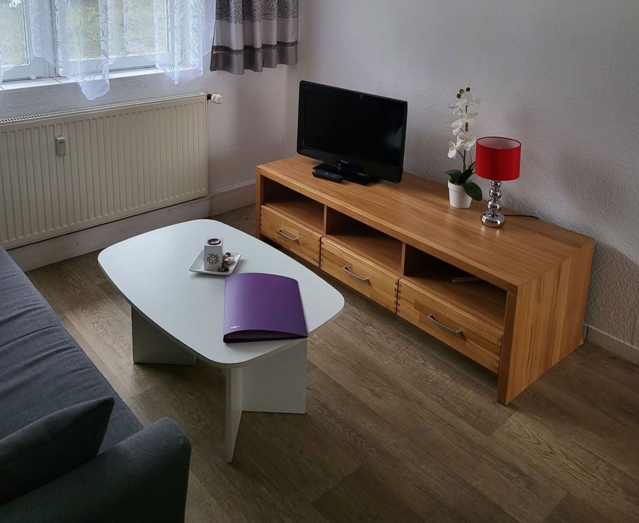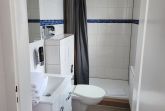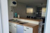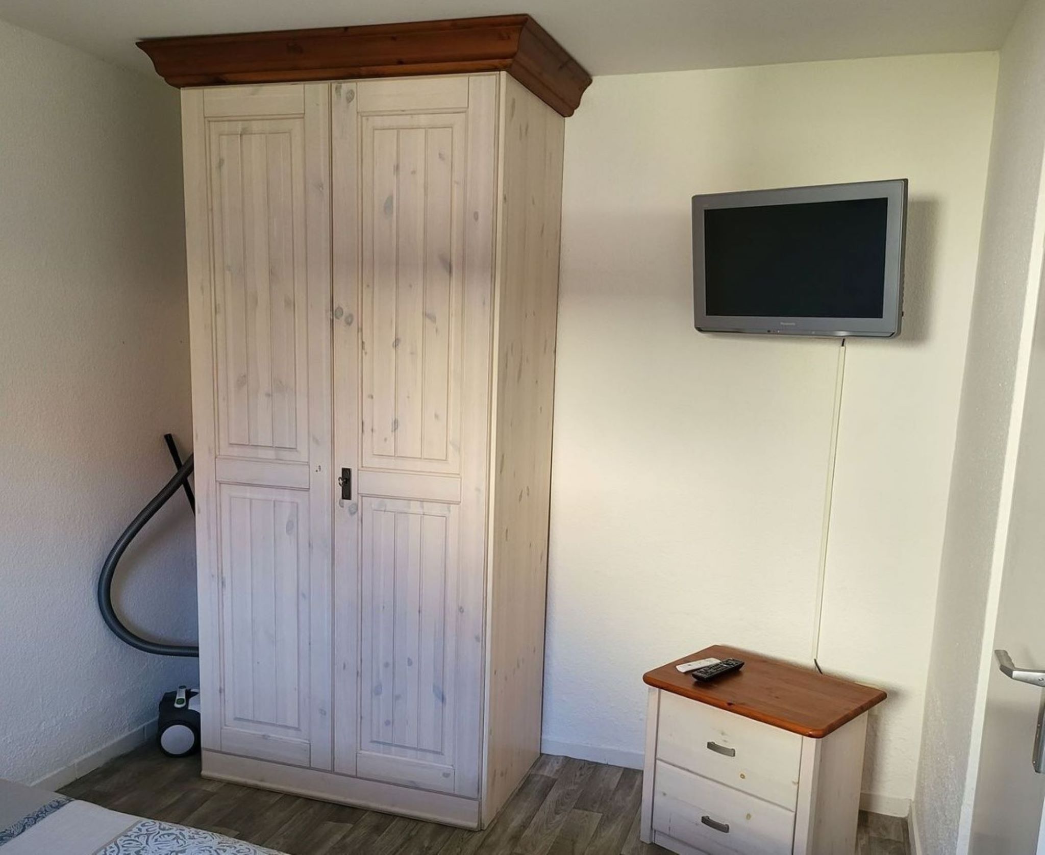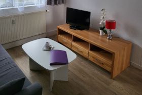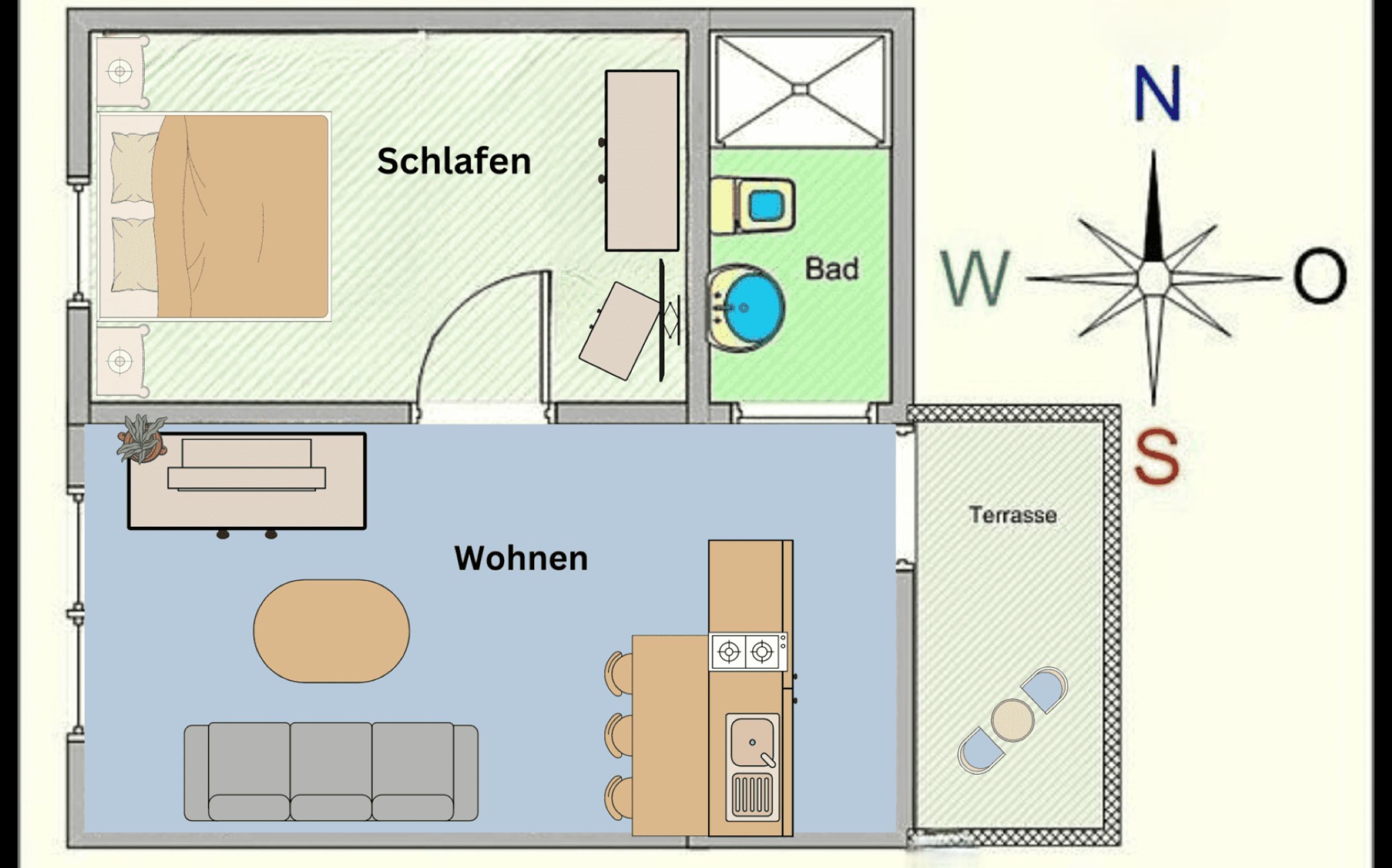 Die funktional gestaltete Wohnung hat ein Wohnzimmer mit Schlafsofa und Esstisch, eine kleine separate Küche, ein Schlafzimmer mit Doppelbett und eine Terrasse. Der Küchenbereich ist mit 2-Platten-Kochfeld, Kühlschrank mit Gefrierfach, Mikrowelle, Kaffeemaschine, Wasserkocher, Toaster und div. Geschirr ausgestattet. Ein Bad mit Fenster, Dusche, Waschbecken und WC komplettieren den Gesamteindruck der Wohnung.
