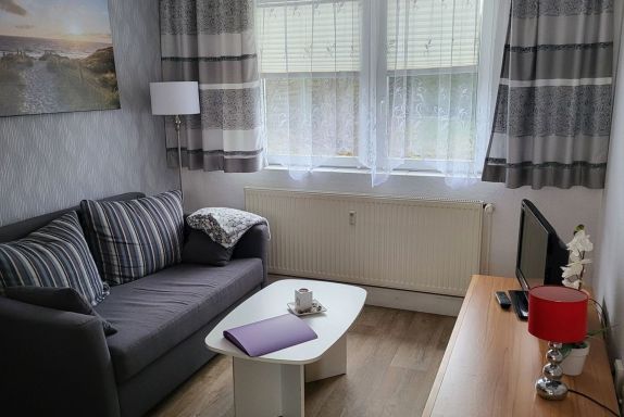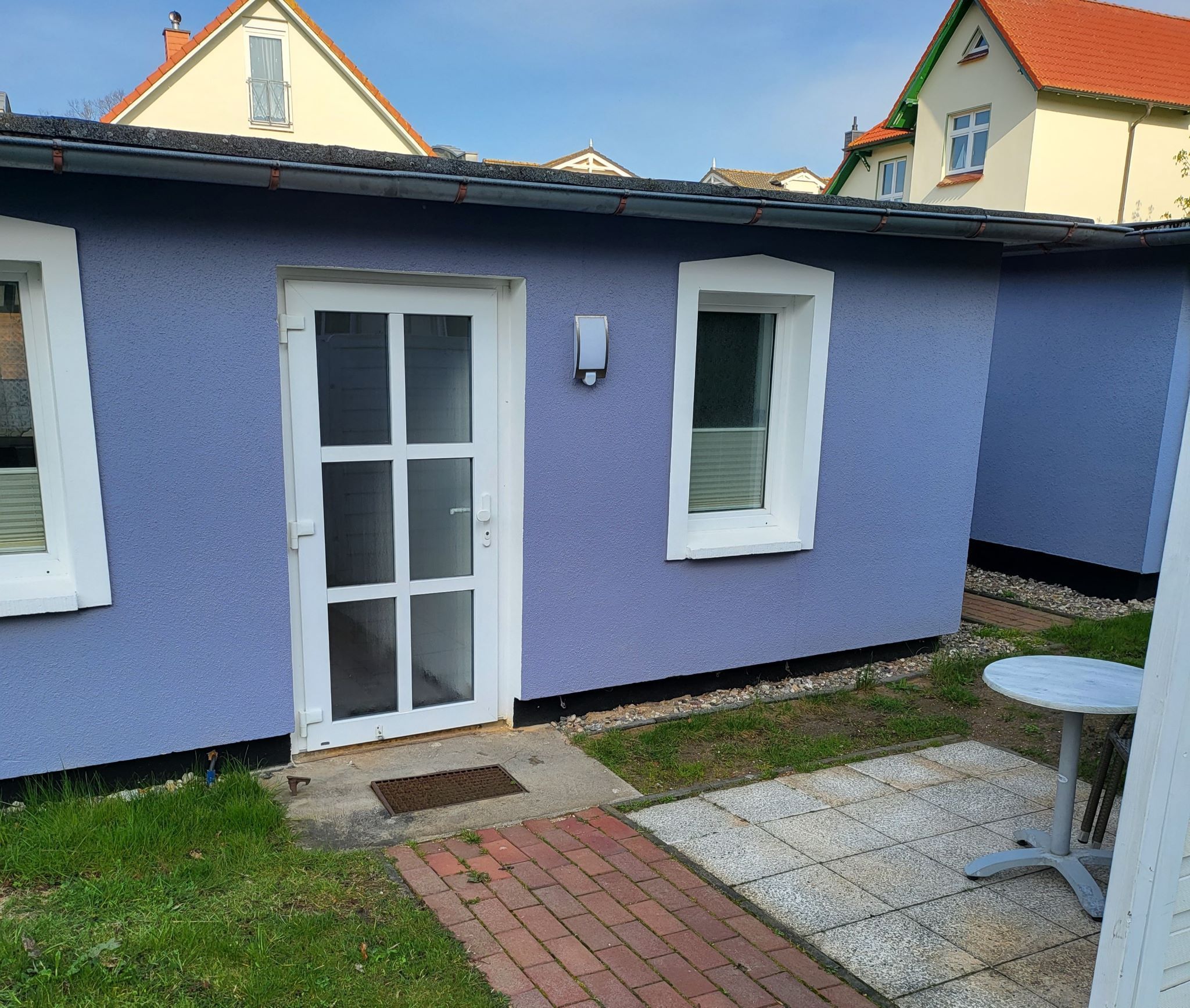 Nur 150 m vom Strand wohnen Sie in einem kleinen 2 Raum-Ferienhaus. Die 35 qm große Wohnung liegt im Erdgeschoss. Das Wohnzimmer ist mit einer Schlafcouch, Couchtisch, Sessel, Anrichte, mit Kabel-TV, Radio, Essbereich (Tresen mit Hocker) und Küchenzeile ausgestattet. Die Terrasse mit Tisch und Stühle geht zur Ostseite. Im Schlafzimmer stehen ein Doppelbett und ein Kleiderschrank. Die Küchenzeile wurde ausgestattet mit Mikrowelle, Kühlschrank, Kaffeemaschine, 2 Platten-Kochfeld, Toaster und Wasserkocher. Das Bad mit Dusche und WC komplettiert das kleine Ferienhaus.