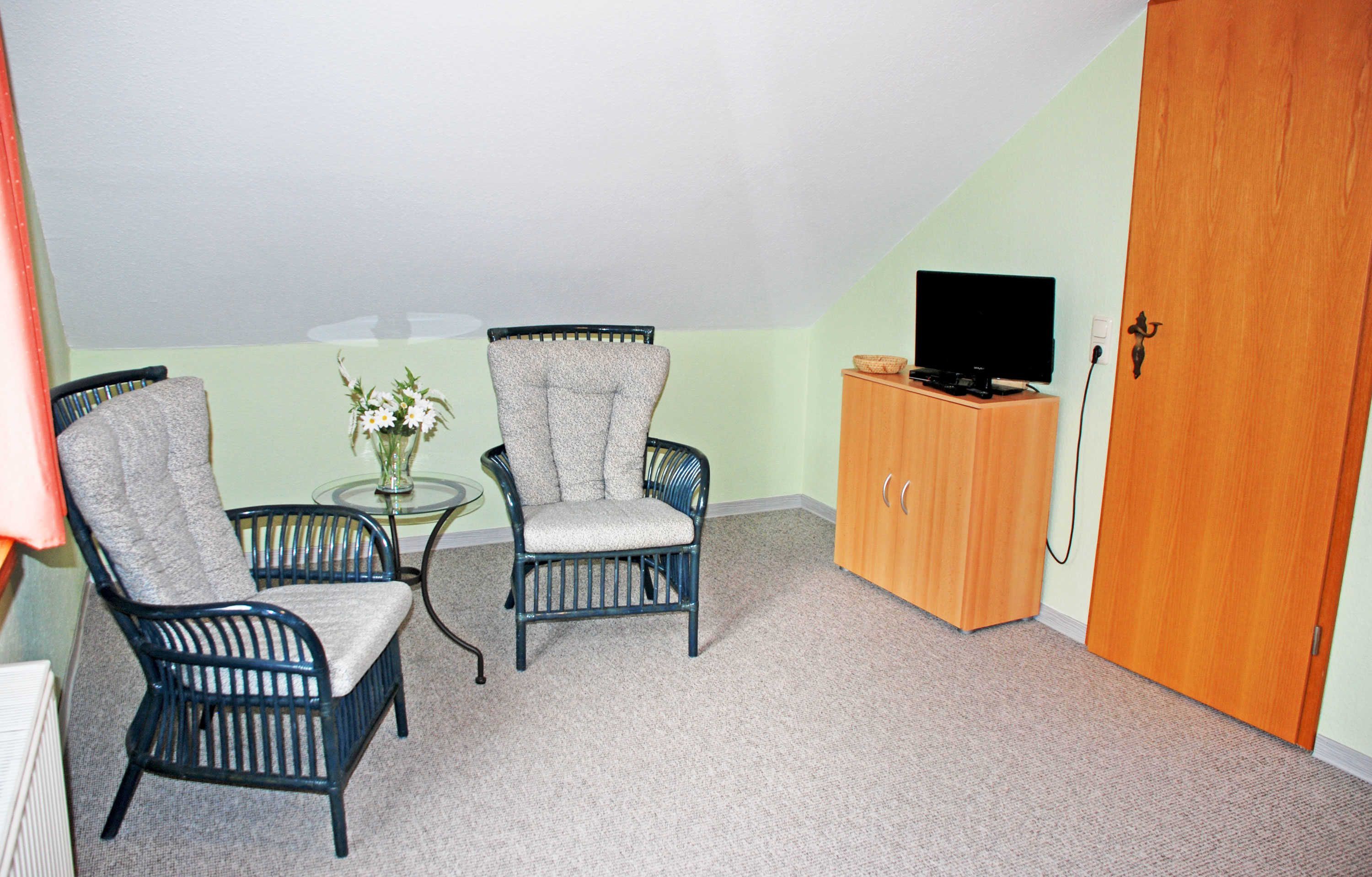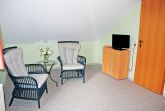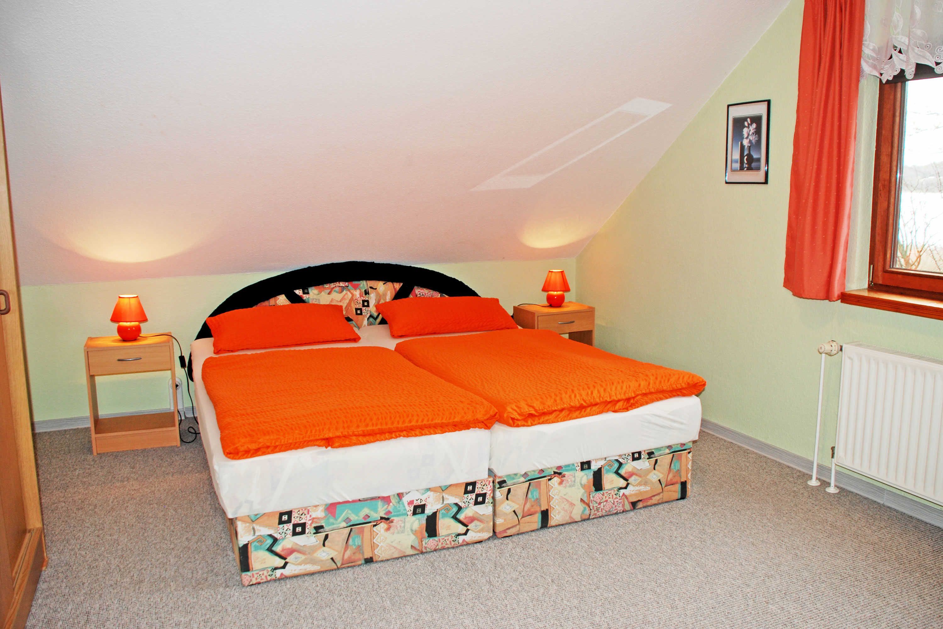 Das Dachgeschoss erreichen Sie über eine kleine Wechselstufentreppe. Hier befinden sich ein weiteres Schlafzimmer mit Doppelbett, Nachttischen und Leselampen, Flachbild-TV sowie Kleiderschrank. Hier kann für eine fünfte Person ein Zustellbett bereit gestellt werden. Aus diesem Zimmer haben Sie einen schönen Ausblick auf den Selliner See. Ein kleines Kinderreisebett und ein Hochstuhl können auf Wunsch kostenlos bereit gestellt werden.