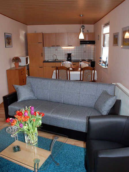 Das komfortabel eingerichtete Ferienhaus Adelheid mit Seeblick ist ca. 68 qm groß und ist für max. 5 Erwachsene ausgestattet. Im Wohnraum befinden sich eine bequeme Sitzcouch mit Tisch und ein TV-Gerät. Hier steht auch ein Esstisch mit Stühlen. Die moderne Küchenzeile ist mit einem Herd, Backofen, Abzugshaube, Wasserkocher, Kaffeemaschine, Toaster und Kühlschrank komplett ausgestattet. Das erste Schlafzimmer im Erdgeschoss verfügt über ein bequemes Doppelbett mit Nachttischen und Leselampen sowie einen Kleiderschrank.