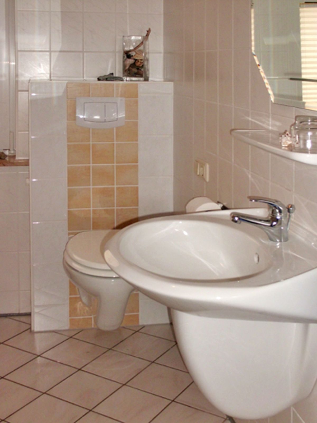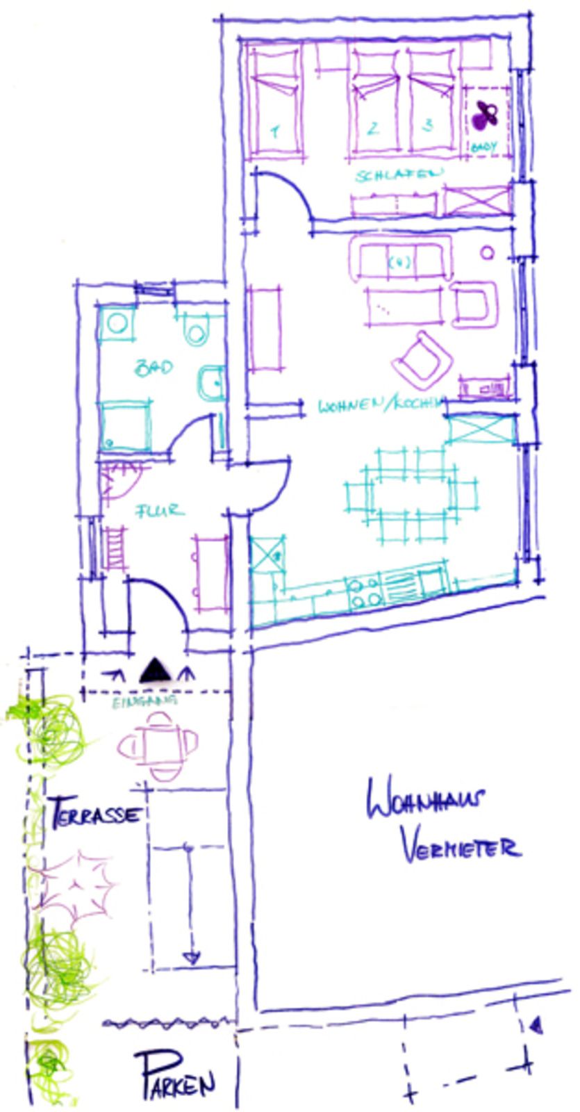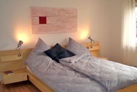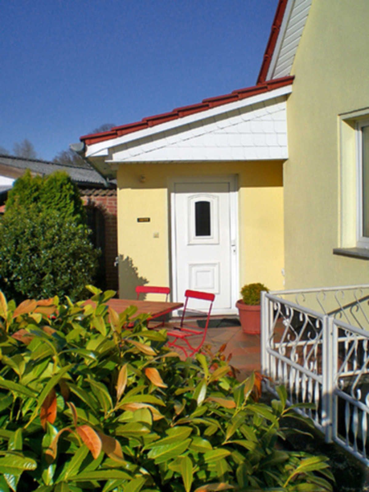 Neben dem Hauptgebäude befindet sich der Zugang zur Ferienwohnung. Die Wohnung ist von der Straße abgewandt und hat Blick zum Innenhof. Die Einrichtung ist modern und gemütlich. Eine kleine Grillecke vor dem Eingang sowie ein Parkplatz unmittelbar am Haus stehen ebenfalls zur Verfügung.