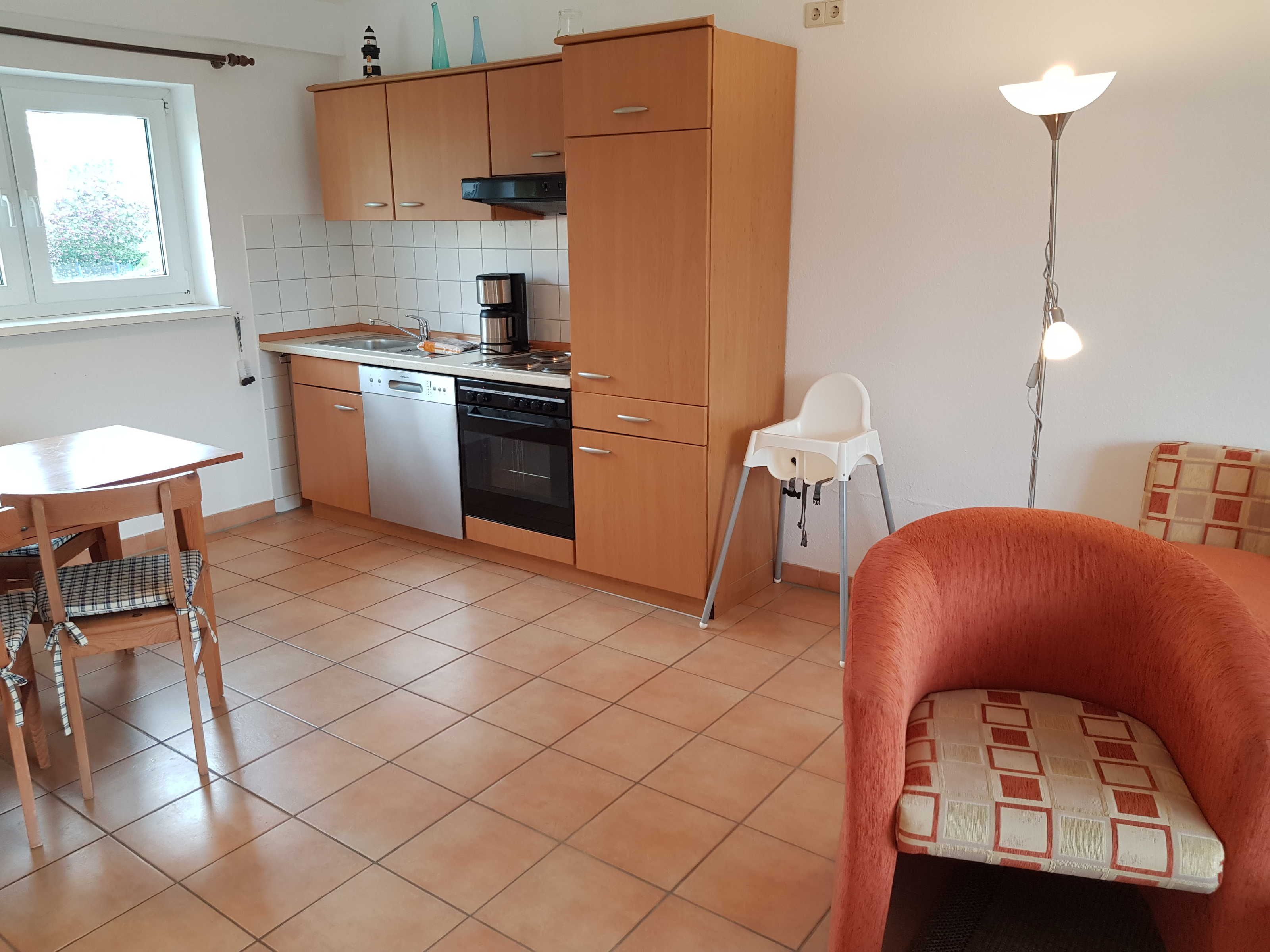 • Wohnzimmer mit Couch sowie einer gut ausgestatteten Küchenzeile mit Geschirrspüler und Backofen