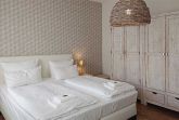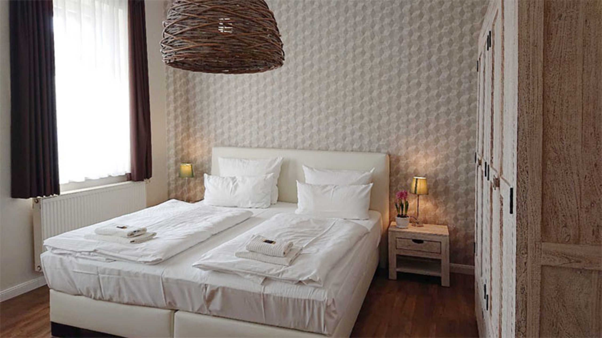 Das 1,80 Meter breite Doppelbett und ein Kleiderschrank komplettieren die Einrichtung.