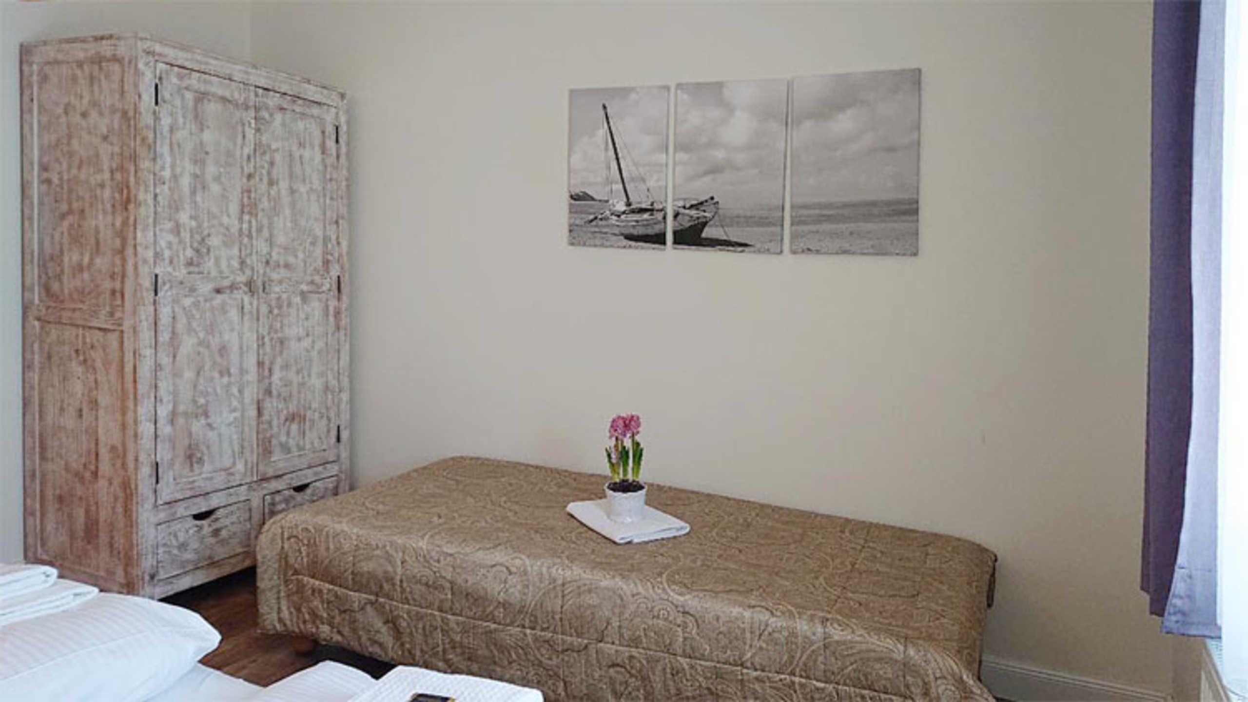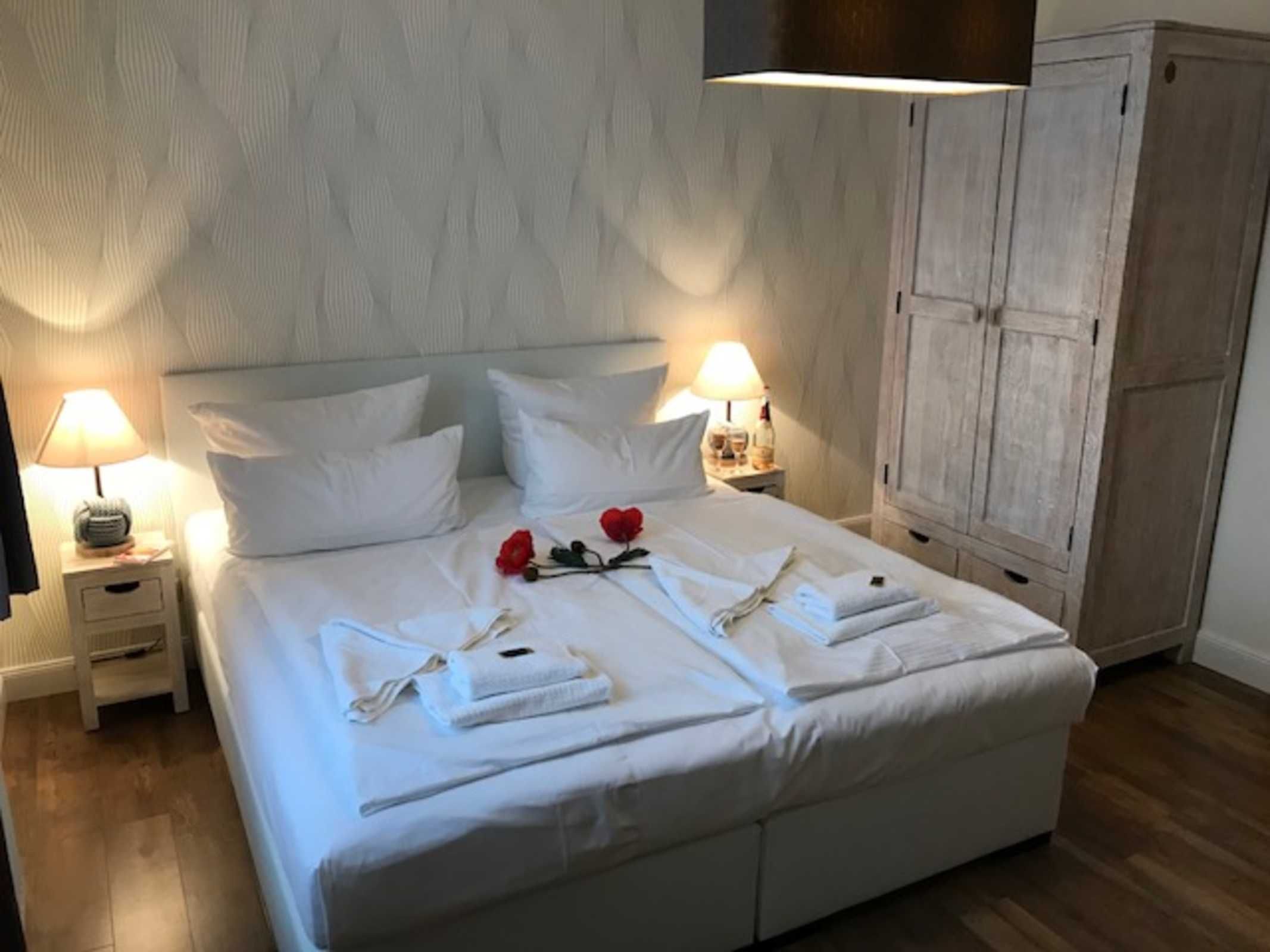 Das 1,80 Meter breite Doppelbett und ein Kleiderschrank komplettieren die Einrichtung.