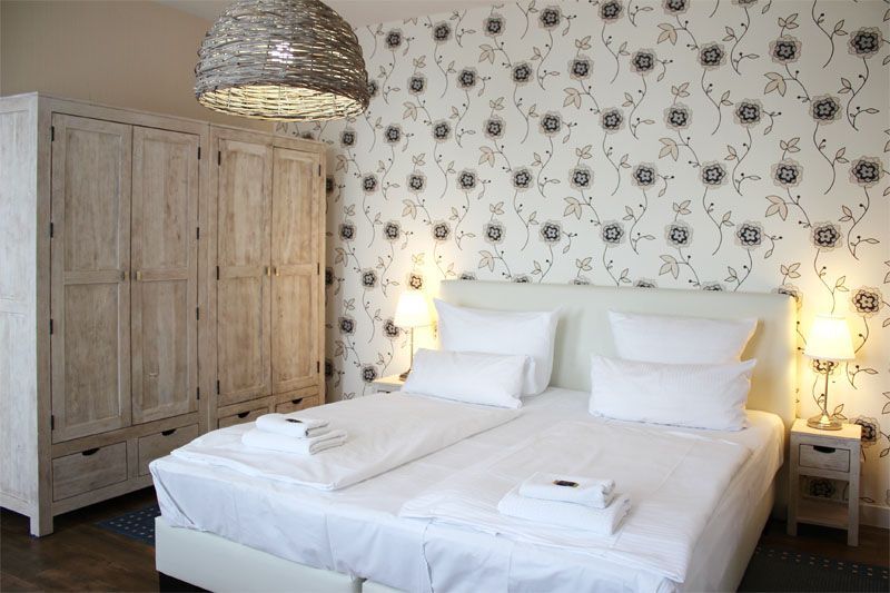Das 1,80 Meter breite Doppelbett und ein Kleiderschrank komplettieren die Einrichtung.