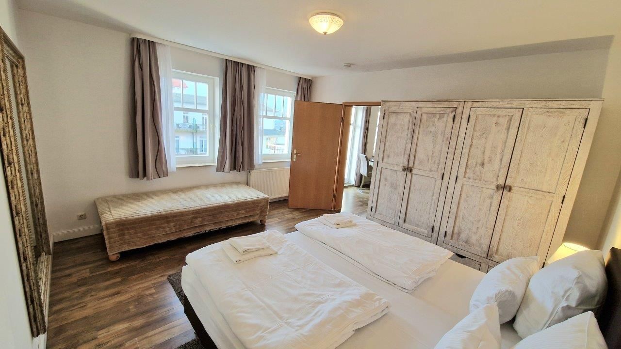 Das 1,80 Meter breite Doppelbett und ein Kleiderschrank komplettieren die Einrichtung.