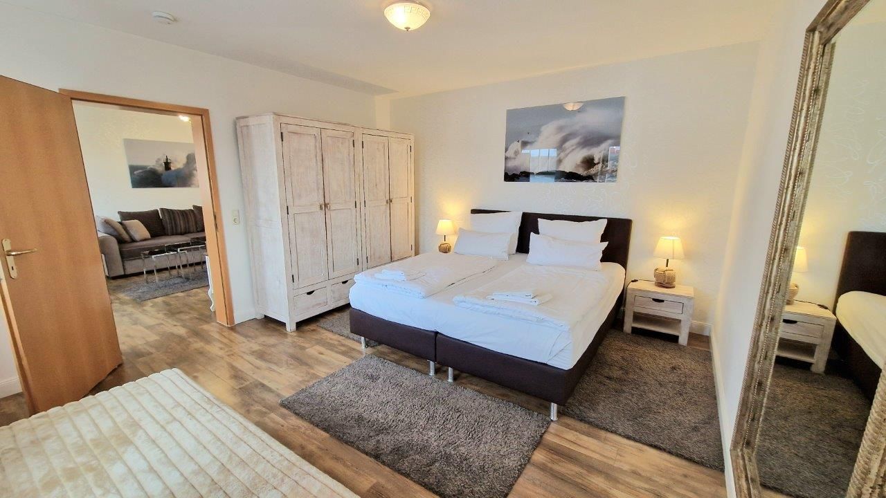 Das separate Schlafzimmer verfügt über ein Doppelbett, mindestens 1,80 Meter breit, und einen geräumigen Kleiderschrank.