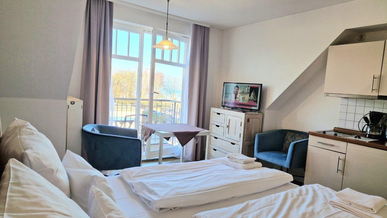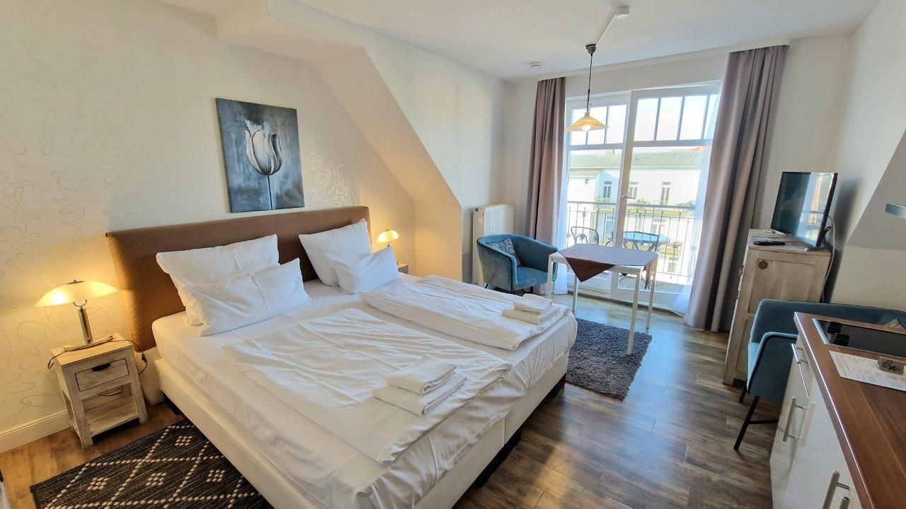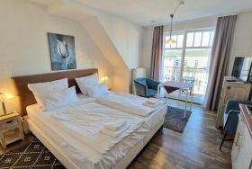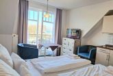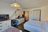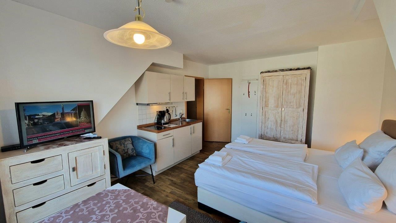 Unsere Einraumappartements für bis zu zwei Personen bieten auf etwa 30 m² Wohnfläche alles, was einen zwanglosen Aufenthalt ausmacht. Eine kleine Küchenpantry ermöglicht die Zubereitung kleiner Mahlzeiten. Kaffeemaschine, Toaster und Wasserkocher sind vorhanden. Genießen Sie ein gemütliches Frühstück am Esstisch mit Stuhlsesseln, bei warmen Temperaturen vielleicht auf dem Balkon?