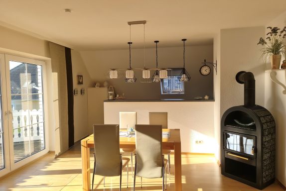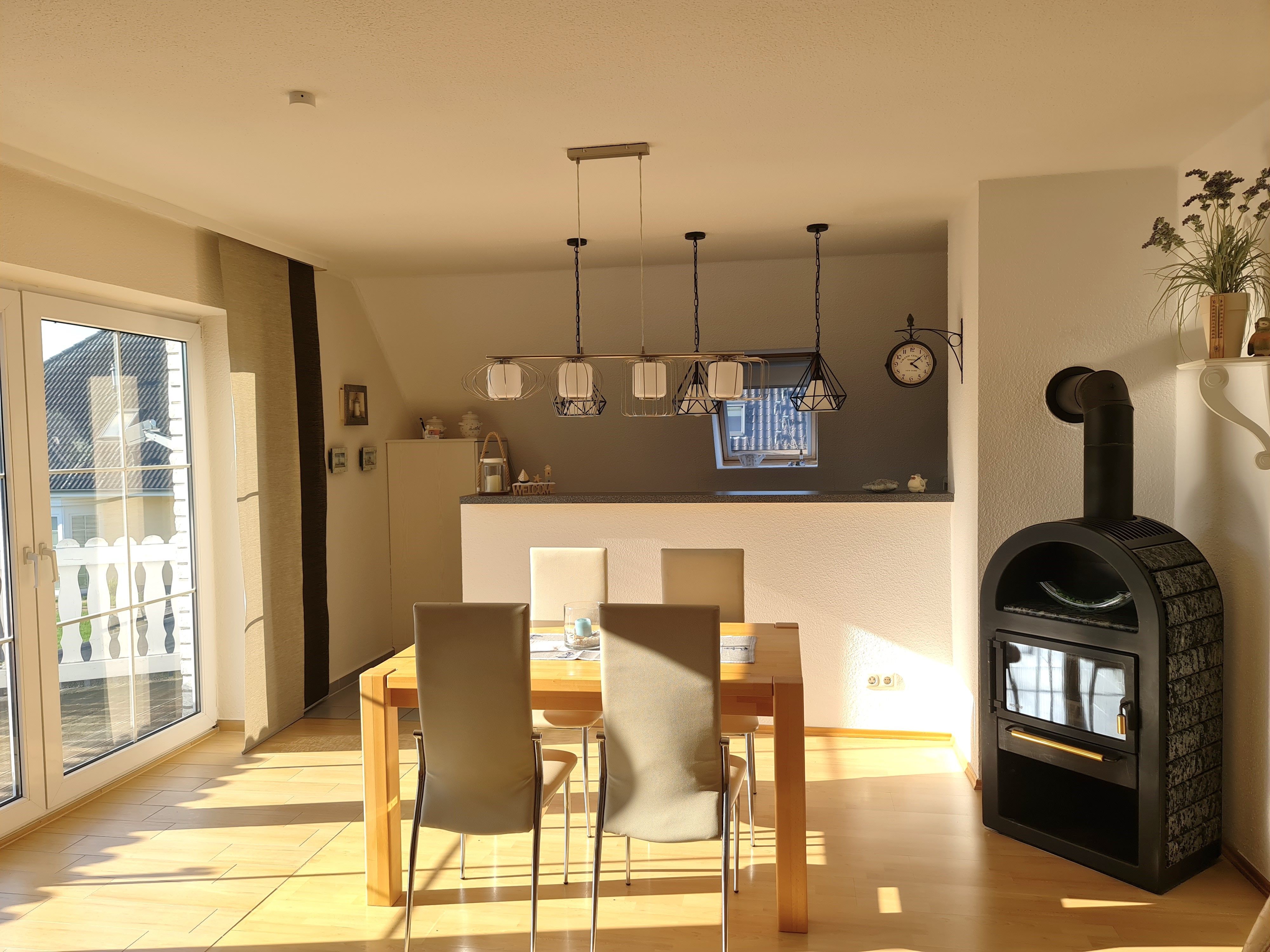 Wohnraum mit Essecke, Sofa, Kaminofen (nicht nutzbar), Tisch, Schränken