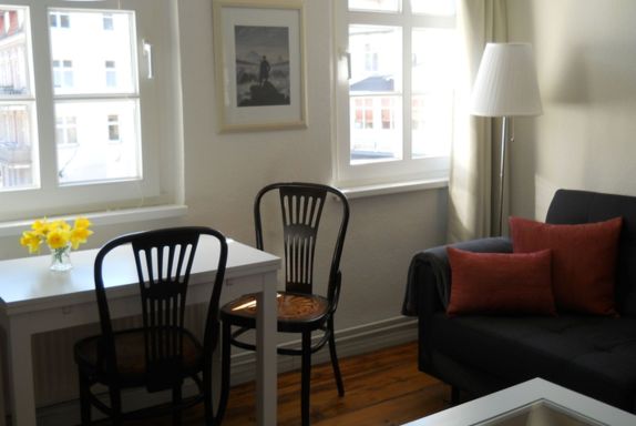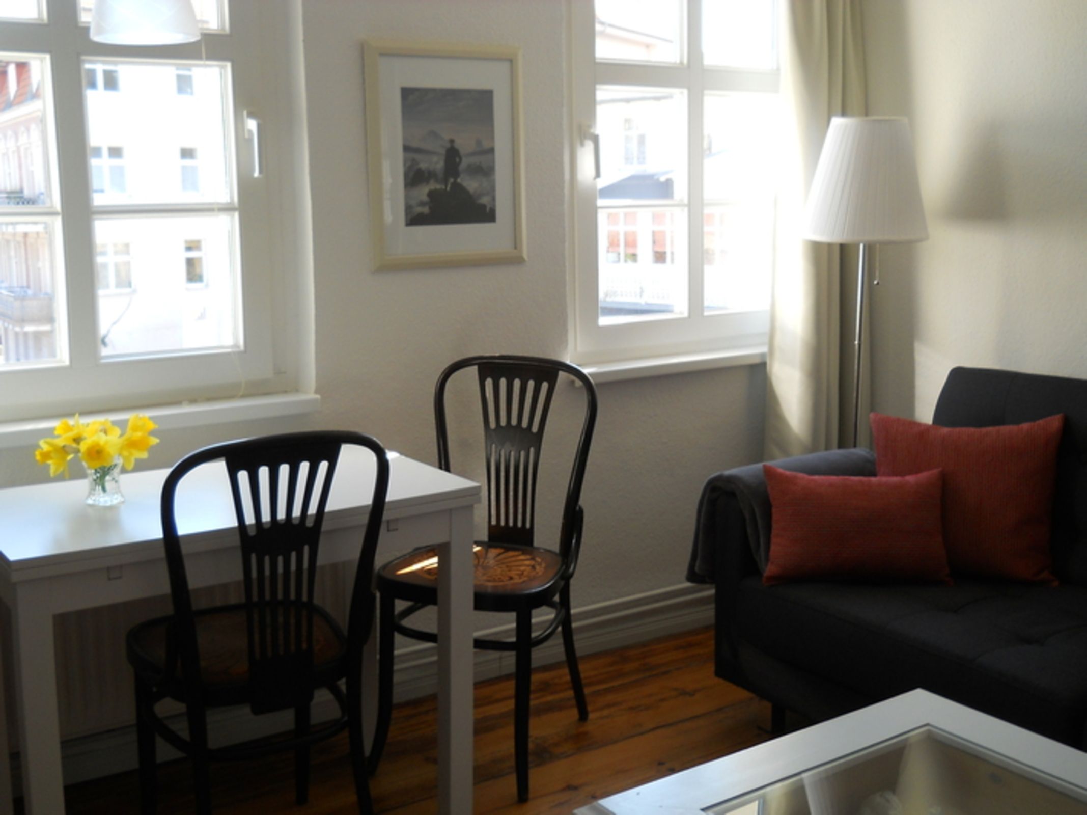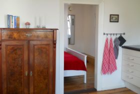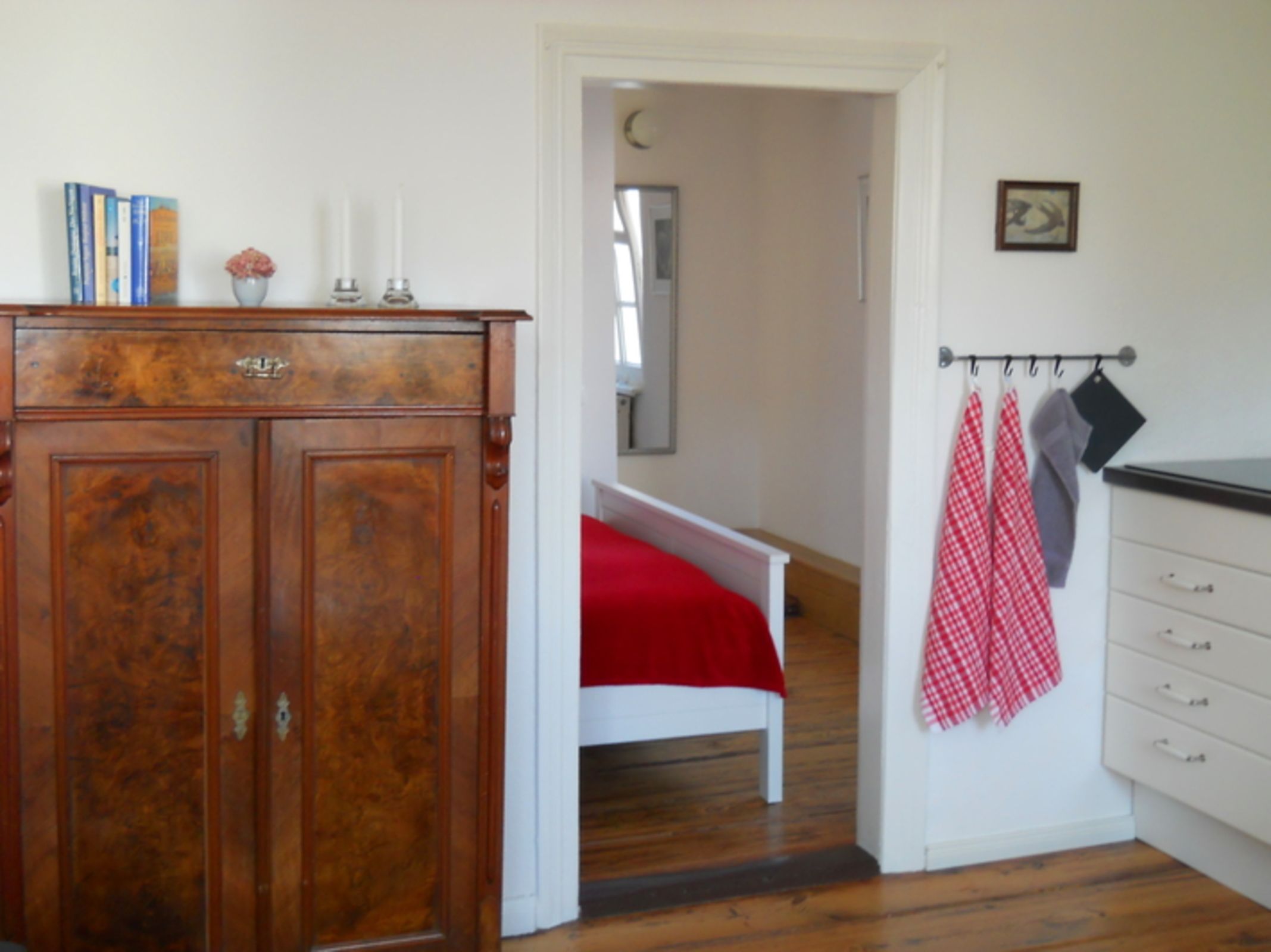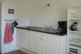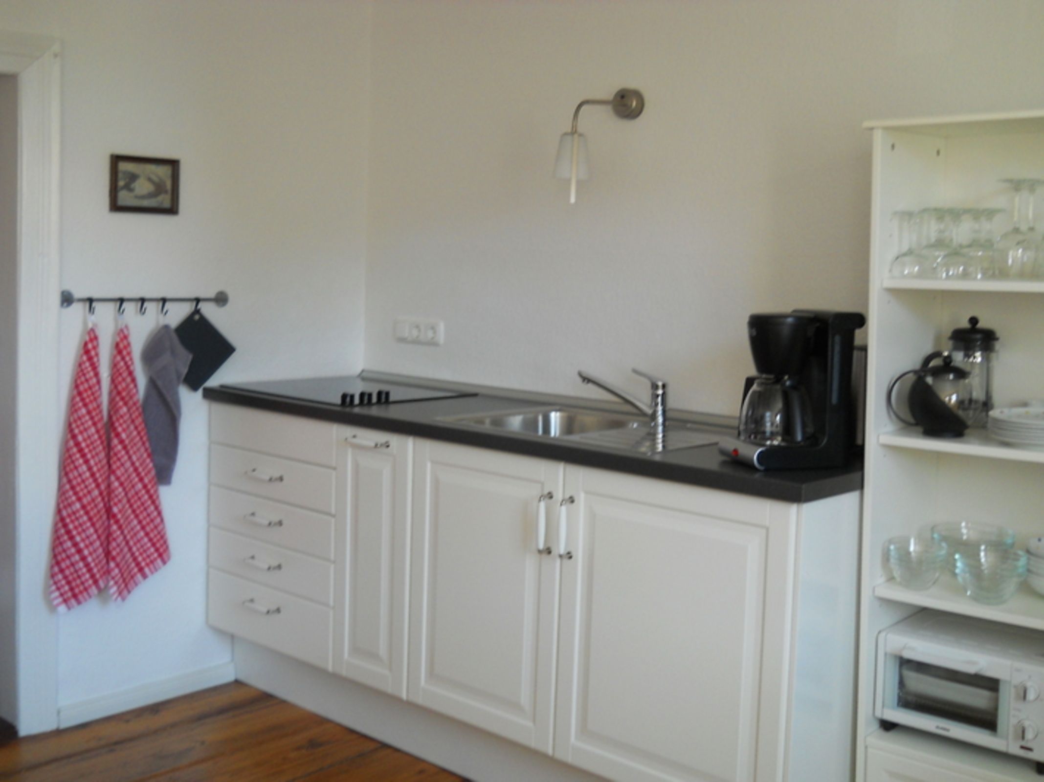 - ein großes helles Wohnzimmer mit Meerblick von 16 qm mit einer Essecke, Schlafcouch mit TV-Sat und einer voll eingerichteten Küchenzeile (Herd mit 3 Ceranfeldern, Kühlschrank,Tiefkühlfach, Toaster, Kaffeemaschine, Wasserkocher, Mini-Backofen); ein historischer Wandschrank bildet eine kleine Garderobe