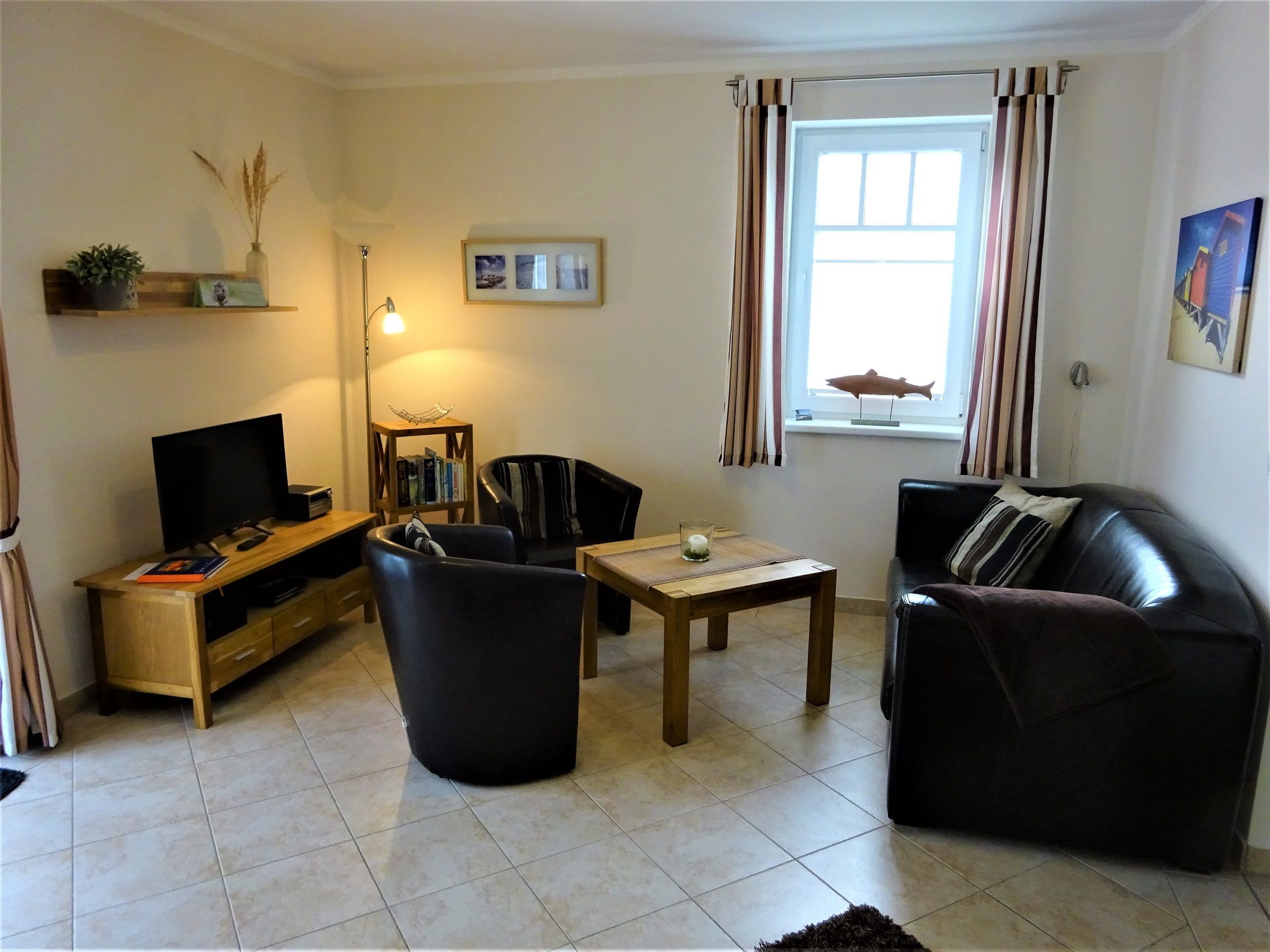 Die nur ca. 150 m vom Badestrand entfernte, gemütliche Erdgeschosswohnung wurde 2011 errichtet. Sie bietet Platz für max. vier Erwachsene und ein Kind (bis drei Jahre) und verfügt neben einer voll möblierten Terrasse auch über einen Garten. Durch die rückwärtige Lage in einer Sackgasse sind Kinder hier besonders geschützt. Genießen Sie die moderne und komfortable Ausstattung im geschmackvollen Wohnzimmer mit offener Wohnküche. Die hochwertige Küche ist umfangreich ausgestattet. Das geräumige Schlafzimmer verfügt über ein großes Doppelbett. Ein kleinerer behaglicher Schlafraum bietet zwei weitere Schlafmöglichkeiten (Ausziehbett). Ein modernes Duschbad rundet die liebevolle Einrichtung der Wohnung ab. Die in der gesamten Wohnung verlegte Fußbodenheizung und ein Kaminofen machen Ihren Urlaub auch im Winter traumhaft gemütlich (Kaminholz wird nicht gestellt.)