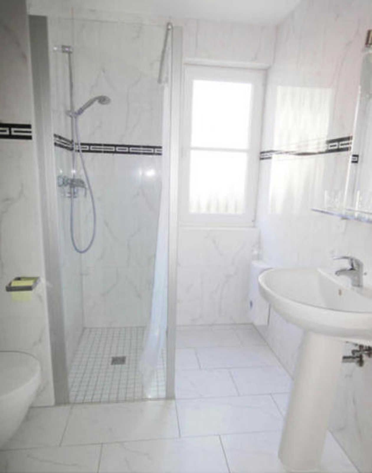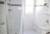 Das Bad mit Fenster und Fußbodenheizung hat eine bodengleiche Dusche, ein WC und eine Waschmaschine.