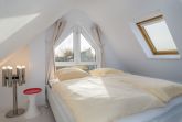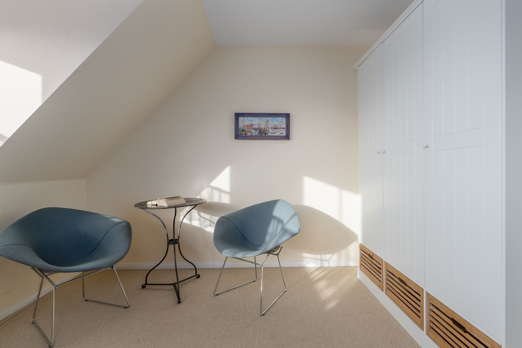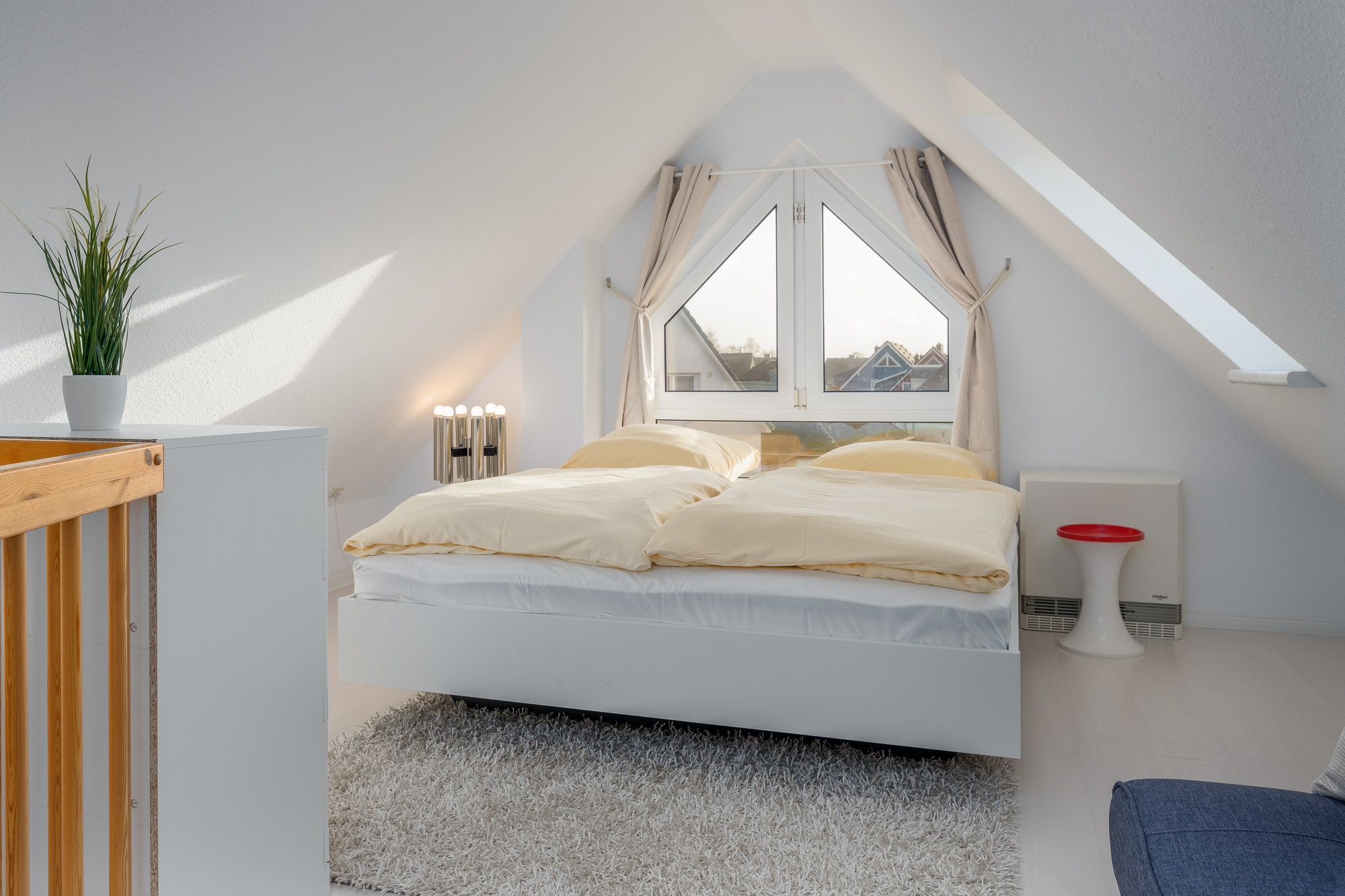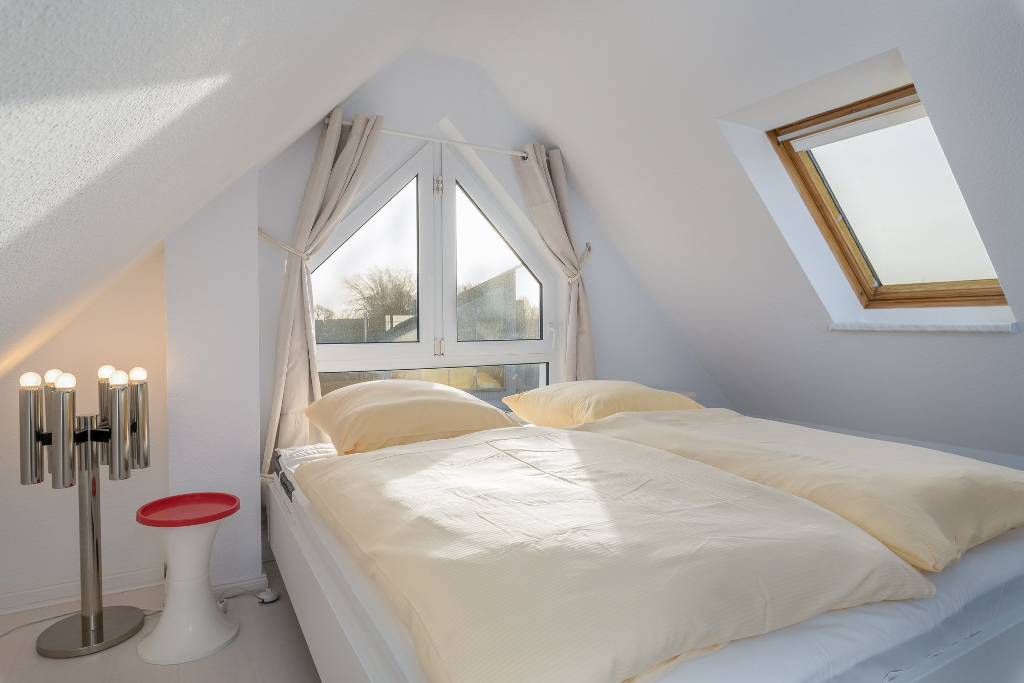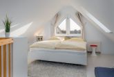 Im Schlafzimmer der ersten Etage befinden sich ein Doppelbett (zwei Matratzen mit 180 x 200 cm Topper), ein Kleiderschrank, ein kleiner Wäscheschrank, ein Standspiegel, ein kleiner TV (Satellitenanlage) sowie ein kleiner Bistrotisch mit zwei Sesseln für die kleine Pause zwischendurch. Im kleineren Zimmer der ersten Etage erwarten Sie ein Einzelbett mit den Maßen 100 x 200 cm und eine Kommode. Im anderen, etwas größeren Zimmer sorgen ein Doppelbett (140 x 200 cm), zwei Kommoden und Leselämpchen am Bett für eine gelungene Nachtruhe. In der Galerie der Dachspitze intergriert ist ein lauschiges Schlafzimmer mit Doppelbett (180 x 200 cm / zwei Matratzen / einzelne Topper), Sideboard, verdunkelbaren Dachflächenfenstern und Giebelfenster mit Vorhang. Ein Wäscheset kann pro Person kostenpflichtig zugebucht werden.