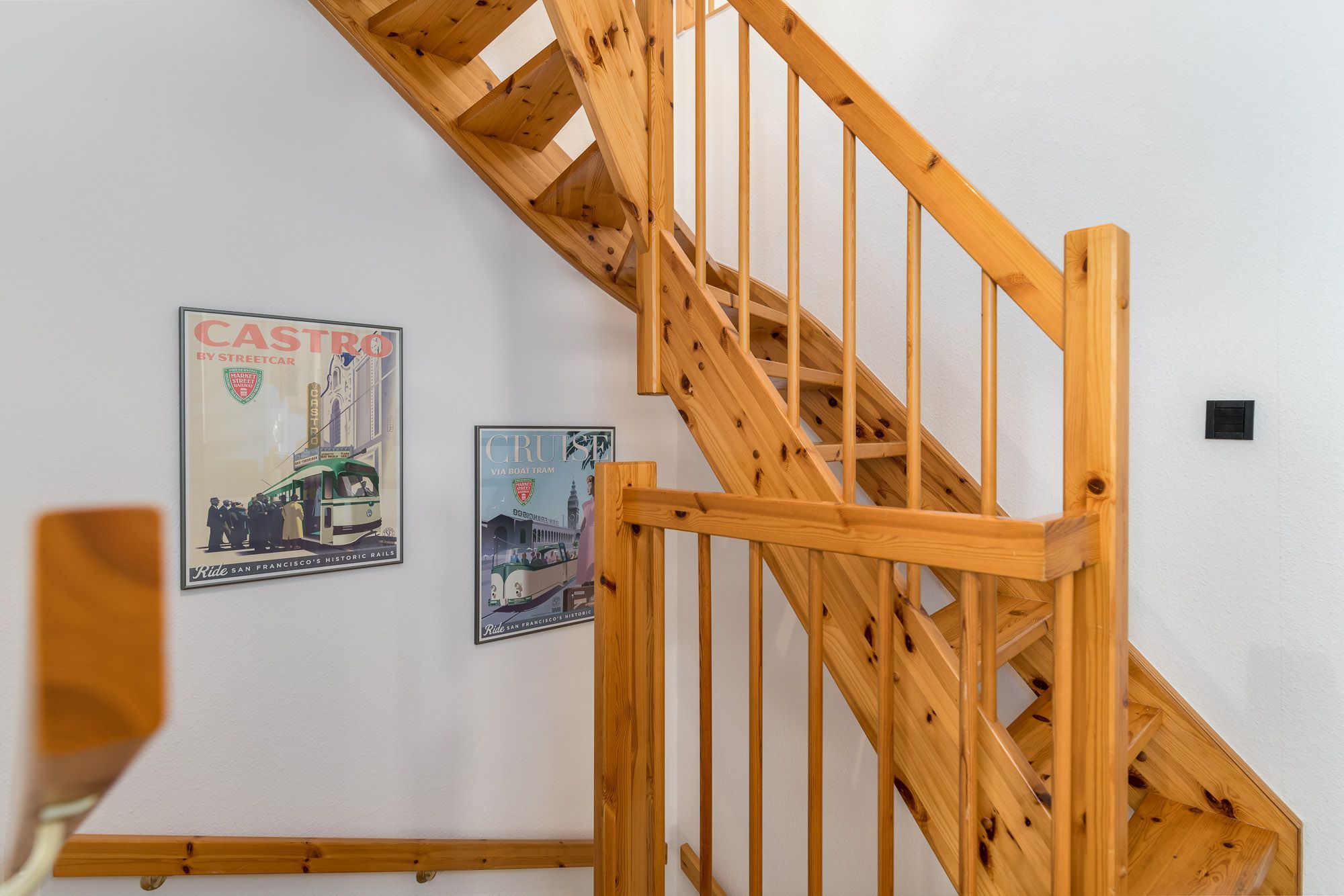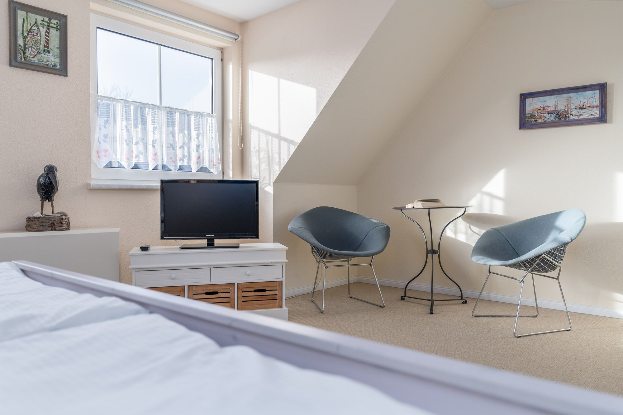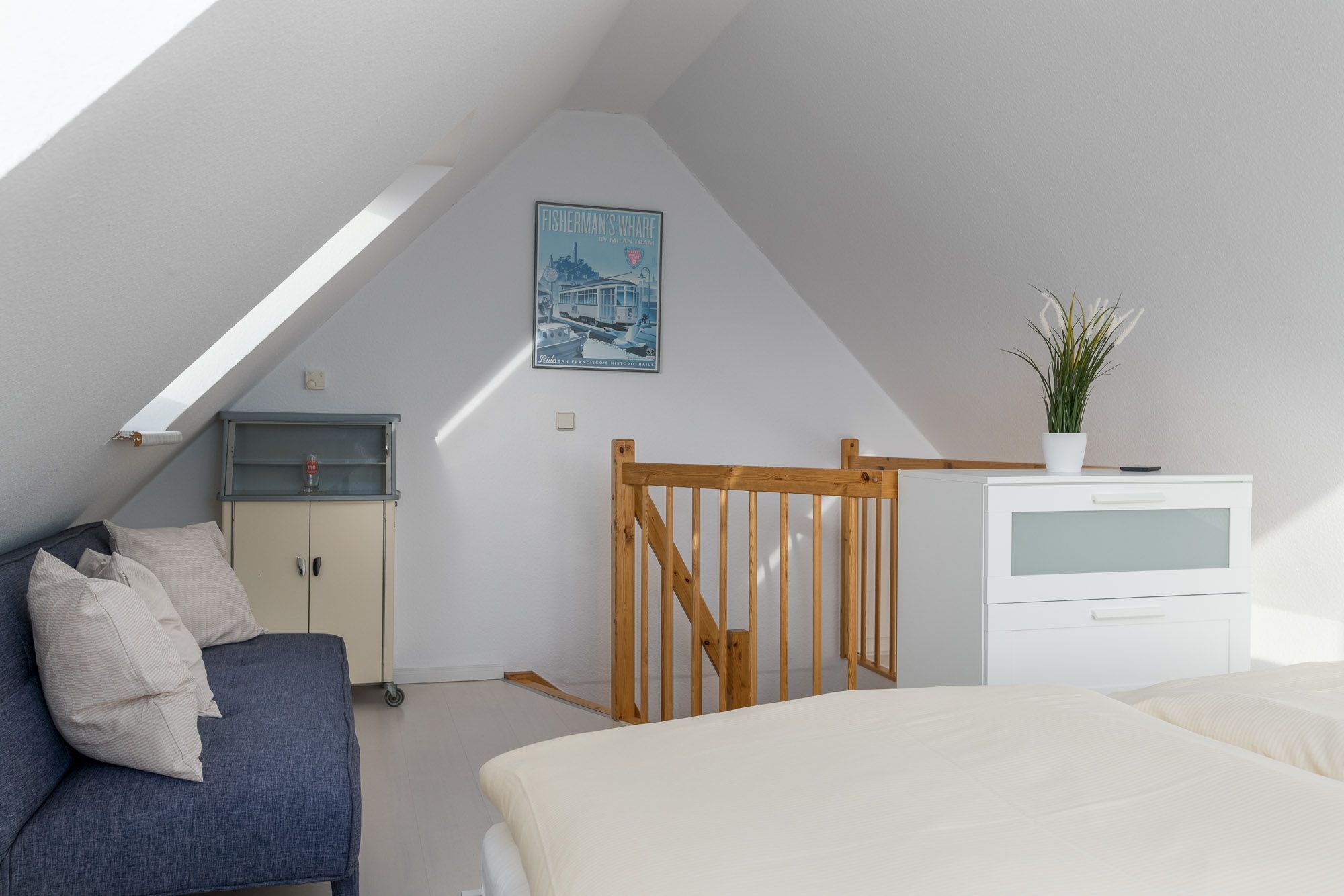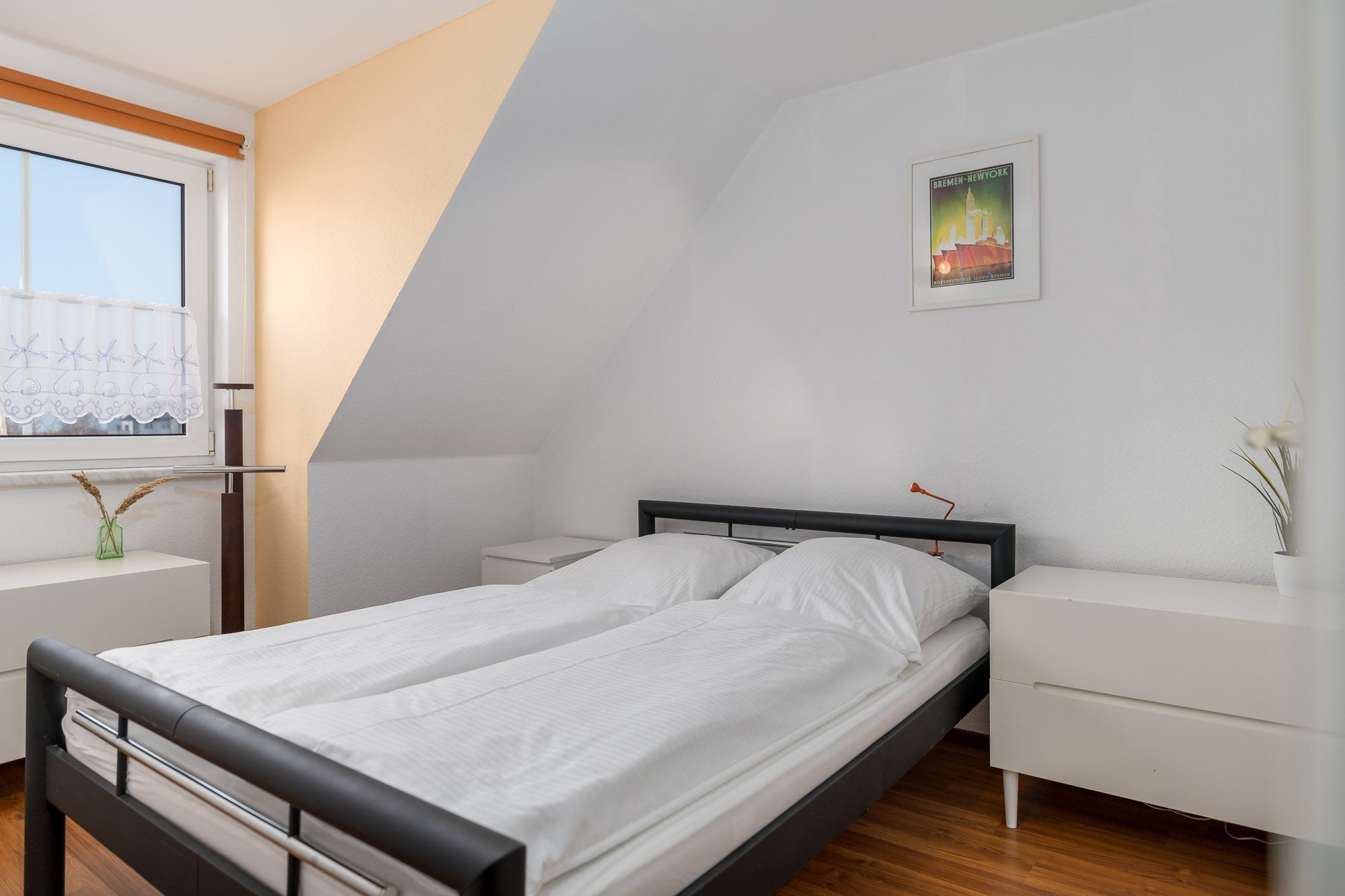 Im Schlafzimmer der ersten Etage befinden sich ein Doppelbett (zwei Matratzen mit 180 x 200 cm Topper), ein Kleiderschrank, ein kleiner Wäscheschrank, ein Standspiegel, ein kleiner TV (Satellitenanlage) sowie ein kleiner Bistrotisch mit zwei Sesseln für die kleine Pause zwischendurch. Im kleineren Zimmer der ersten Etage erwarten Sie ein Einzelbett mit den Maßen 100 x 200 cm und eine Kommode. Im anderen, etwas größeren Zimmer sorgen ein Doppelbett (140 x 200 cm), zwei Kommoden und Leselämpchen am Bett für eine gelungene Nachtruhe. In der Galerie der Dachspitze intergriert ist ein lauschiges Schlafzimmer mit Doppelbett (180 x 200 cm / zwei Matratzen / einzelne Topper), Sideboard, verdunkelbaren Dachflächenfenstern und Giebelfenster mit Vorhang. Ein Wäscheset kann pro Person kostenpflichtig zugebucht werden.