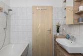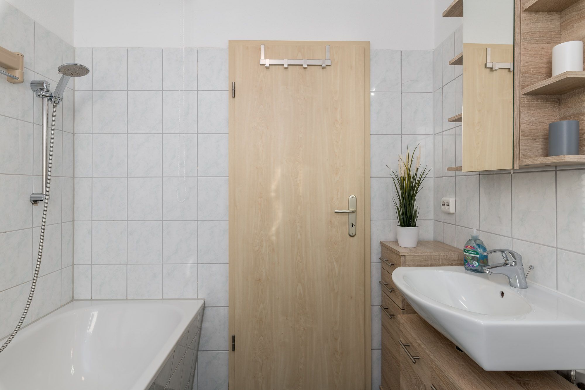 Das Badezimmer ist mit einer Badewanne, einem Waschtisch und Haartrockner ausgestattet.