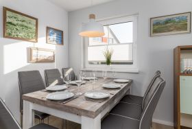 Die Küche bestehend aus Kühl-/Gefrierkombination, Cerankochfeld, Dunstabzughaube, Geschirrspülmaschine, Mikrowelle, Toaster, Kaffeemaschine und Wasserkocher verlockt zum gemeinsamen Kochen und Schlemmen. Ein zusätzlicher Esstisch mit fünf Stühlen bietet zusätzliche Arbeitsfläche.