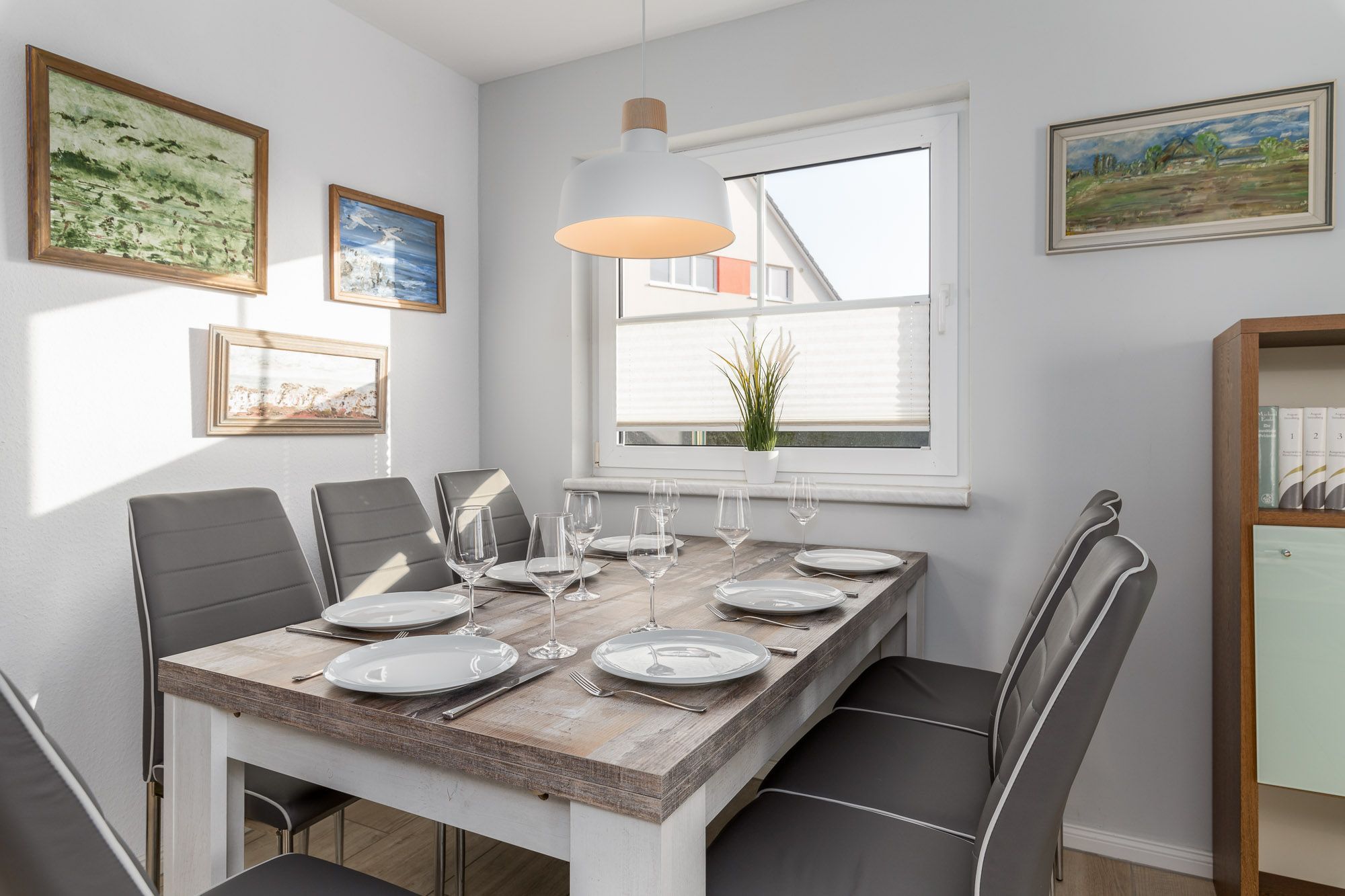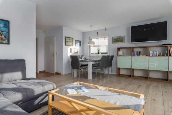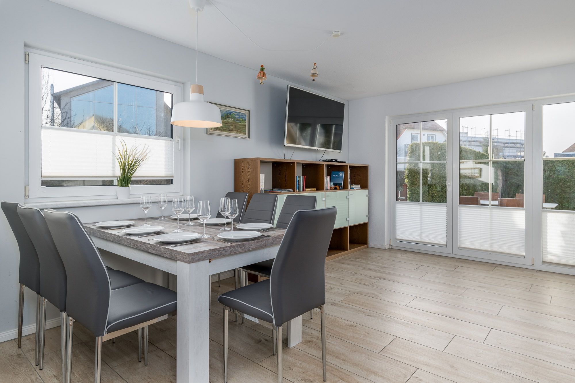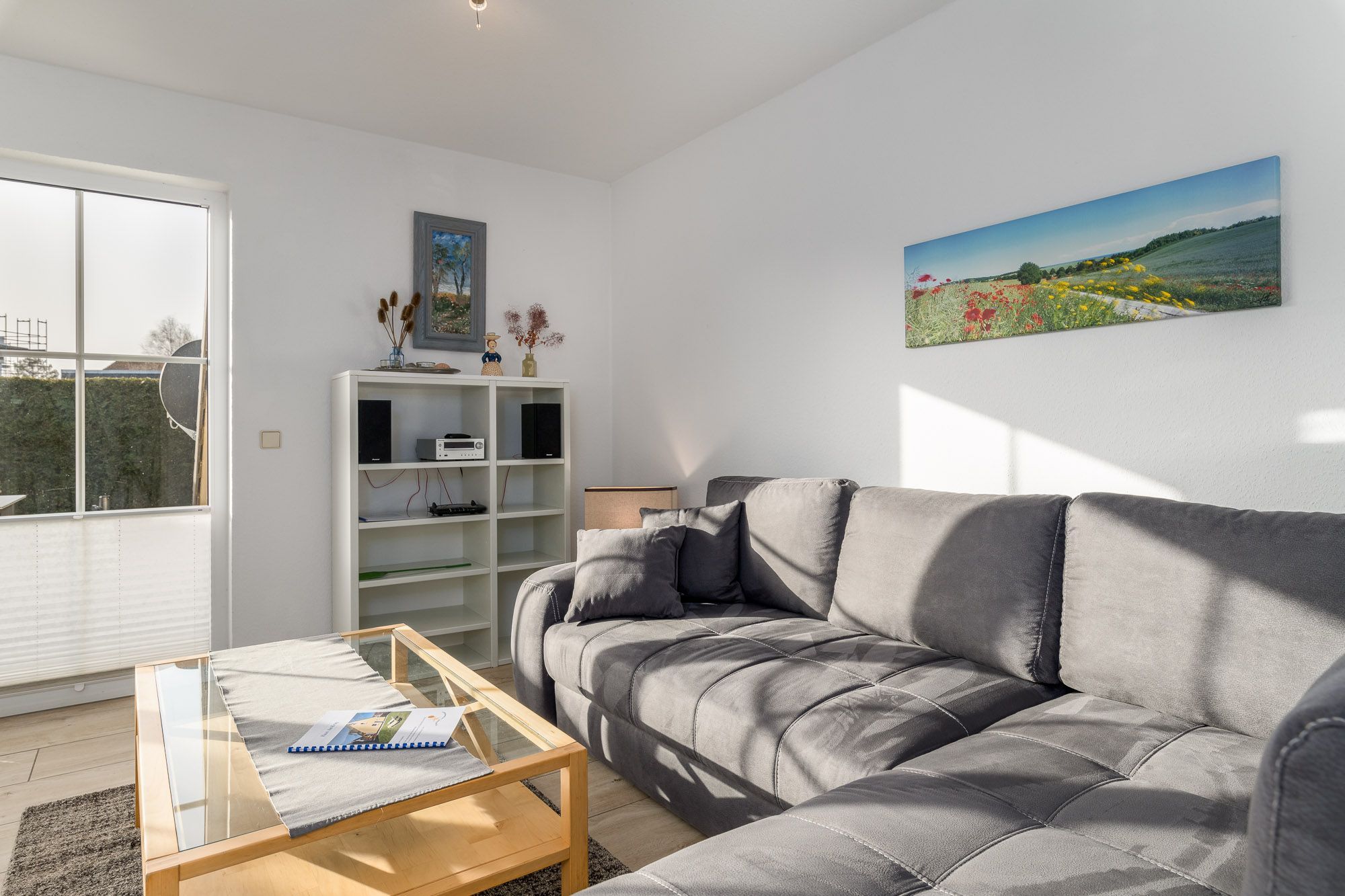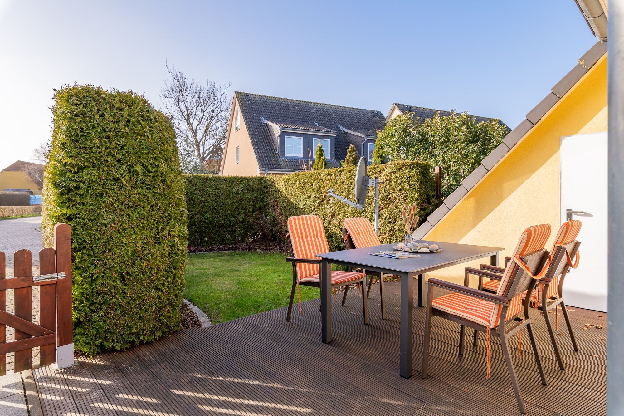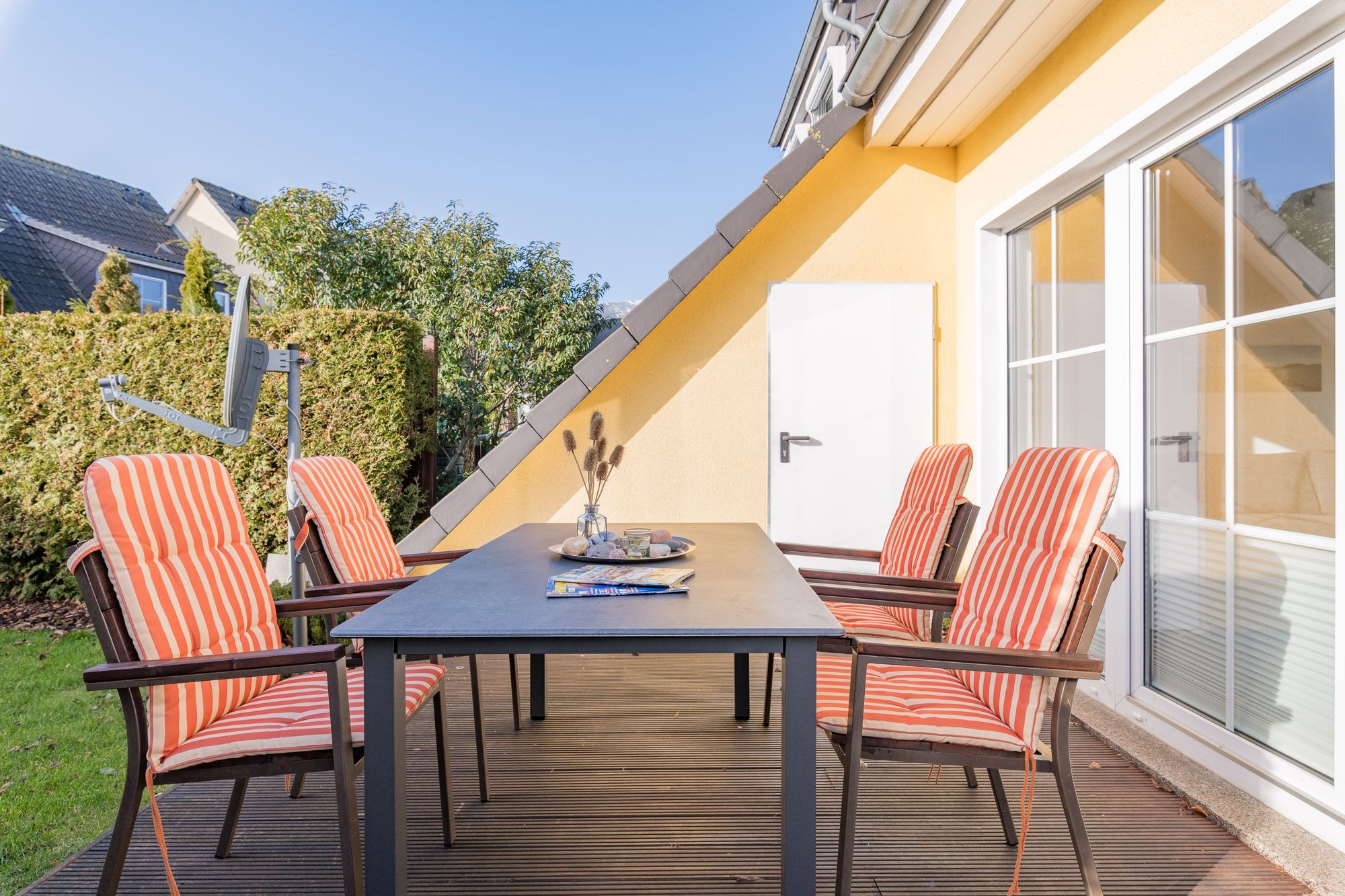 Das lichtdurchflutete Wohnzimmer mit großzügiger Eckcouch und einem Ausziehtisch ist optimal für große Gruppen bis zu sieben Personen eingerichtet. Ein 55 Zoll Flatscreen und eine kleine Kompakt-HiFi-Anlage (externe Medien anschließbar) sorgen für bunte Unterhaltung. Von hier gelangen Sie auf die Terrasse. Hier lädt eine Austattung mit Möbeln, Sonnenschirm und vorhandenem Holzkohlegrill zu bunten Sommerabenden ein. Die Außenanlage wurde Ende 2021 komplett neu gestaltet.