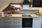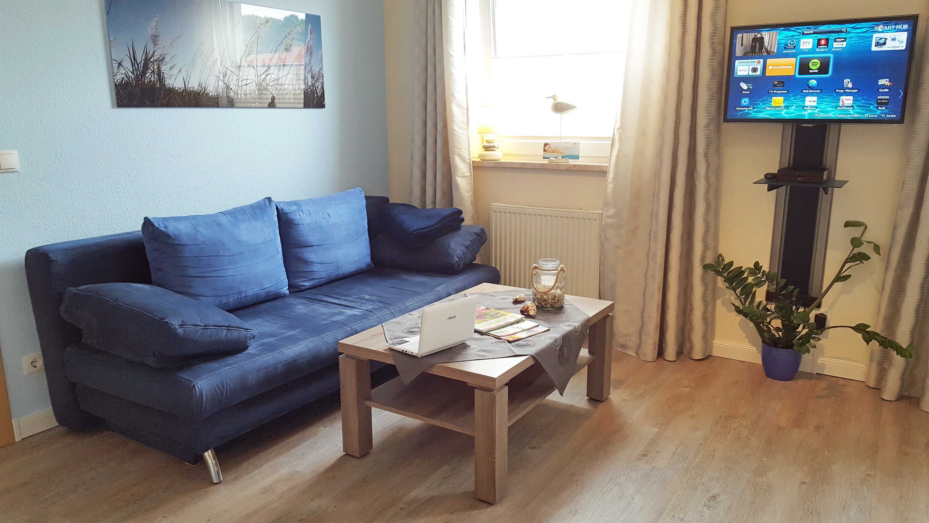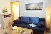 -Wohnzimmer mit Schlafcouch für 1 weitere Personen und gut ausgestattete moderne Küchenzeile mit separatem Essbereich, 1 Schlafzimmer mit Doppelbett (180x200) für 2 Personen und hochwertig ausgestattetes Bad mit Glasdusche