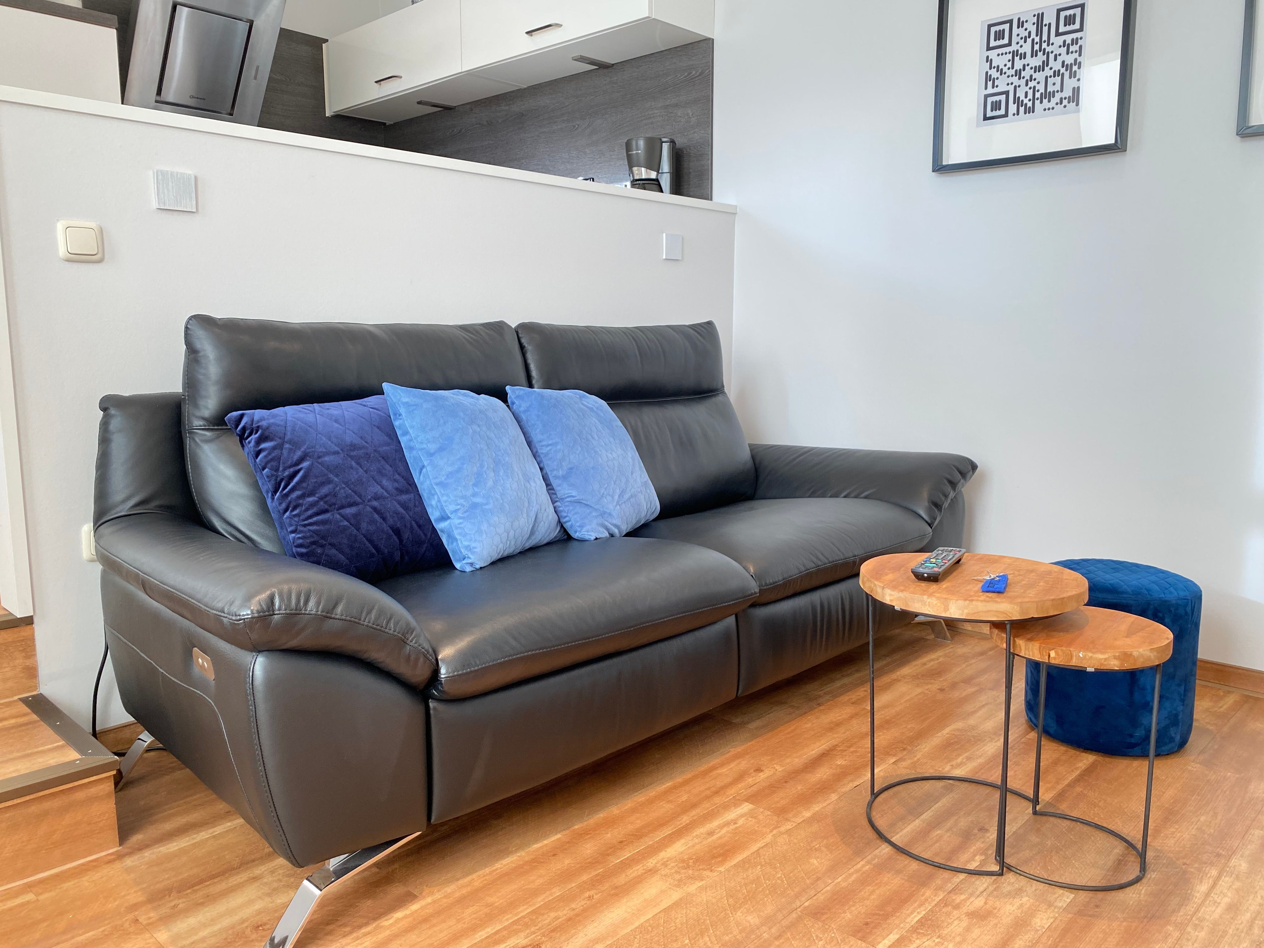Der Wohnraum ist das Highlight der Ferienwohnung: auf der Empore die moderne Komplettküche und mit einer halben Wand abgetrennt, die Couchecke mit TV sowie ein Esstisch in der kleinen Veranda.
