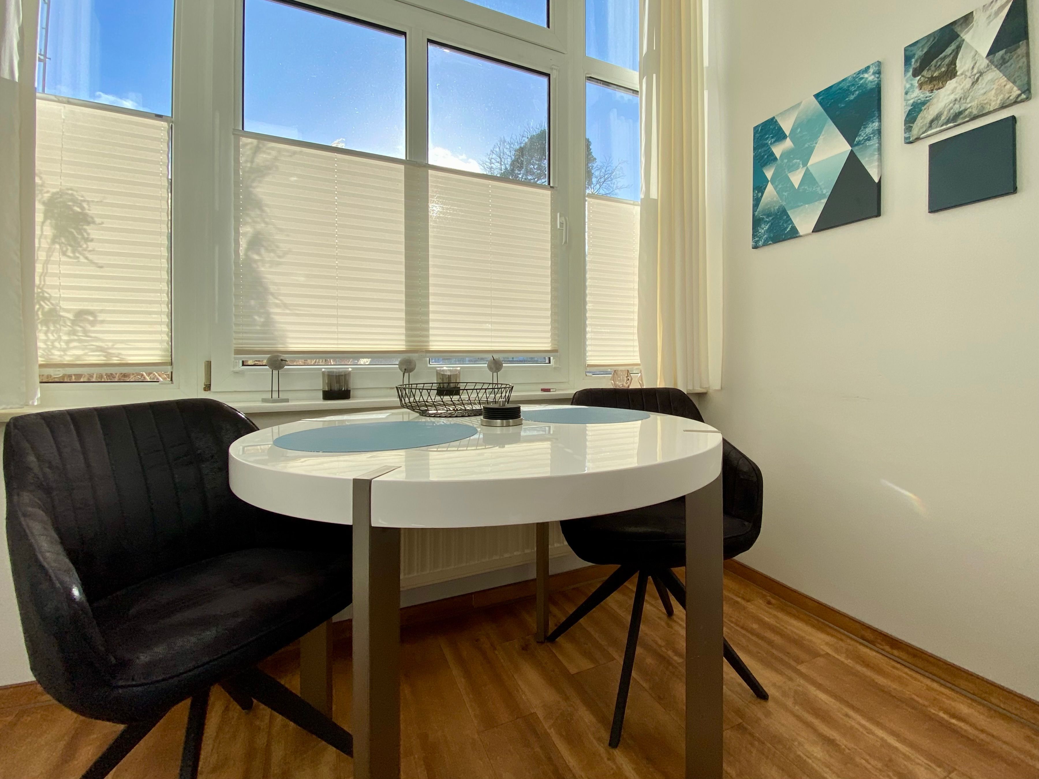 Auch der Anbau der Villa Anna wurde liebevoll saniert. Hier entstanden zwei schöne Ferienwohnungen, im Erdgeschoss die Kleine Anna, die ebenso modern und stilsicher eingerichtet wurde. Auf dem Grundstück gibt es pro Ferienwohnung einen Stellplatz und eine Aufladestation für E-Autos inklusive.