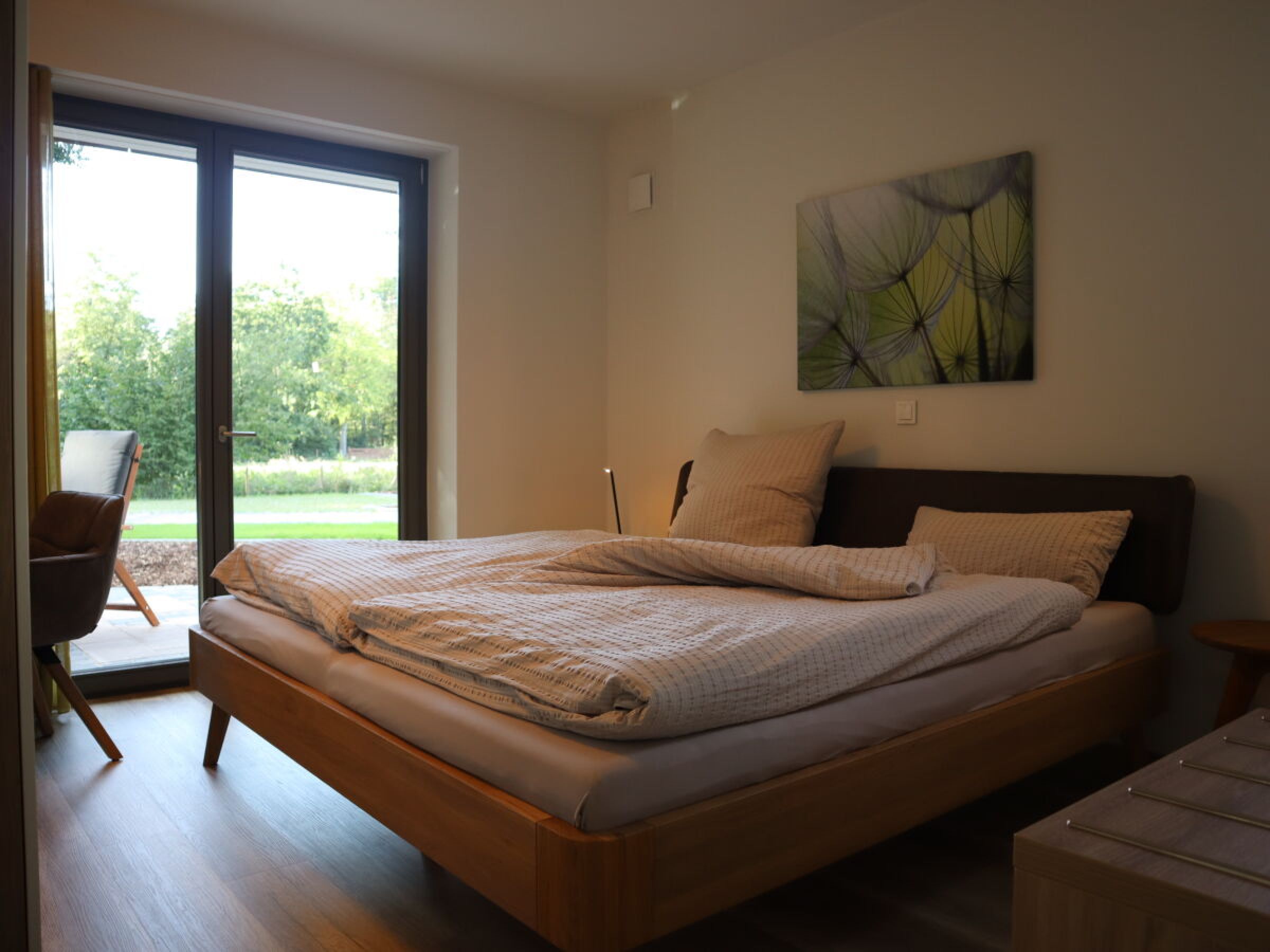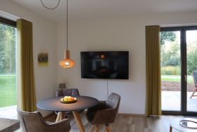 Ferienwohnung im Landschaftsschutzgebiet nahe Zwischenahner Meer. „Es ist wie nach Hause kommen“, dies hörten wir öfter von unseren Gästen, die sich die Ferienwohnungen DREE oder VEER für ihre wertvollen Urlaubstage gewählt hatten. Die DREE ist als einzige der 5 Fewos erdgeschossig gelegen und wäre auch für geh-eingeschränkte Gäste sehr komfortabel. Der von zwei Sonnenseiten lichtdurchflutete Wohn-Essbereich mit offener Küche lädt zu jeder Jahreszeit zum entspannten Aufenthalt ein. Auf der Leder-Récamiere können Sie beide bequem lesen, Musik hören, mit 55“ fernsehen oder einfach nur träumen. Zwei nach Süden und Westen gelegene Terrassen der DREE lassen Sie wunderschön ruhig in Garten-Atmosphäre die (Abend-)Sonne genießen, mit Blick auf Grün Grün Grün :) Das farblich harmonisch geflieste Bad ist – wie die gesamte Ferienwohnung – mit einer Fußbodenheizung ausgestattet. Die wohltuende Wärme dieser Heizung spüren Sie auch besonders in der bodengleichen Dusche. Im ruhigen Schlafzimmer können Sie dann, bei mit Plissee und Behang abgedunkelten Fenstern, neue Energie tanken. Der elektrisch fahrbare Behang (Sonnen-, Sicht- und Mückenschutz) lässt sich auch vom Bett schalten. Dieser Raum verfügt ebenfalls über eine kleine Schreibtischecke mit Strom- und USB-Anschlüssen zum Laden von Handys, Tablets etc.  Sogar vom Schreibtisch im Schlafzimmer aus können Sie Ihren Blick über Wiesen Richtung Zwischenahner Meer schweifen lassen… Eine Ferienwohnung, auf die Sie sich nach einem erlebnisreichen Tag freuen oder die Sie an Tagen mit „Schietwetter“ mit einem guten Buch einfach nur genießen.