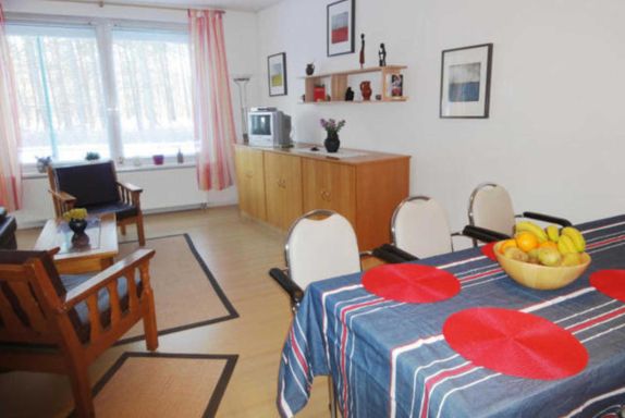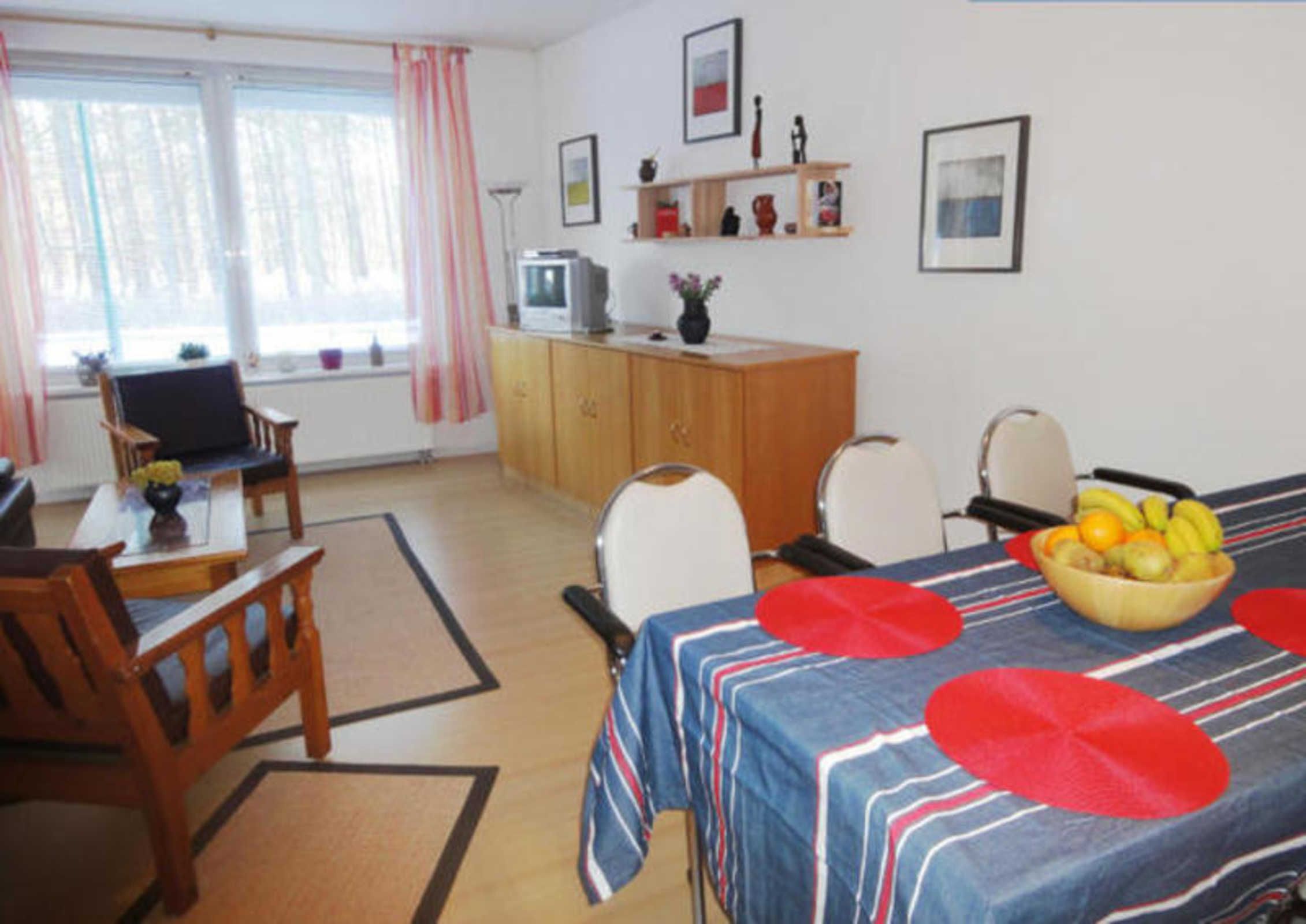 Ihre Ferienwohnung ist etwa 50 qm groß und für 2 bis 3 Personen geeignet. Das gemütliche Wohnzimmer mit großem Fenster ist mit einer Couch, 2 Sesseln sowie einem Fernseher und einem Radio ausgestattet.