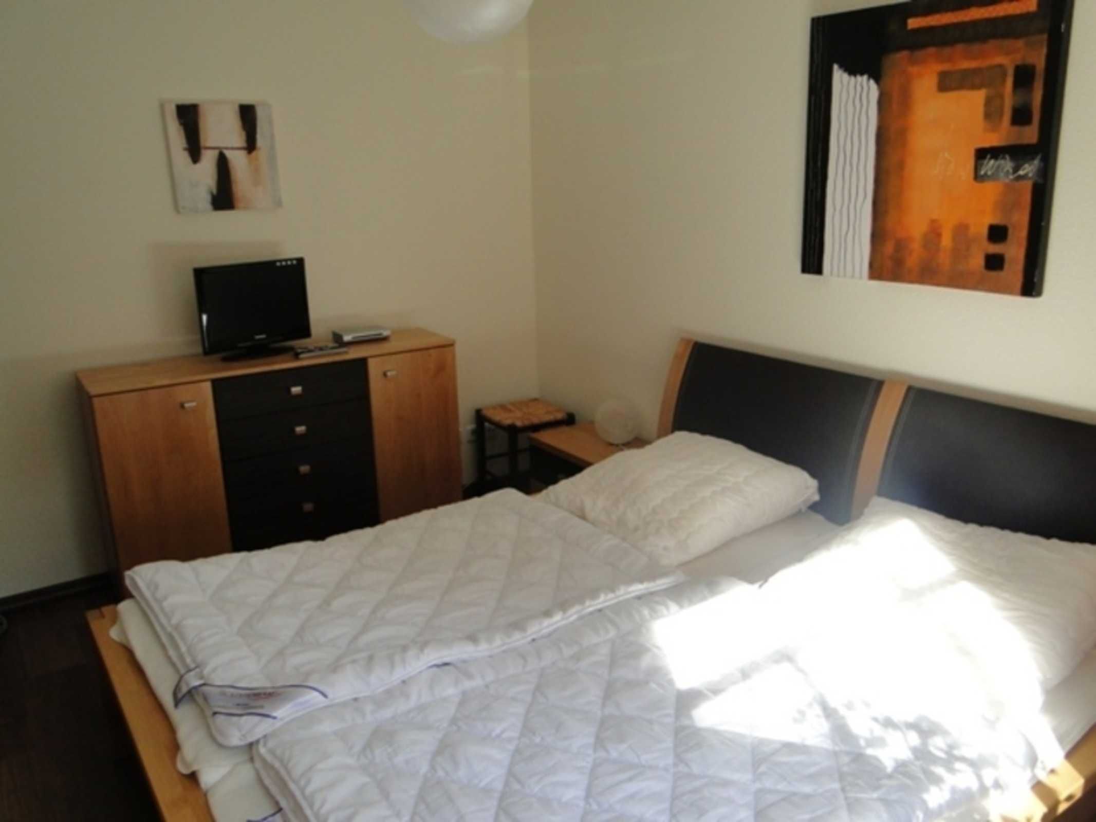 Ein geräumiger Kleiderschrank mit Bügeln und eine Kommode sorgen im Schlafzimmer dafür, dass Sie Ihre Garderobe immer aufgeräumt vorfinden, wenn Sie morgens im bequemen Doppelbett erwachen. Hier gibt es auch einen modernen Flachbildschirm.