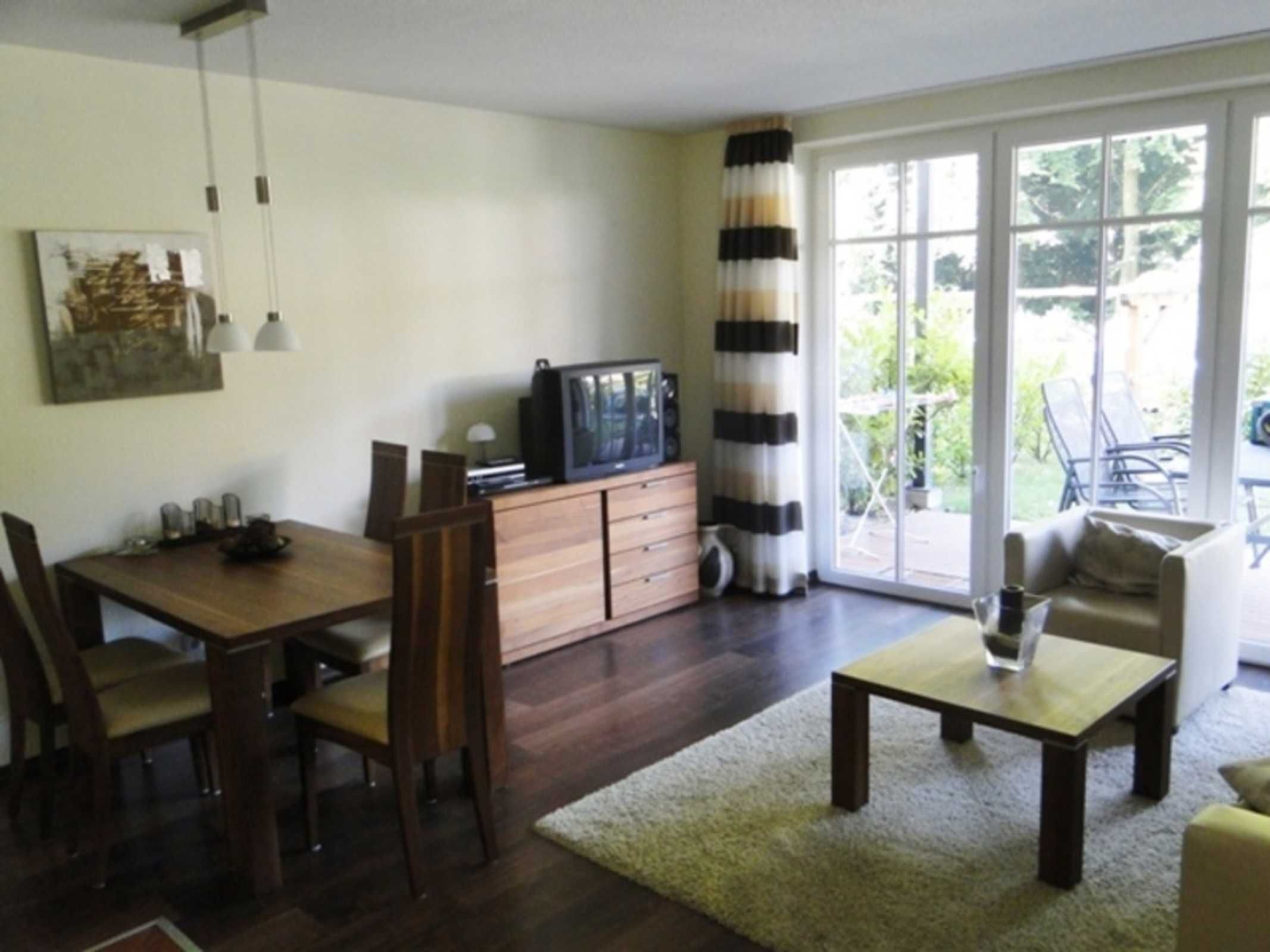 Im Wohnzimmer erwarten Sie eine Ledercouch, LCD Fernseher, Sat-Anlage, Stereoanlage, DVD-Recorder mit diversen DVDs und ein Esstisch mit Stühlen für 6 Personen. Von hier aus gelangen Sie auf die Terrasse mit den Gartenmöbeln.