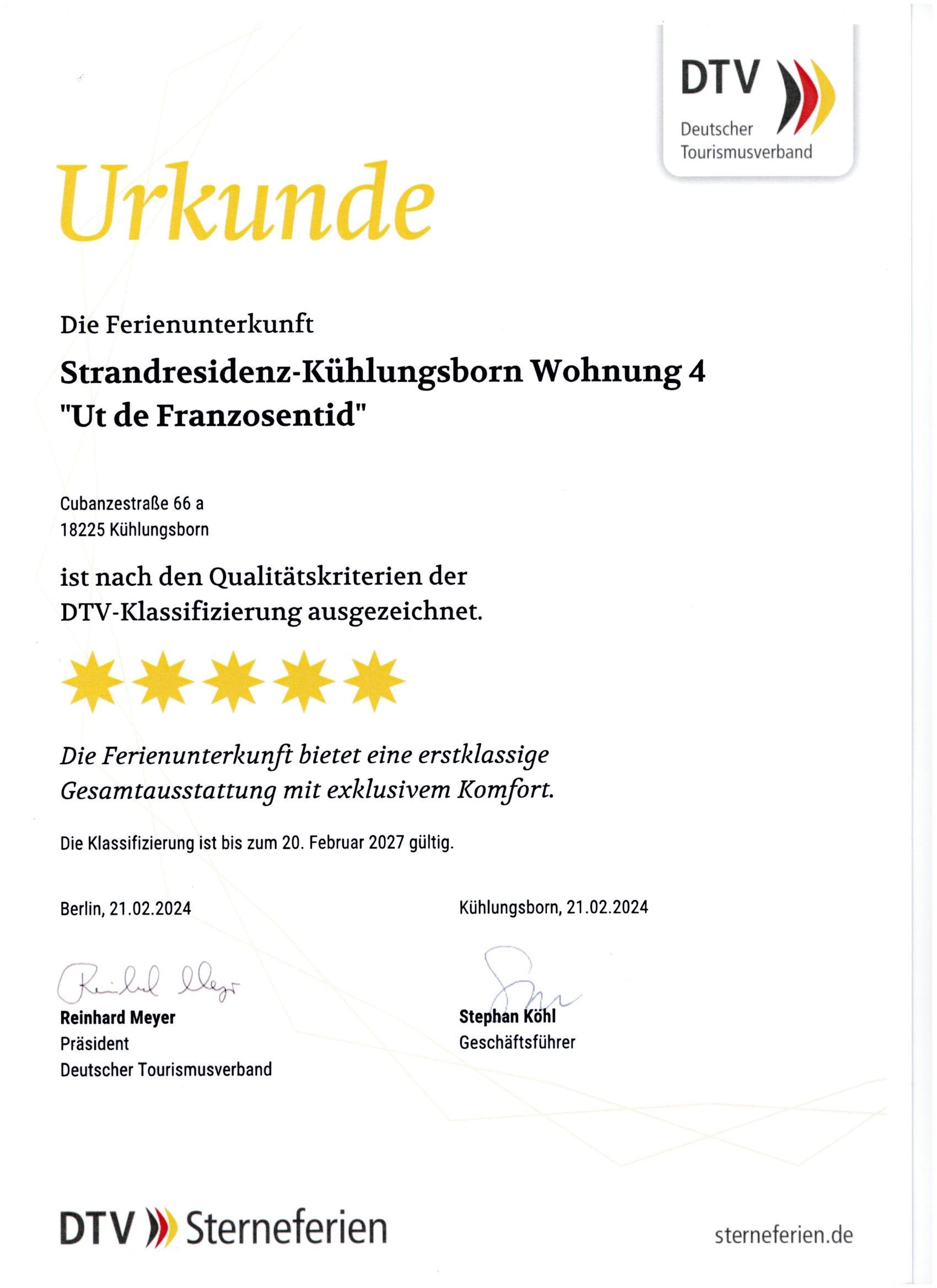 Die 7 Wohnungen gehören zu den Flaggschiffen der vom DTV zertifizierten deutschen Ferienwohnungen mit 1.216 bis zu 1.331 vergebenen Punkten. 5 Sterne gibt es ab 900 Punkte.