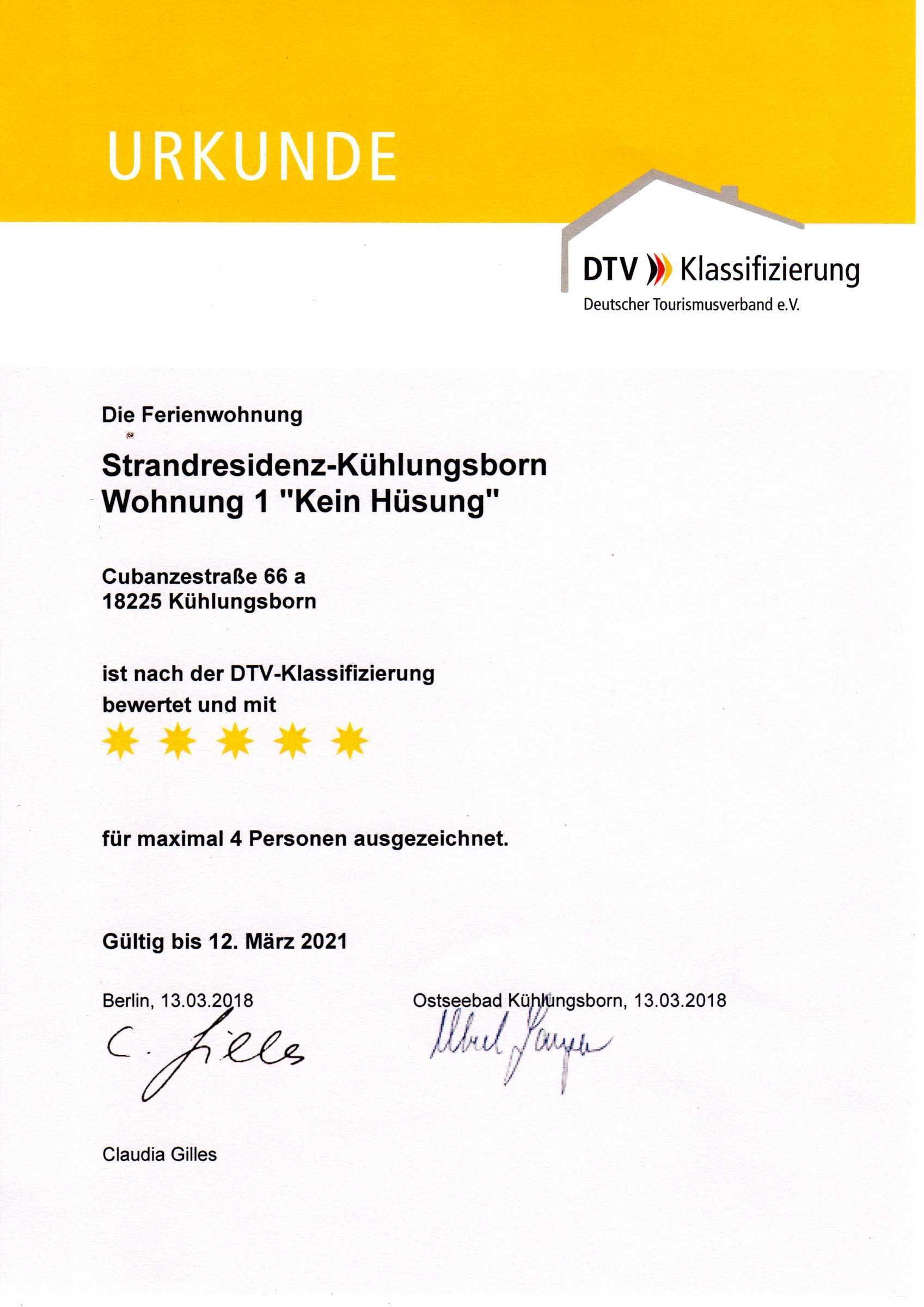 Die 7 Wohnungen gehören zu den Flaggschiffen der vom DTV zertifizierten deutschen Ferienwohnungen mit 1.216 bis zu 1.331 vergebenen Punkten. 5 Sterne gibt es ab 900 Punkte.