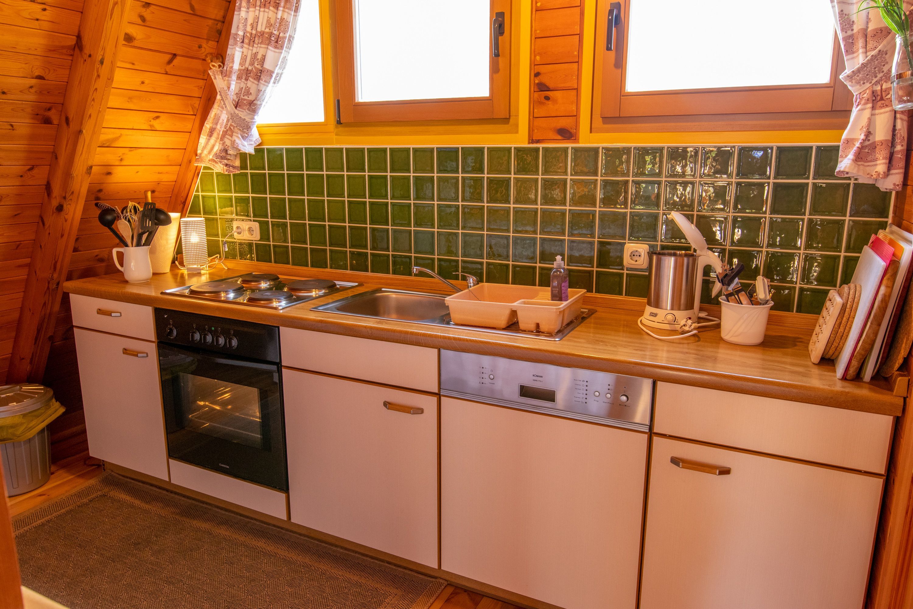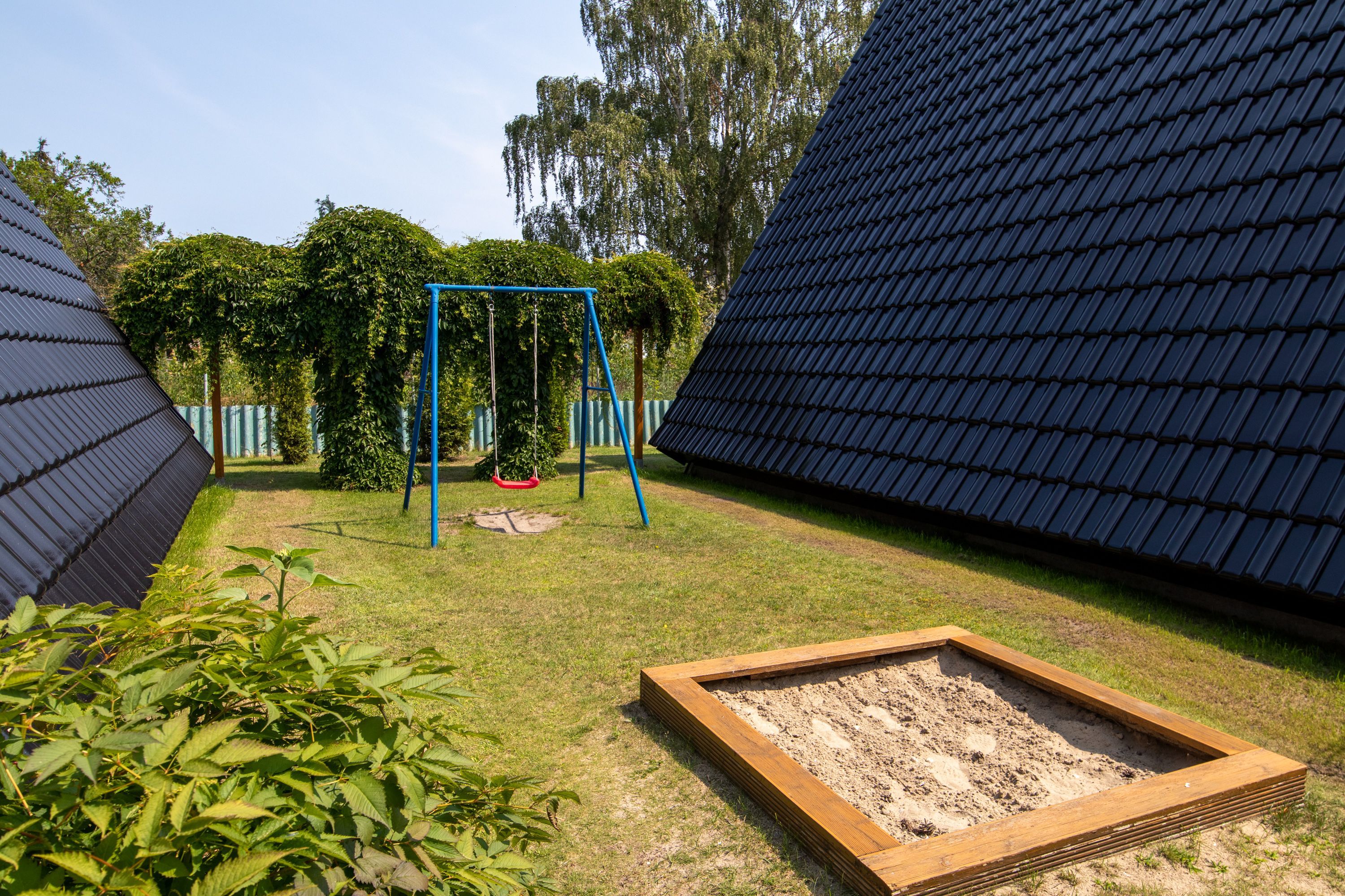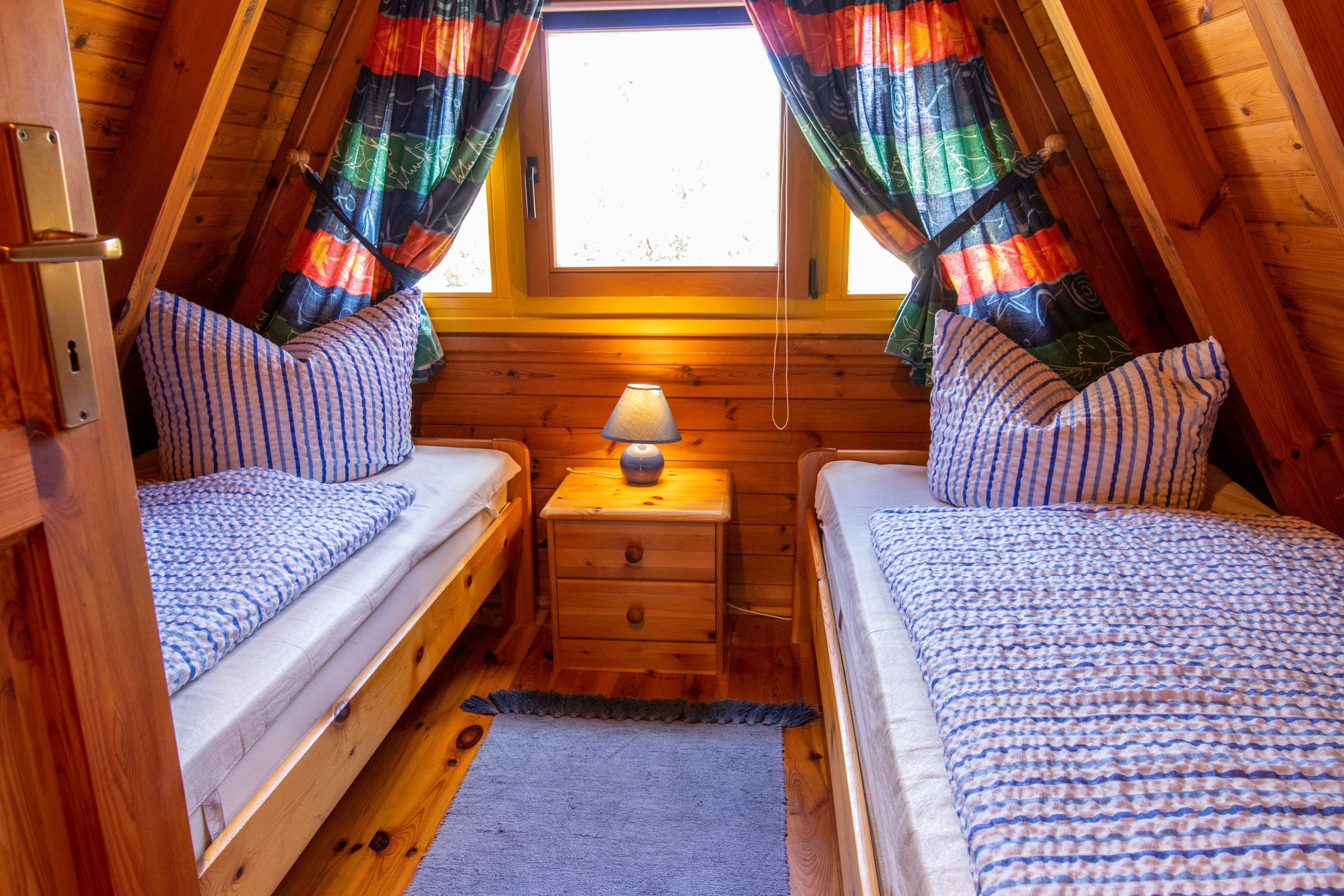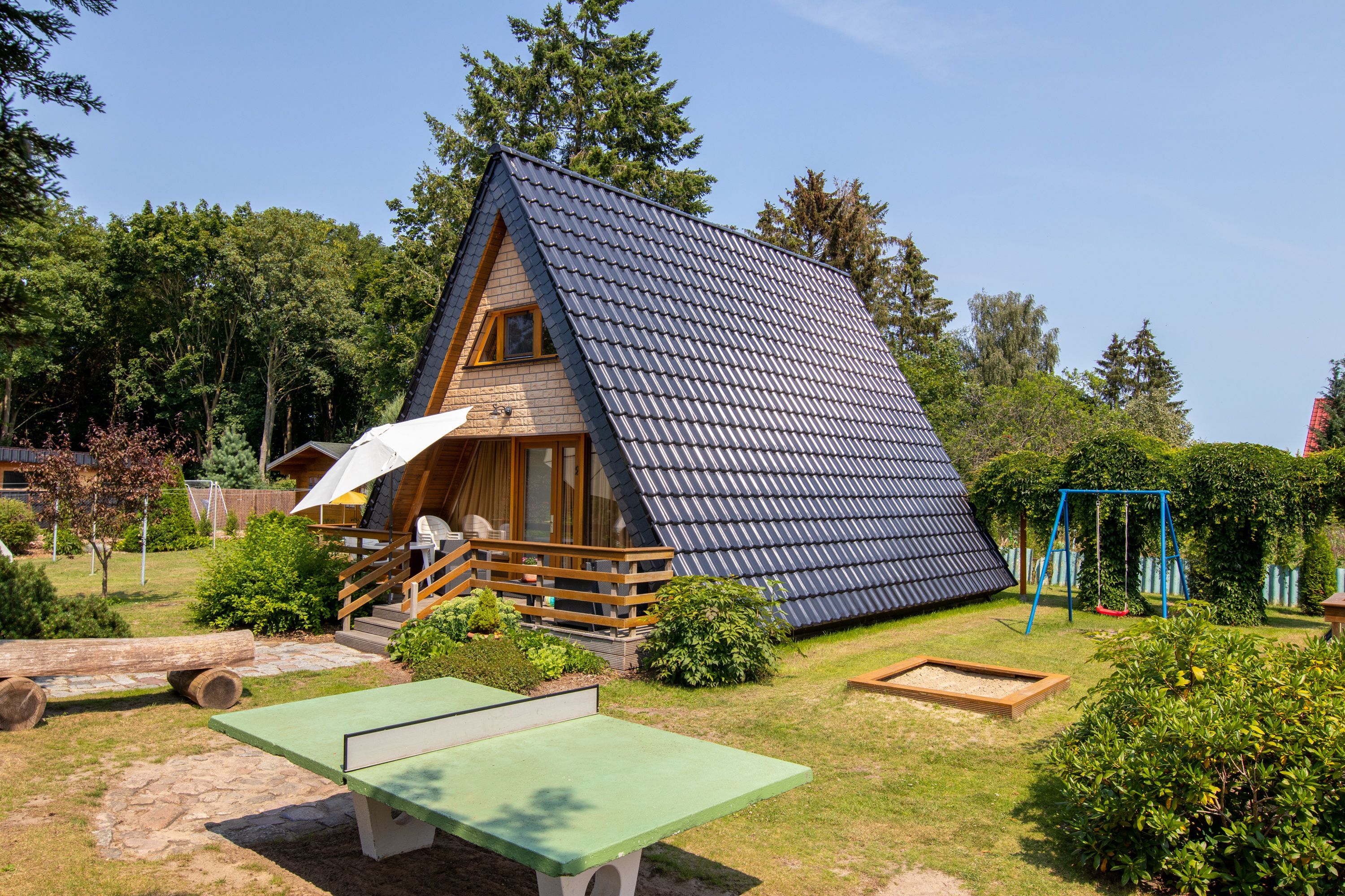 Im Erdgeschoss findest du ein geräumiges Wohnzimmer mit TV, einer gemütlichen Sitzecke und einem Esstisch. Die angrenzende offene Küche ist vollständig ausgestattet, inklusive Kühlschrank, Geschirrspüler und Kaffeemaschine. Außerdem gibt es im Erdgeschoss ein Badezimmer mit Dusche, WC und einer Waschmaschine. Über eine  Raumspartreppe gelangst du ins Obergeschoss, wo sich zwei Schlafzimmer mit insgesamt 5 Einzelbetten (90x200) befinden. Jede unserer 70 m² großen Finnhütten verfügt über eine eigene Terrasse und einen Grillplatz. Zudem stehen eine Tischtennisplatte, ein Sandkasten und eine Schaukel für Kinder zur gemeinsamen Nutzung bereit.