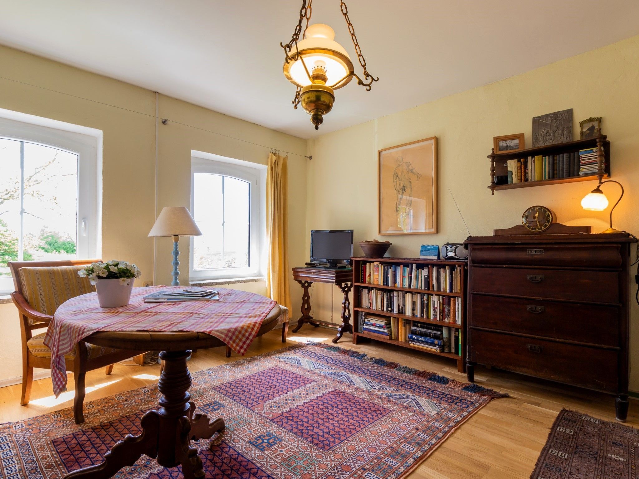 • Wohnzimmer mit Kaminofen, Sitzgruppe, Lesesessel und Fernseher