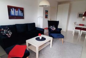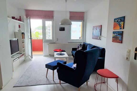 Die helle und moderne 2-Raum-Ferienwohnung bietet Platz für 2 Personen. Sie befindet sich in der 3.Etage, in einem ruhigen, mehrstöckigen Haus mit Aufzug in ruhiger Lage. Das Wohnzimmer ist mit Flat-TV, DVD/CD-Player, und Doppelbettcouch ausgestattet. Von hier aus gelangen Sie auf den großen Balkon mit Süd/Ost Ausrichtung. Das Schlafzimmer erwartet Sie mit einem gemütlichen Doppelbett und einem Kleiderschrank. Die separate, voll ausgestattete Einbauküche ist mit diversen Küchenkleingeräten, wie z.B. Kaffeemaschine, Wasserkocher und Mikrowelle sowie Elektroherd und Kühlschrank mit Tiefkühlfach ausgestattet. Das Badezimmer verfügt über Dusche, WC, Waschbecken und Fön.