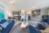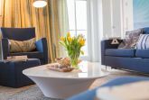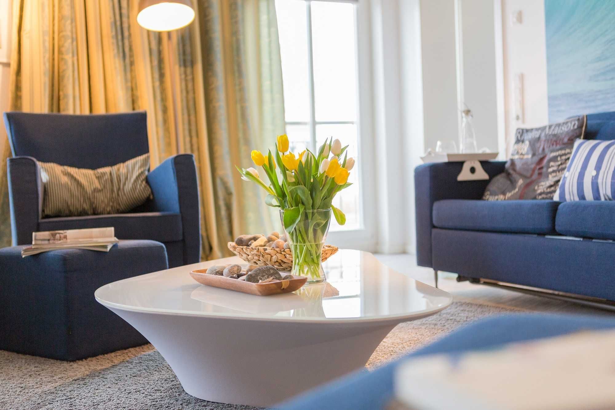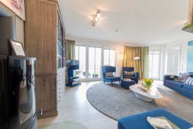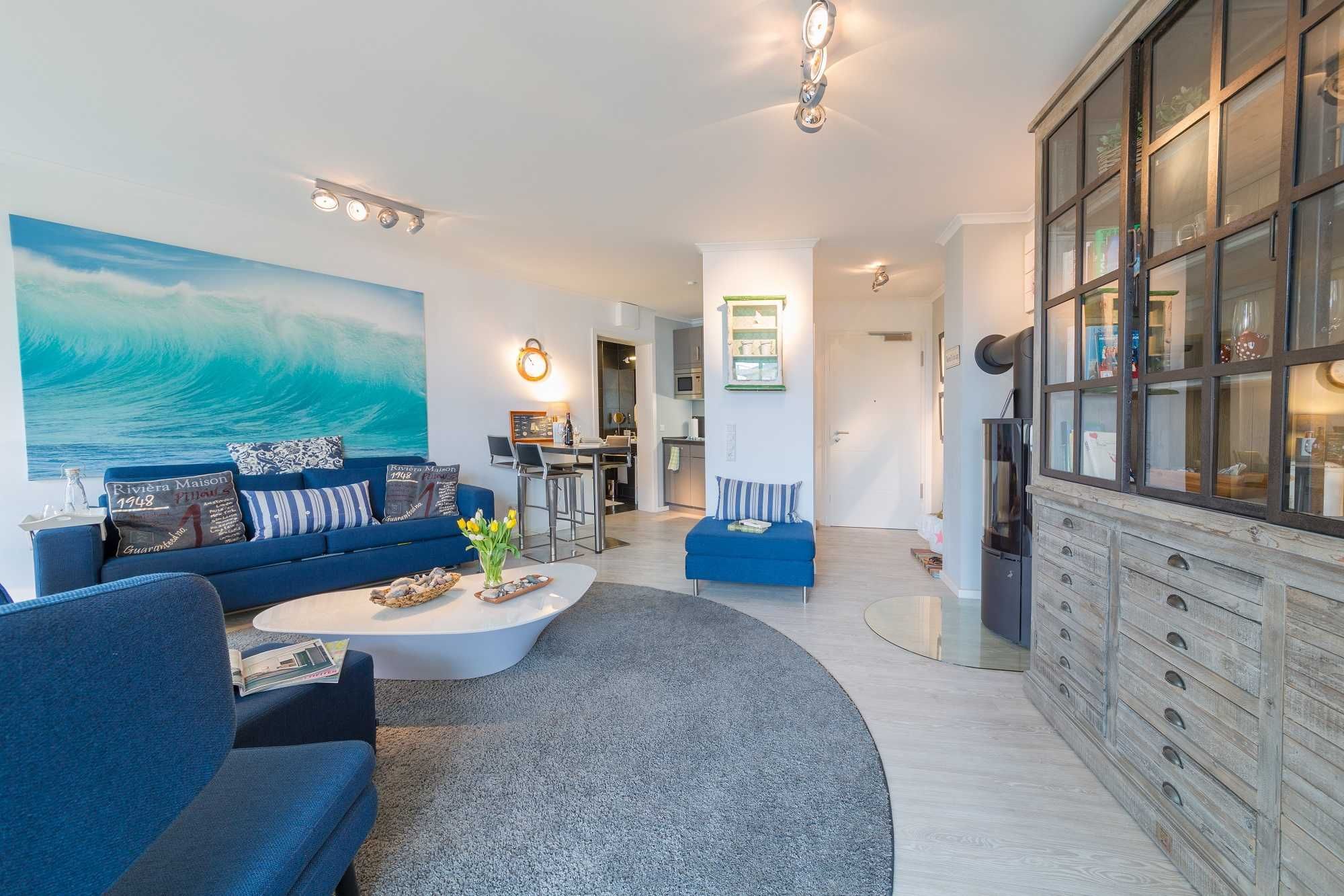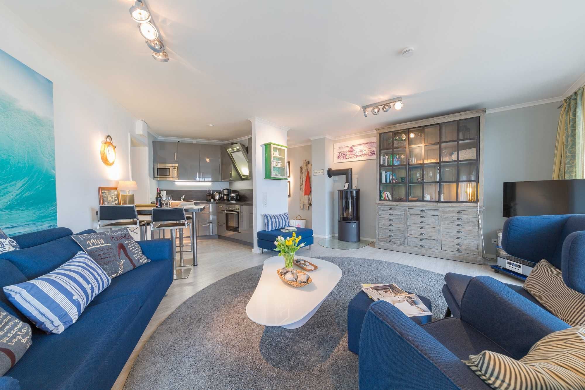 Das maritim eingerichtete Wohnzimmer verfügt über einen HD-Flatscreen-TV, einen Blu-ray/CD-Player sowie eine Bluetooth-Radioanlage. Zwei hochwertige Ohrensessel sowie ein mit wenigen Handgriffen aufklappbares Schlafsofa laden zum Kuscheln ein. Ein Kaminofen sorgt an kühleren Abenden für gemütliche Wärme (Kaminholz muss selbst organisiert werden.)