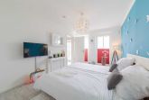 Das Schlafzimmer ist mit hochwertigen Möbeln von HÜLSTA ausgestattet. Das Doppelbett mit Qualitätsmatratzen sichert höchsten Schlafkomfort. Auch im Schlafzimmer steht ein HD-TV-Gerät zur Verfügung.
