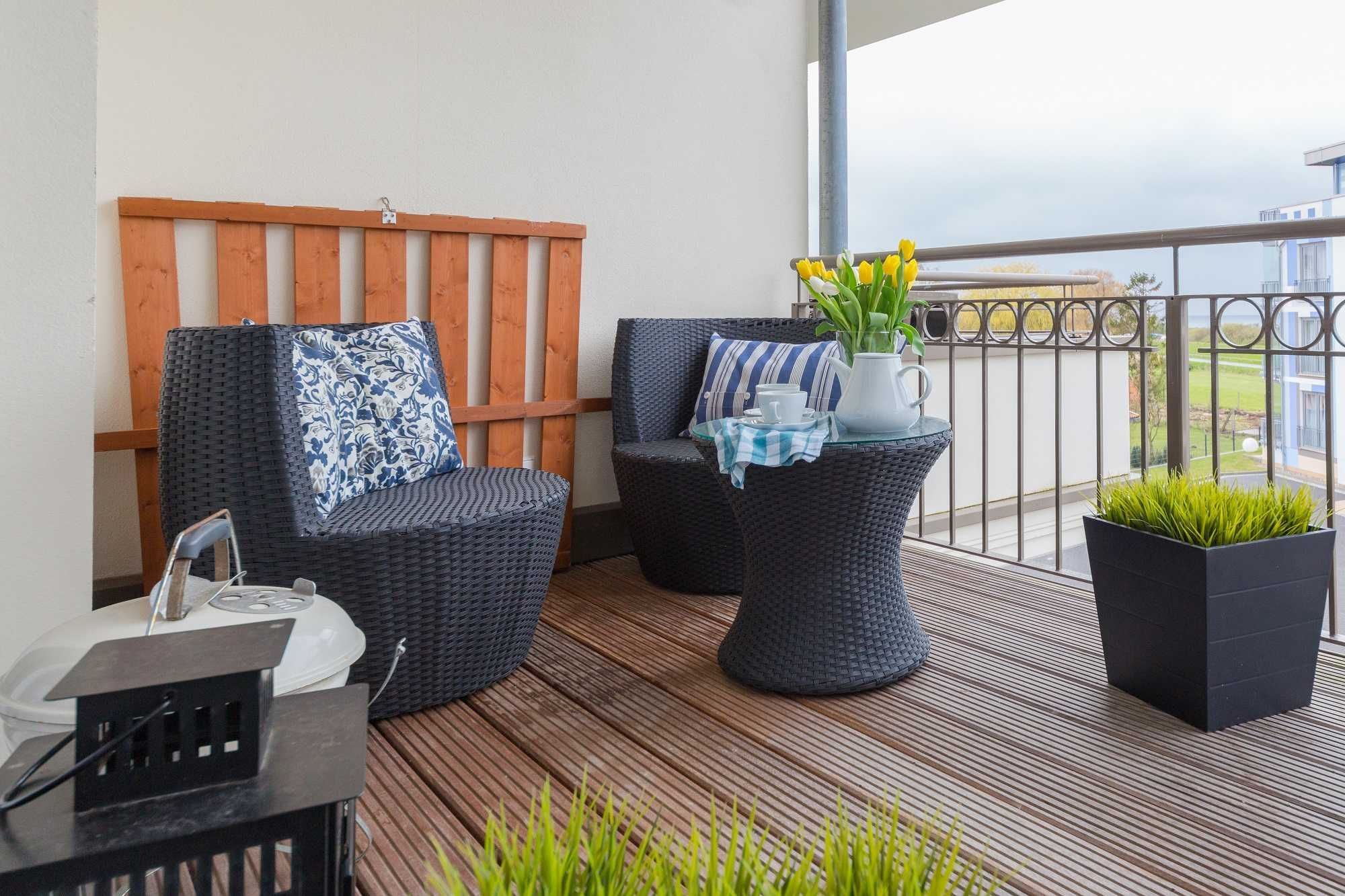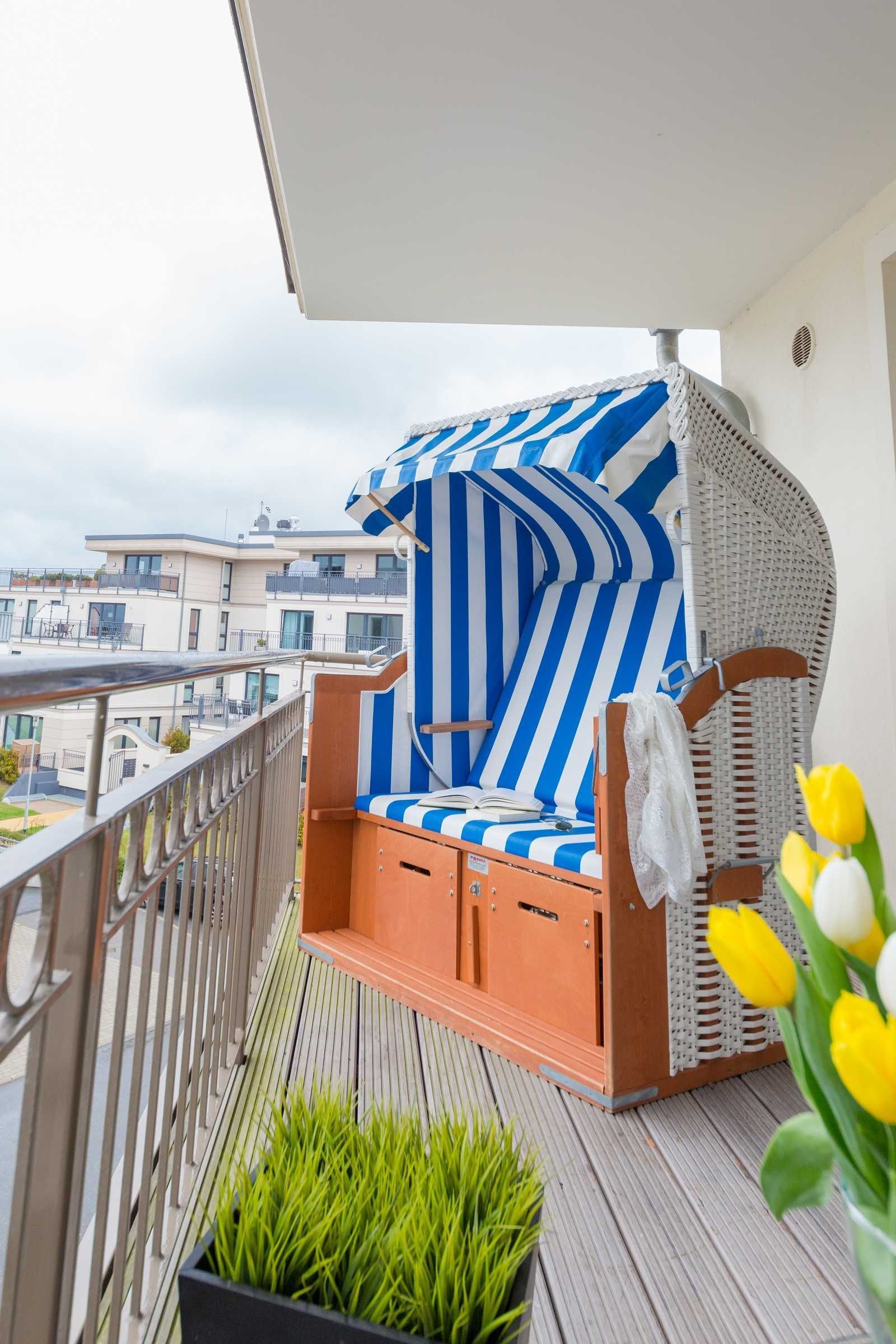 Der herrliche Balkon in Nord-Westausrichtung mit Blick auf die Ostsee ist mit einer kleinen Rattan-Sitzecke sowie einem Strandkorb ausgestattet. Bei Windlichtern und Kerzen kann man den Tag entspannt ausklingen lassen.